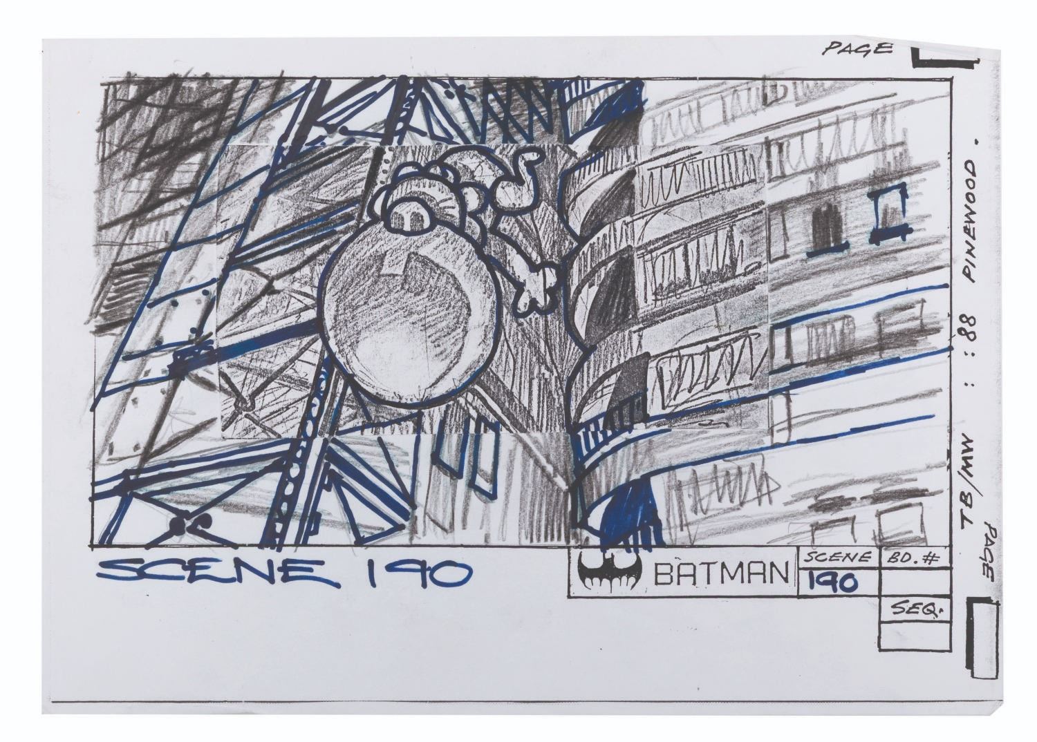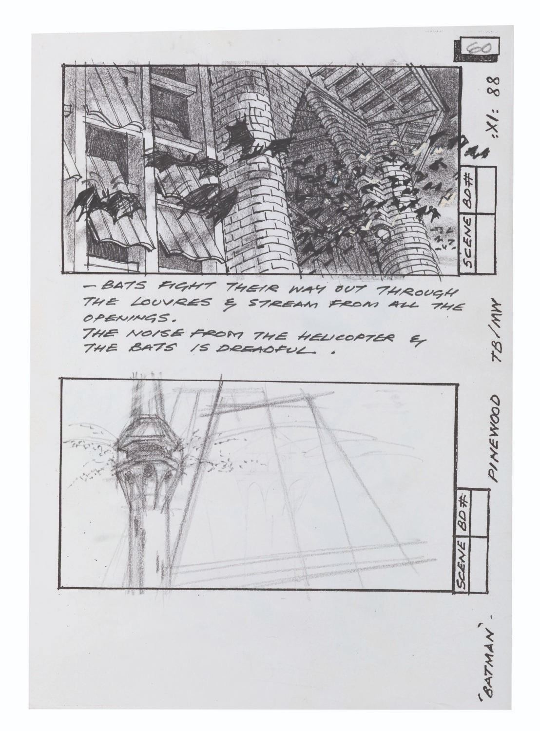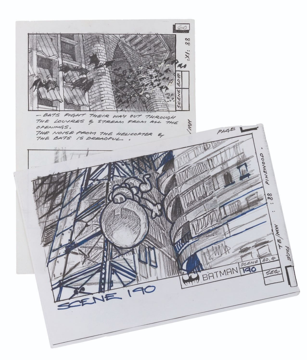 (Warner Bros., 1989) A pair of storyboard pages used during the production of Tim Burton's "Batman, " starring Michael Keaton and Jack Nicholson. Accomplished in ink, pencil, and marker over photocopied outlines, the storyboards include a giant baby balloon from Gotham's Bicentennial Parade and a colony of bats bursting through windows. Measuring 8.25 " x 11.75 " each, the sheets are in very good condition with light handling wear and pinholes from production use.