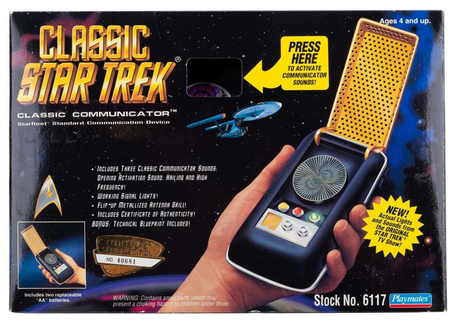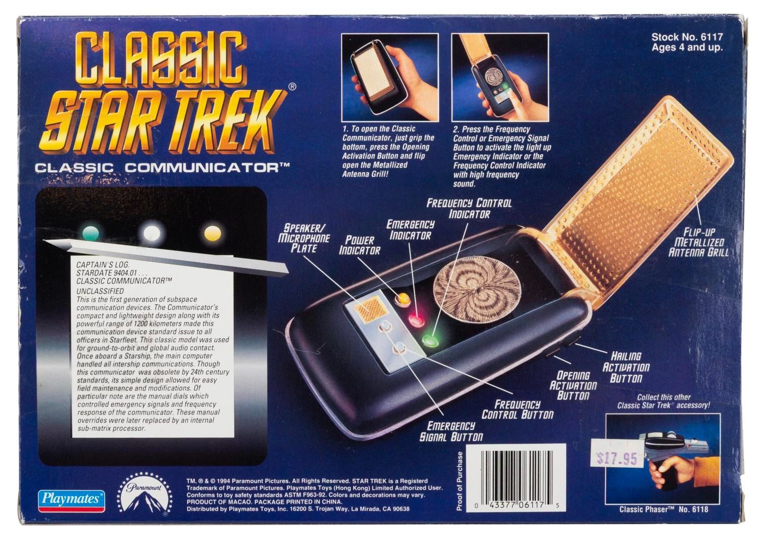 (Playmates, 1994) A "Star Trek " Original Series Communicator toy with box. The communicator uses two "AA " batteries to play sounds from the original "Star Trek " series, and still works when the demo buttons are pressed. Measuring 2.5 " x 3.75 ", the communicator is in good condition with light handling wear, while the box exhibits scuffing, edge wear, and creases.