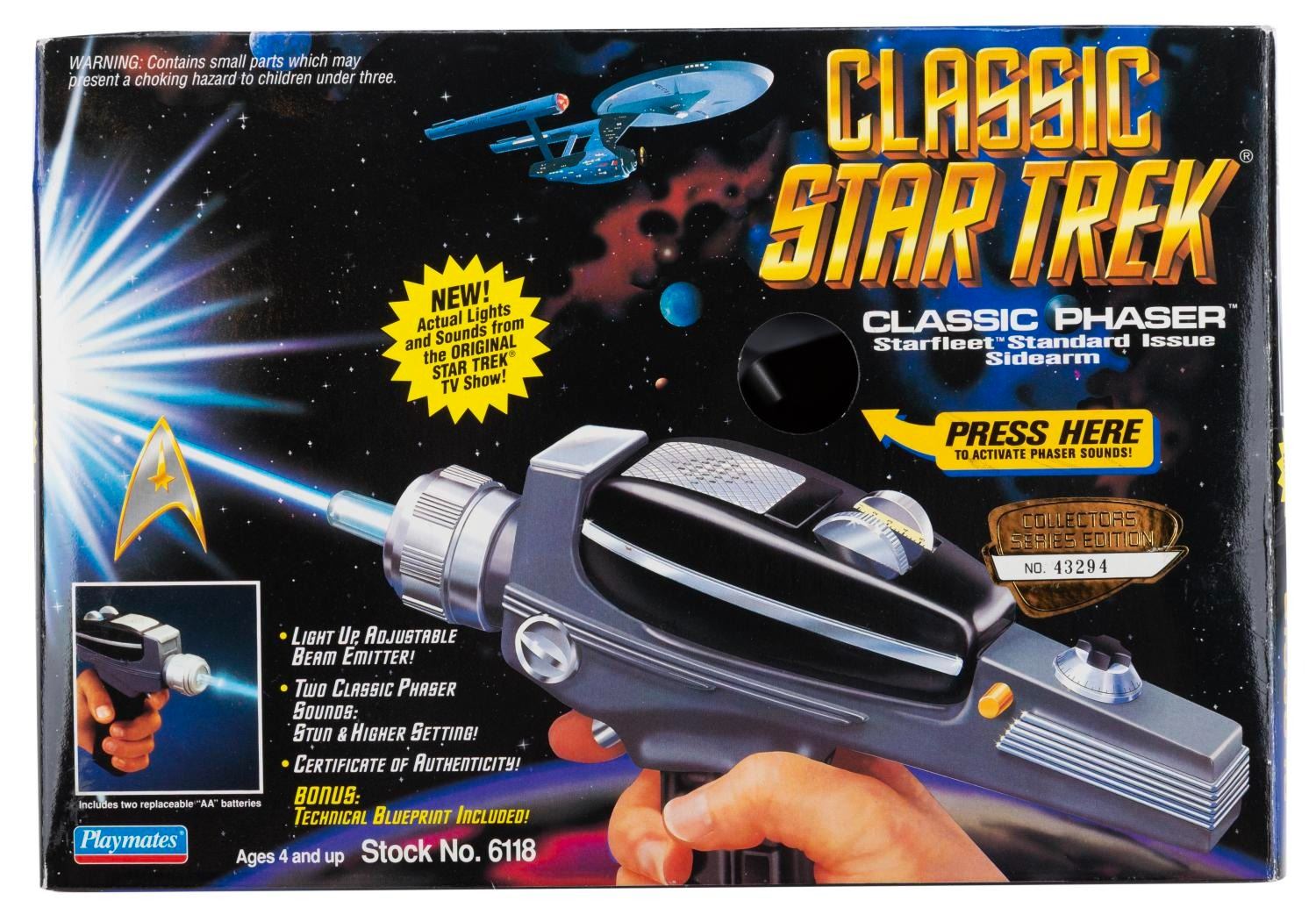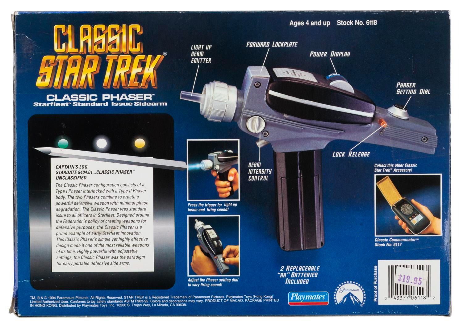 (Playmates, 1994) A "Star Trek " Original Series Phaser toy with box. The Phaser uses two "AA " batteries to play sounds from the original "Star Trek " series and has not been tested and may require service to operate. Measuring 5 " x 8.25 ", the phaser is in phaser condition. The box exhibits light scuffing, edge wear, and creases.