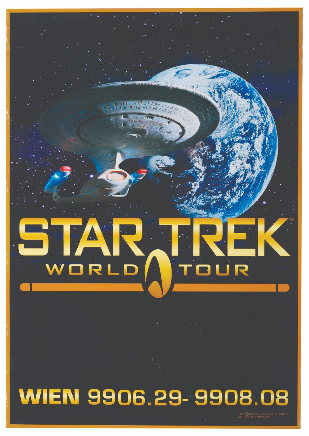 (Special Entertainment Events, 1999) A rare poster for the Star Trek World Tour in Vienna. The traveling museum exhibit of props, costumes, and set pieces from the shows and movies opened in Vienna from June 29 to August 8, 1999. Measuring 23.25 " x 33 ", the poster displays in good condition with edge wear, handling wear, and small creases, including thin vertical white marks throughout.