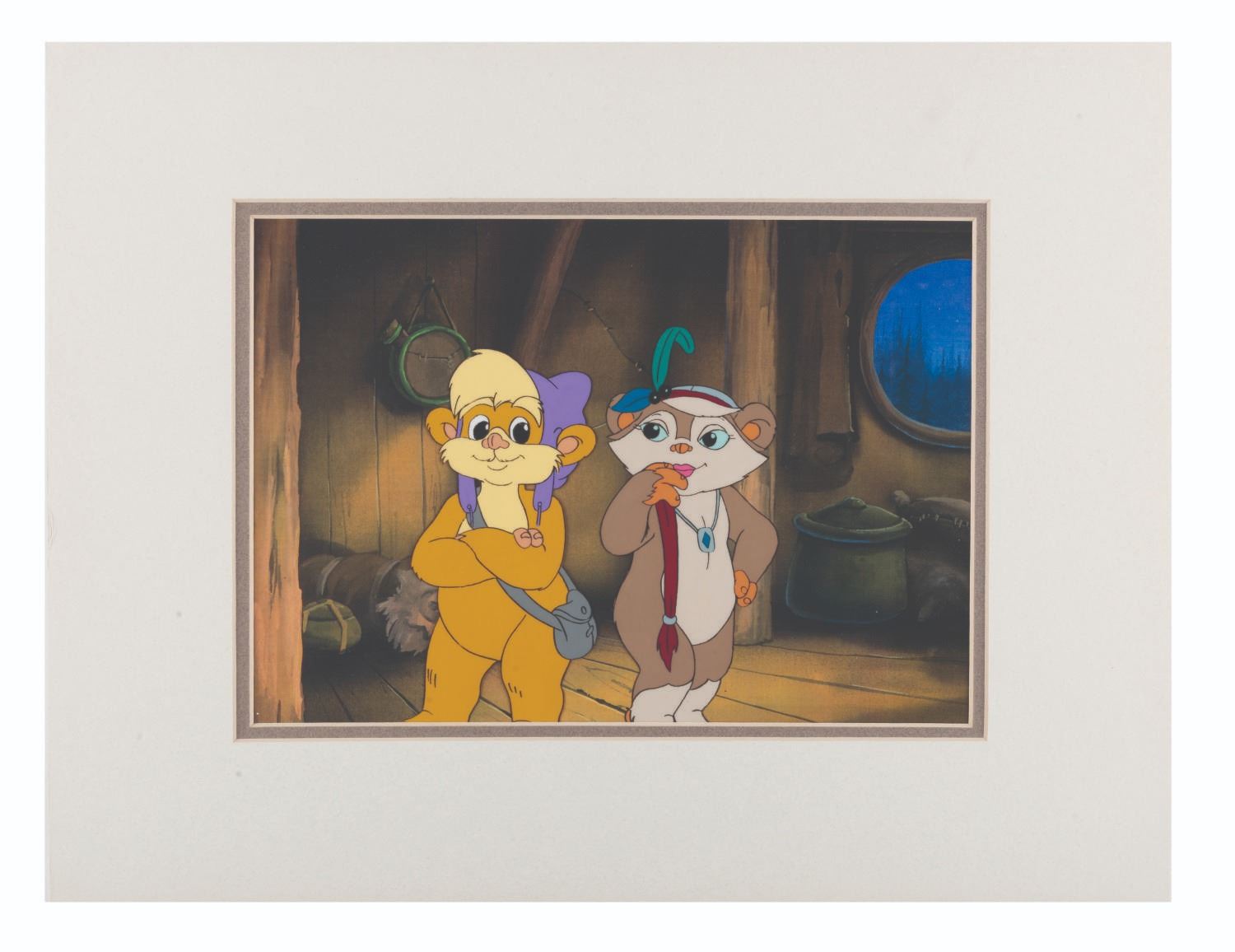 (Lucasfilm Ltd., 1985-86) An original production cel of Teebo and Latara from the Star Wars spin-off series "Ewoks. " The Ewoks have an image size of 6 " x 6.25 " on an 8 " x 11.5 " visible cel. The entire matted piece measures 14 " x 18 " and is in very good condition with light wear from production use and edge wear to the matte.