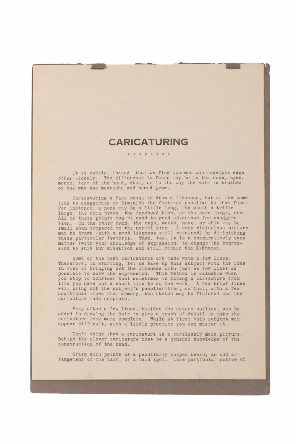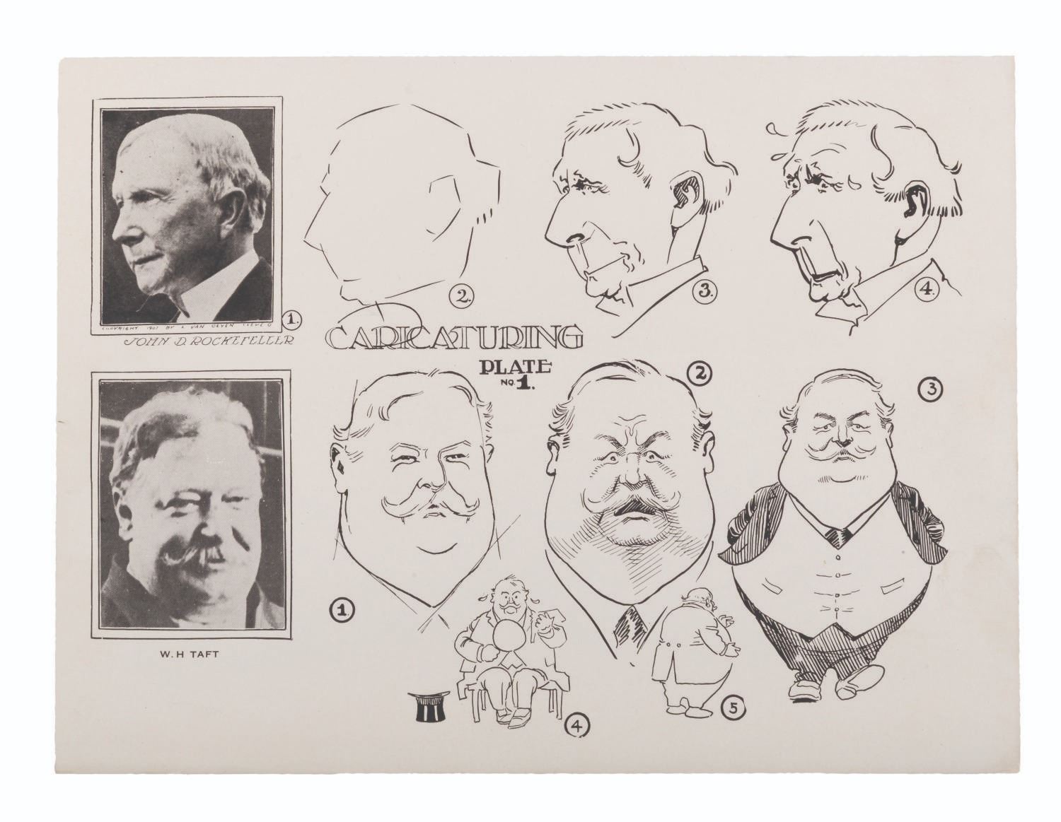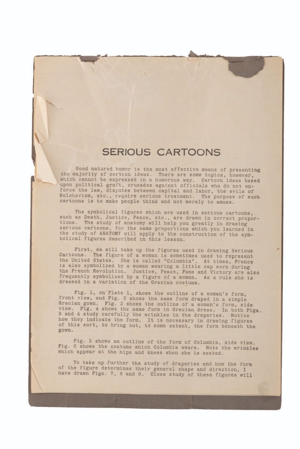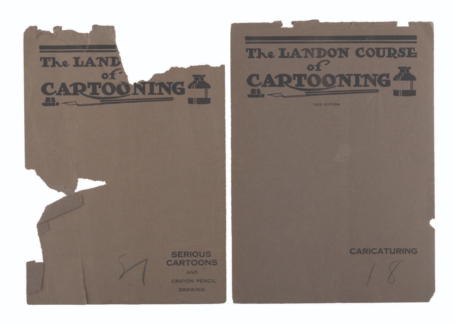 (Landon, 1922) A collection of two books titled "The Landon Course of Cartooning, " one on Caricaturing and the other on Serious Cartoons. Each book includes five loose illustration plates, with an extra set of five plates on drawing animals. Measuring up to 8.5 " x 11.5 ", the books are in good and fair condition, with heavy wear and tear to the Serious Cartoons book including large pieces of the cover torn or missing. The plates are in good condition.
