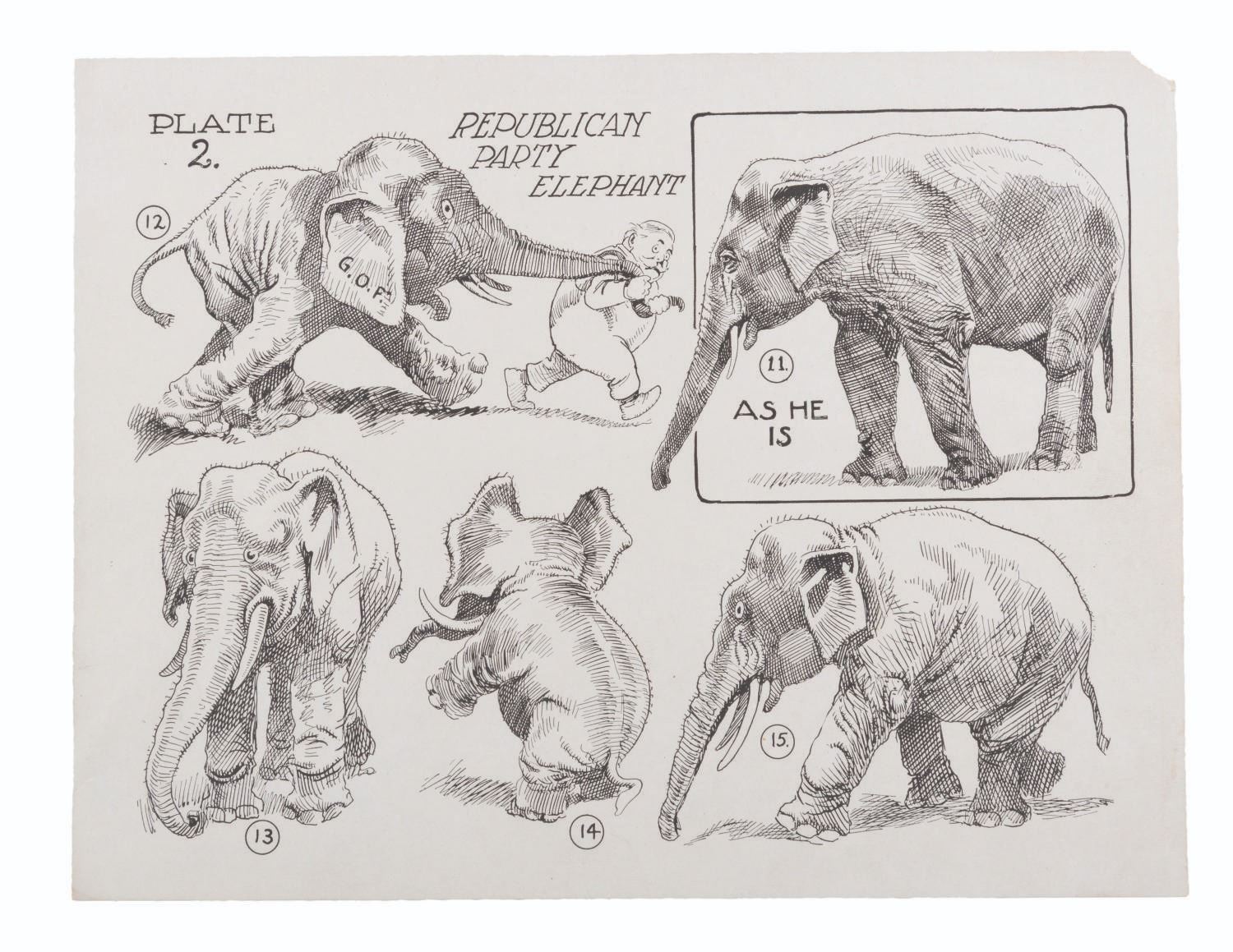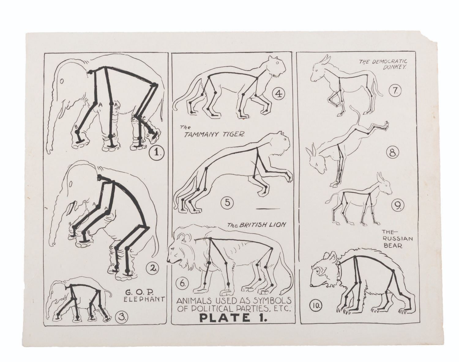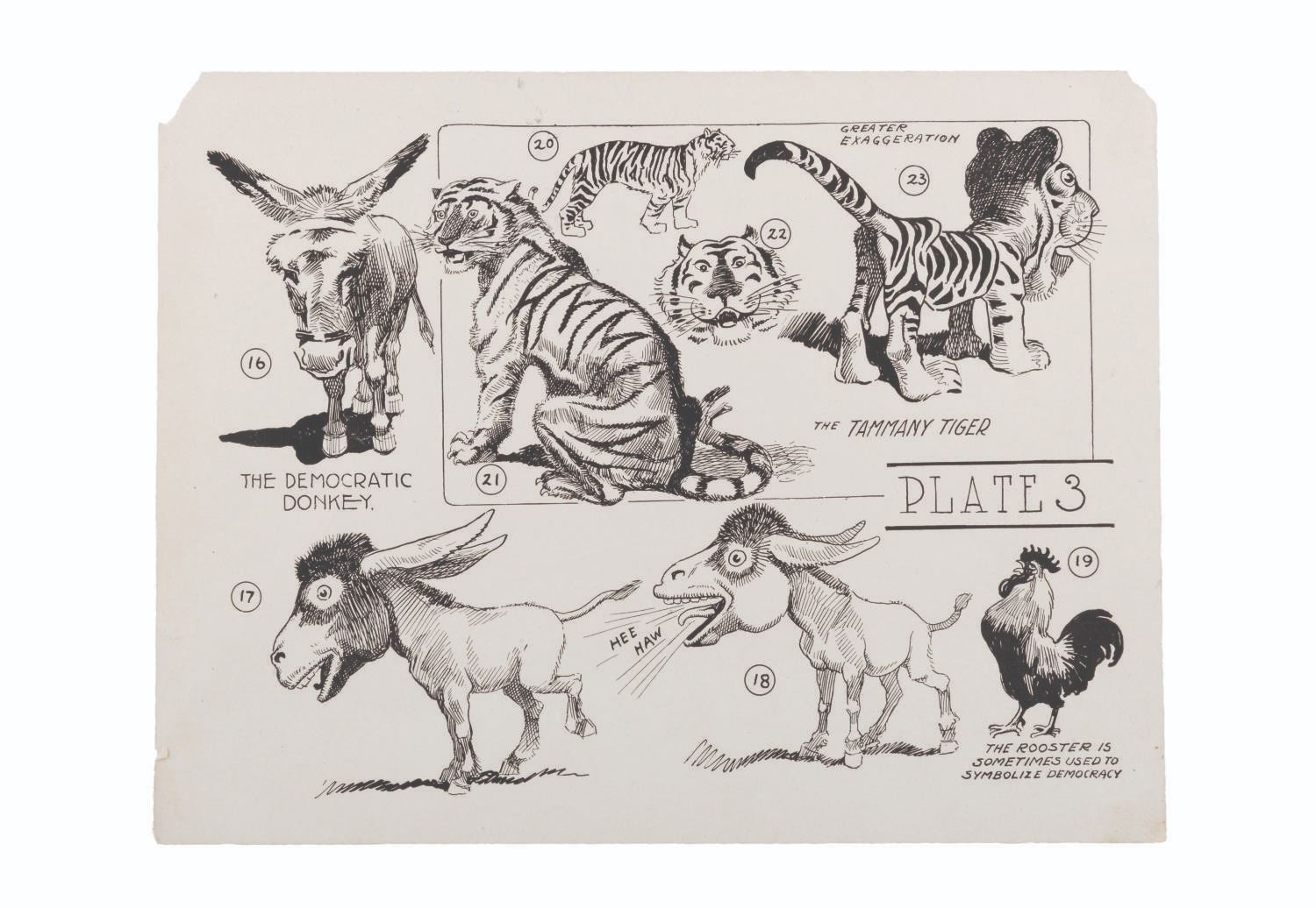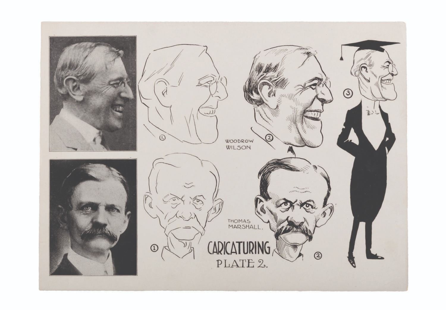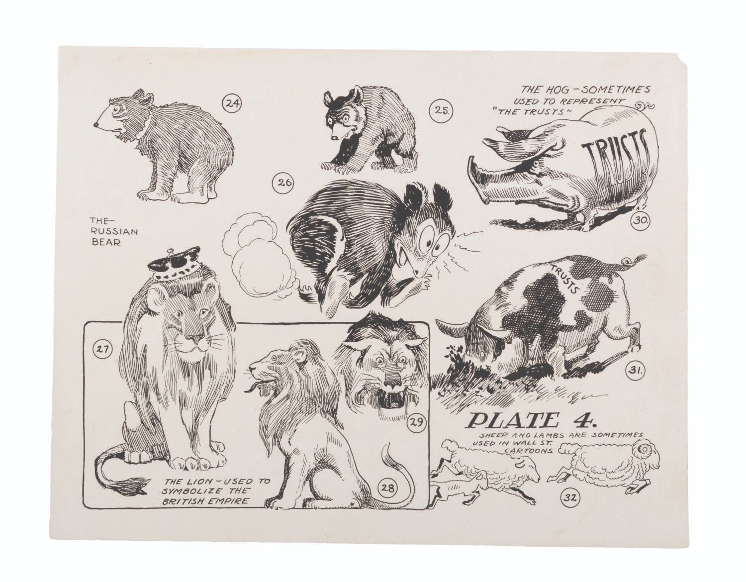 (Landon, 1922) A collection of two books titled "The Landon Course of Cartooning, " one on Caricaturing and the other on Serious Cartoons. Each book includes five loose illustration plates, with an extra set of five plates on drawing animals. Measuring up to 8.5 " x 11.5 ", the books are in good and fair condition, with heavy wear and tear to the Serious Cartoons book including large pieces of the cover torn or missing. The plates are in good condition.