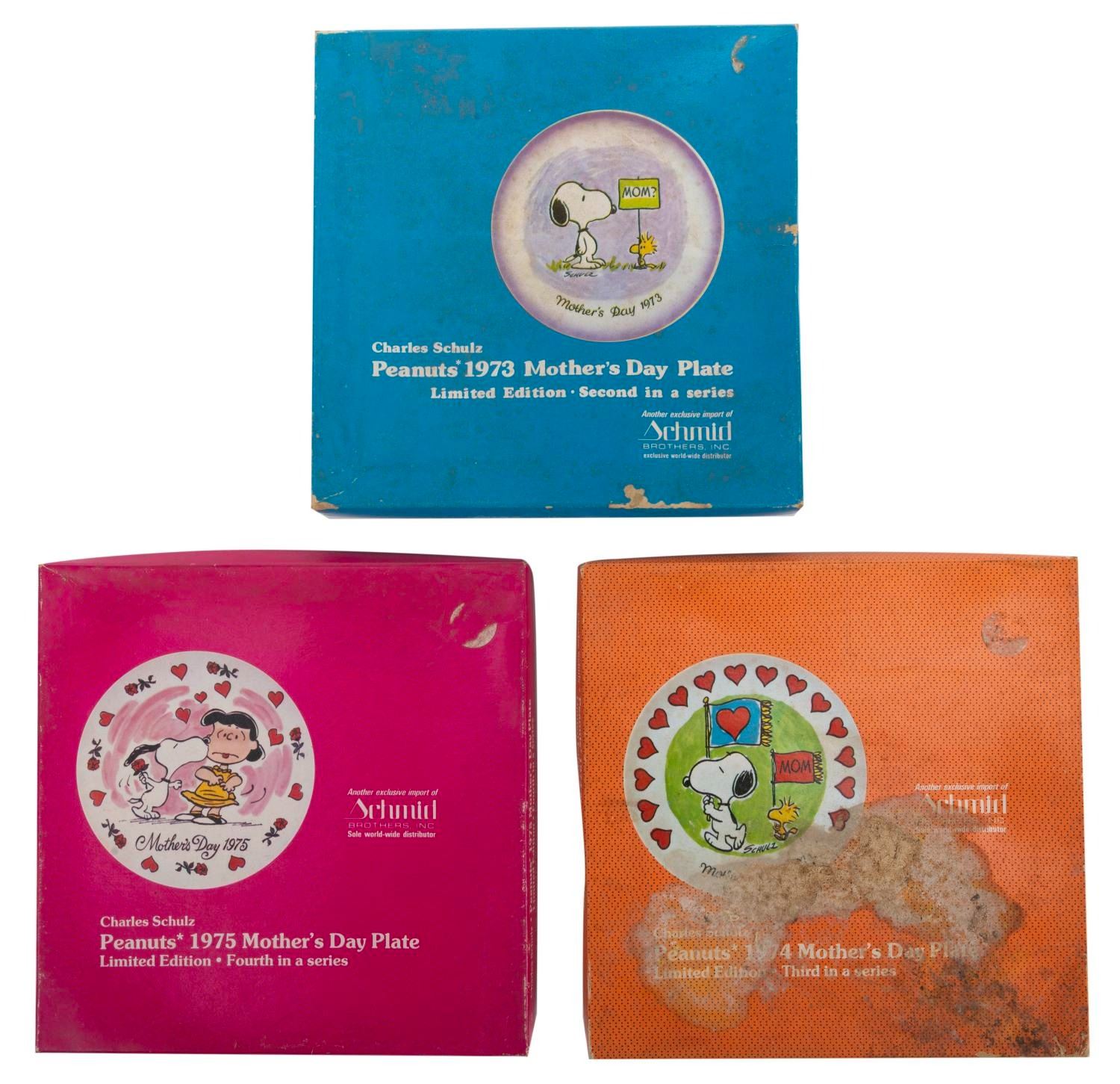 (Schmid, 1973-75) Three Peanuts decorative plates celebrating Mother's Day 1973, 1974, and 1975, and featuring Snoopy, Woodstock, and Lucy. Each measuring 7.5 " in diameter, the plates are in fine condition. The original boxes are in fair condition, with the 1974 box in poor condition with damage to the lid.