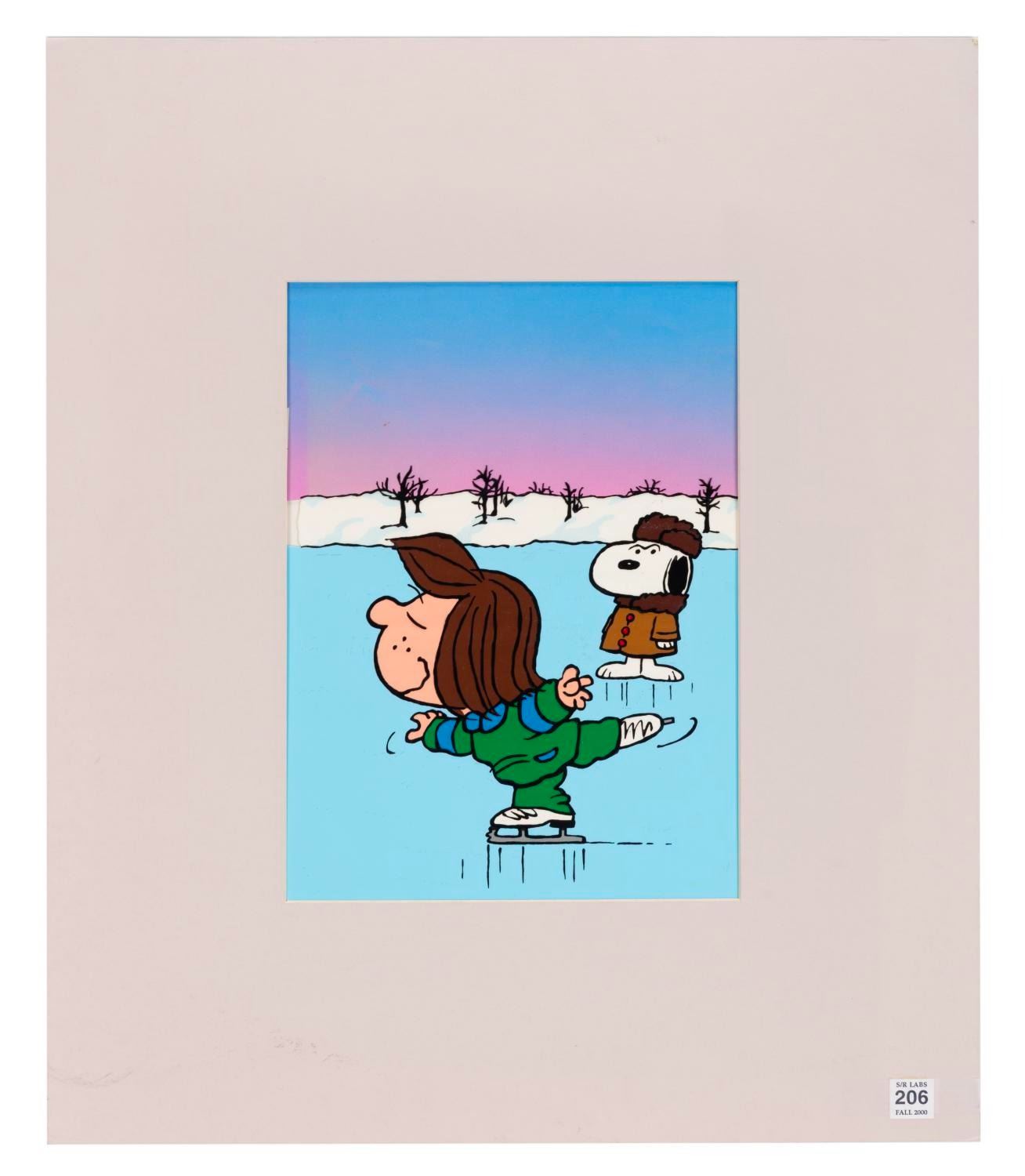 (United Features Syndicate, 1980) A hand-painted publicity cel and background for "She’s A Good Skate, Charlie Brown, " featuring Peppermint Patty and Snoopy. Peppermint and Snoopy measure 6.75 " x 8 " on a 14 " x 17 " cel. The entire matted piece measures 19.5 " x 23 " and displays in very good production-used condition with light scuffs, soiling, and fading.