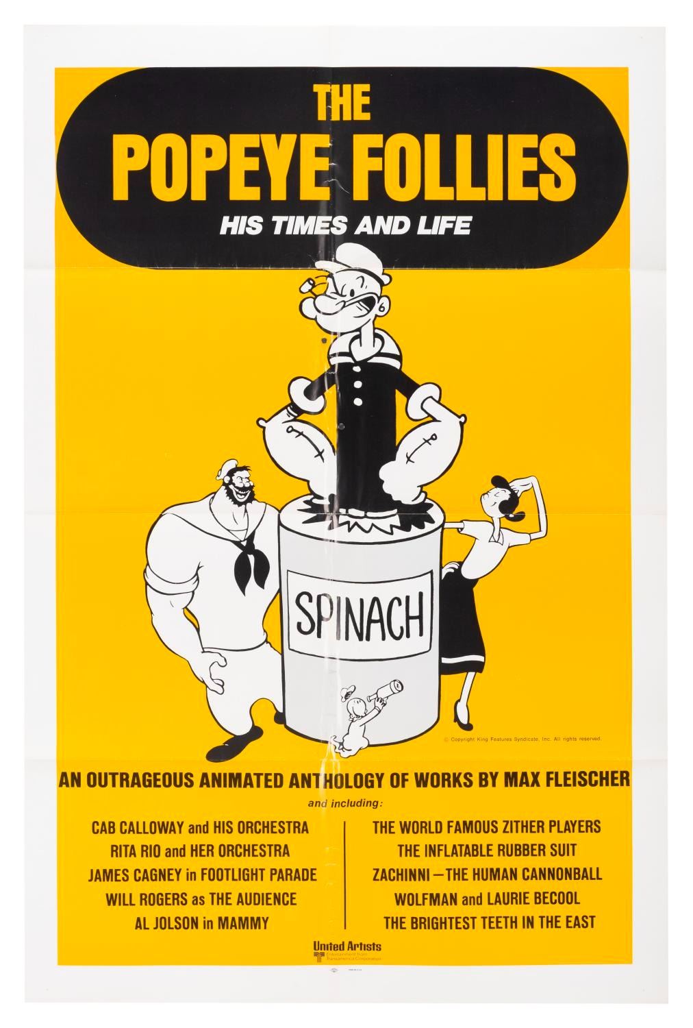 (United Artists, 1973) A one-sheet for "The Popeye Follies: His Times and Life, " a compilation of the Fleischer Studios-produced "Popeye " shorts. Measuring 27 " x 41 ", the poster is in good condition with creases, wear along the original folds, and 1 " of separation at the top center fold.
