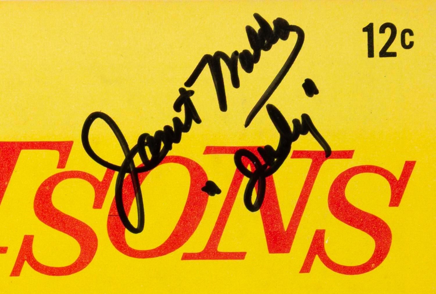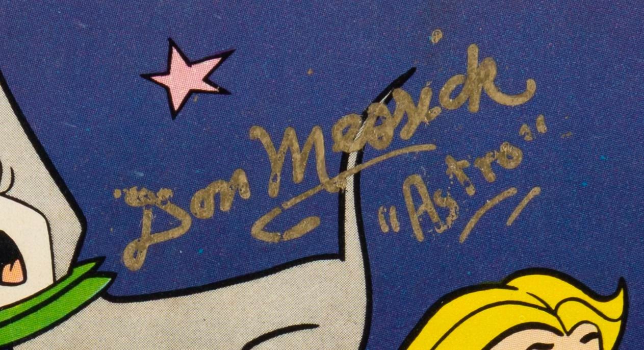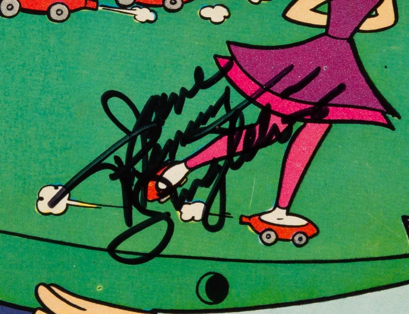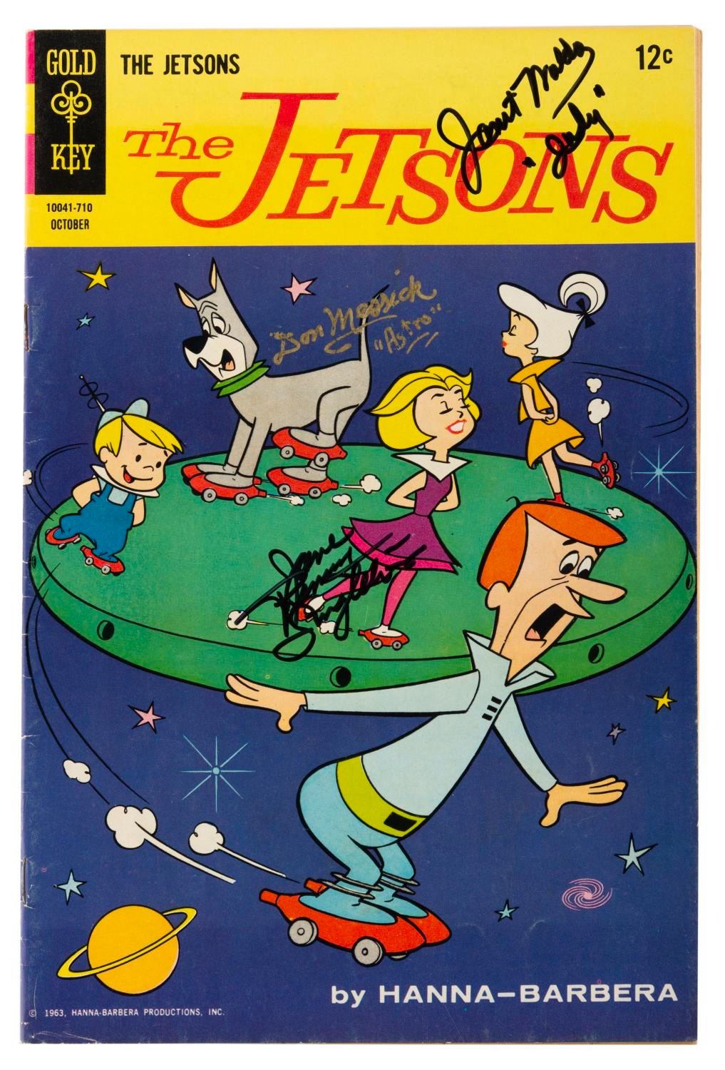 (Gold Key, 1967) Issue 24 of The Jetsons comic book, dated October 1967 and double-signed by three members of the cast on the front and back. Autographs include Penny Singleton (Jane), Janet Waldo (Judy), and Don Messick (Astro). Measuring 6.75 " x 10.25 ", the comic book displays in very good condition with creases, wear, and discoloration from age.