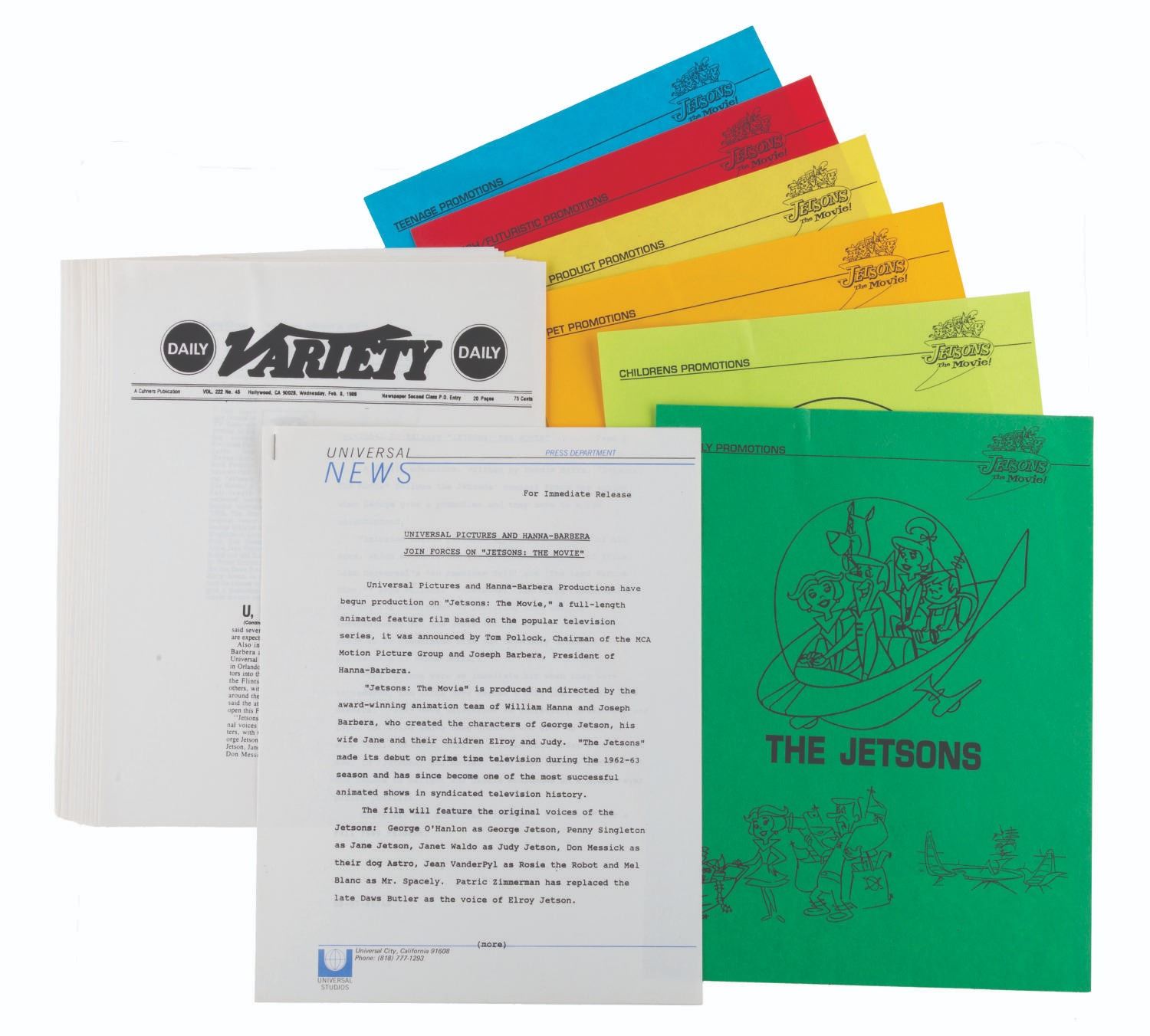 (Universal, 1989) A collection of 13 press releases and news articles for "Jetsons: The Movie. " Measuring 8.5 " x 11 " each, the paper items are in very good condition with light creases and wear.