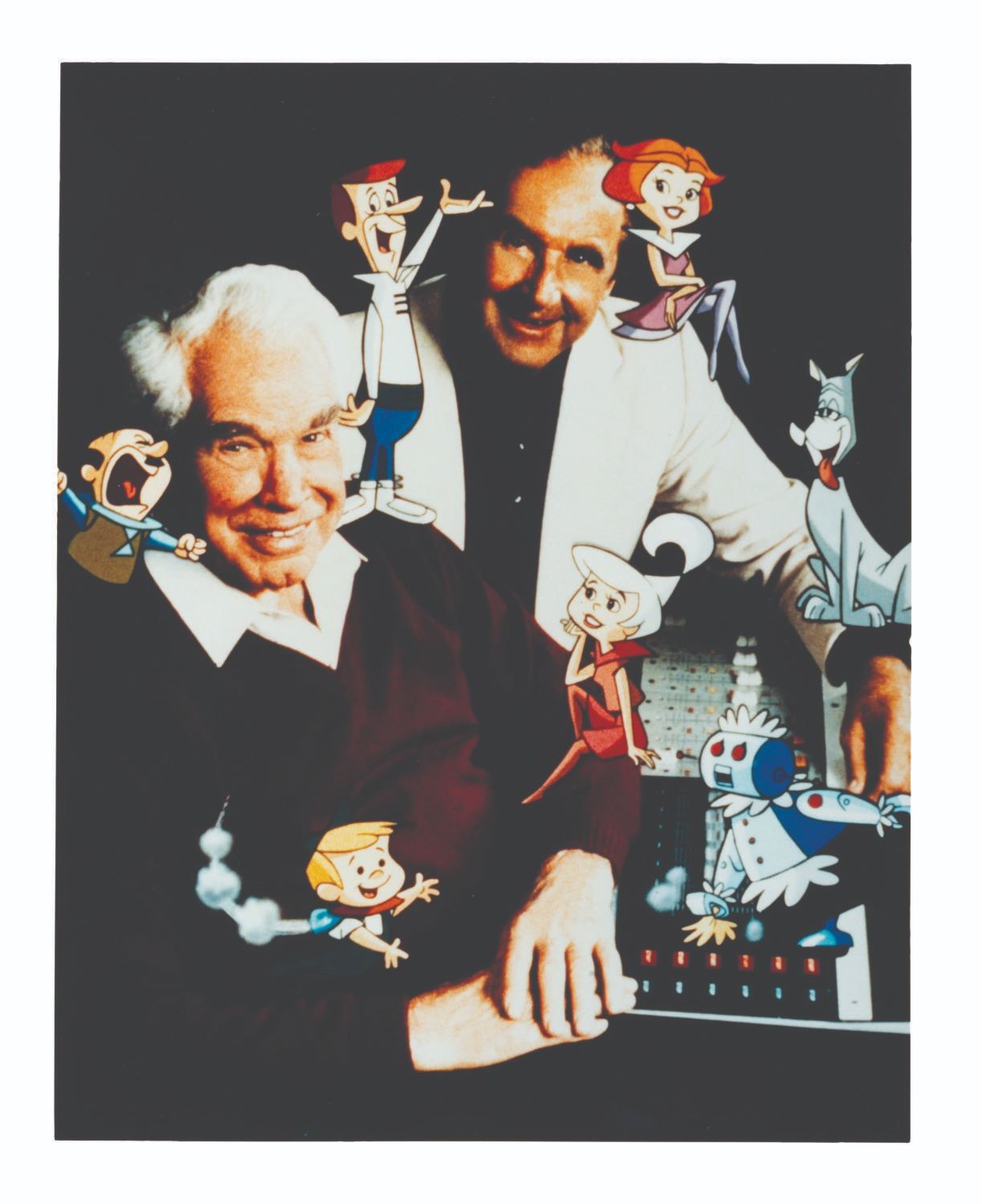 (Hanna-Barbera, 1980s) A photo of William Hanna and Joe Barbara with their futuristic family, "The Jetsons. " Measuring 8 " x 10 " the photo print is in very good condition.
