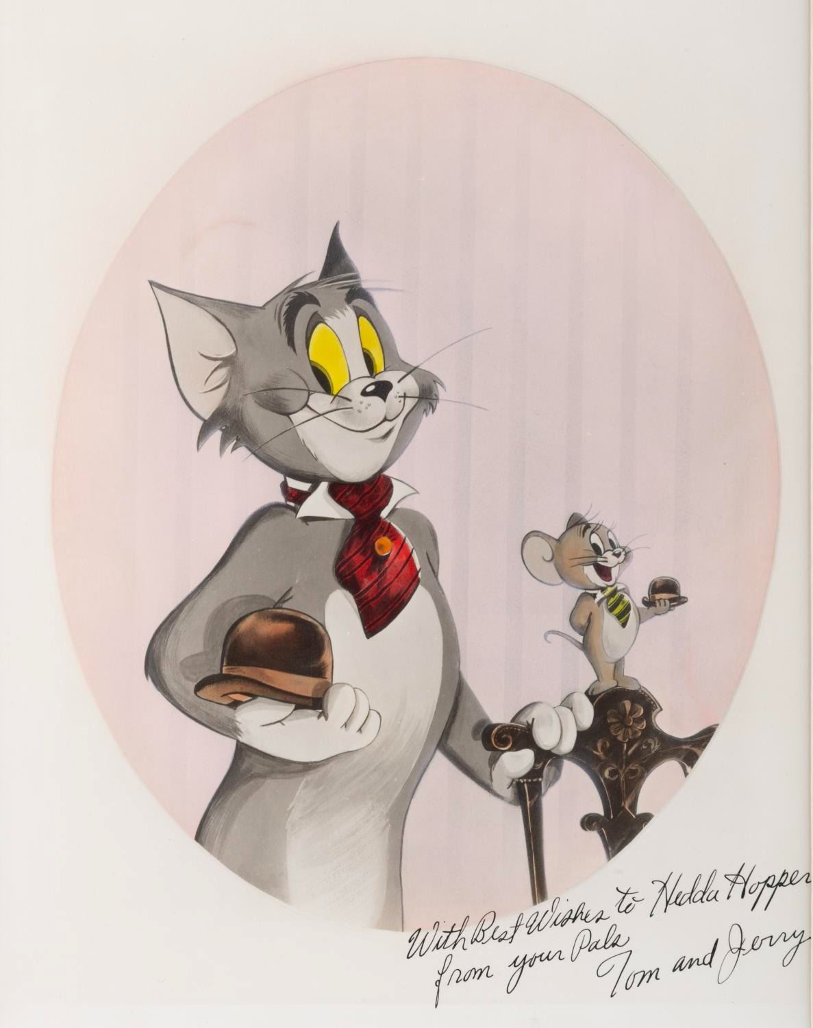 (MGM, 1960s) A fan card of Tom and Jerry, addressed to Hollywood gossip columnist Hedda Hopper. The print features very fine hand-painted accents. Measuring 8 " x 10 " in an 11 " x 14 " matte, the fan card is in very good condition with light wear.