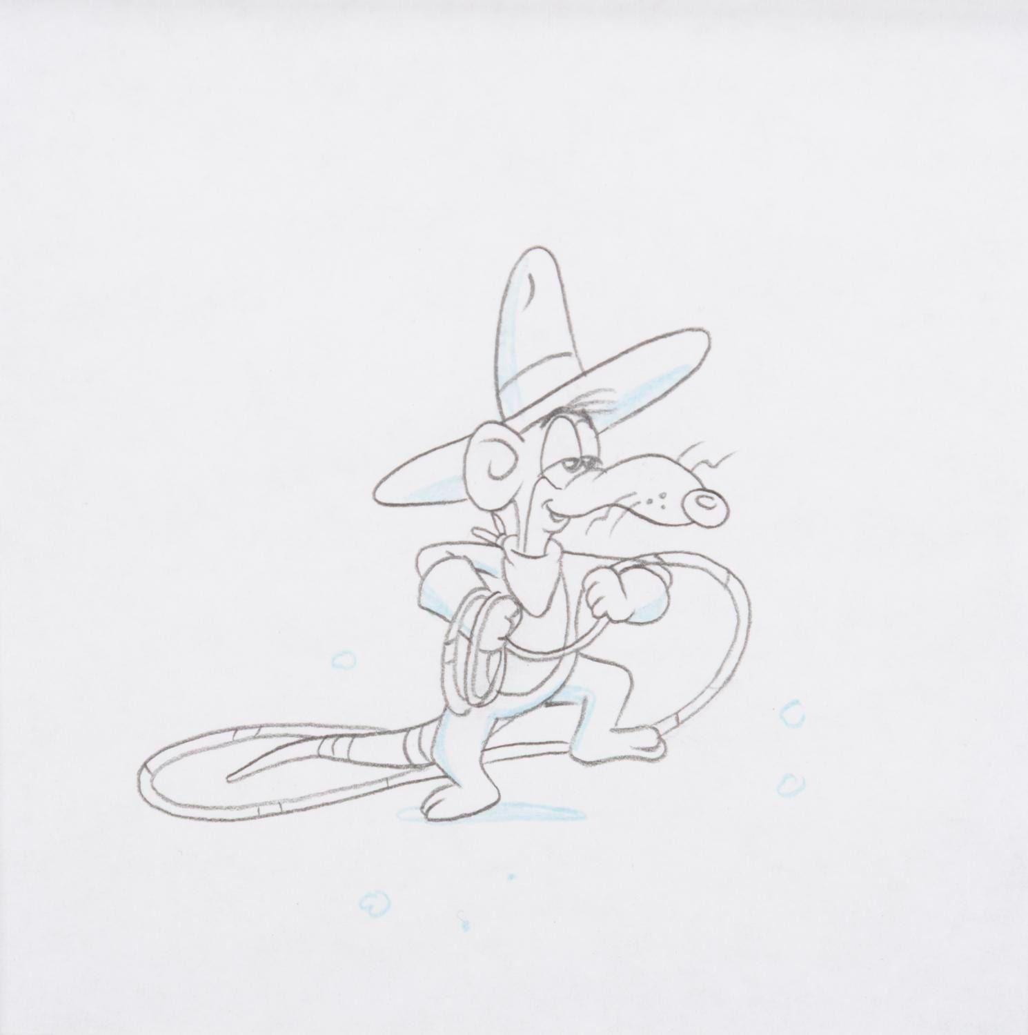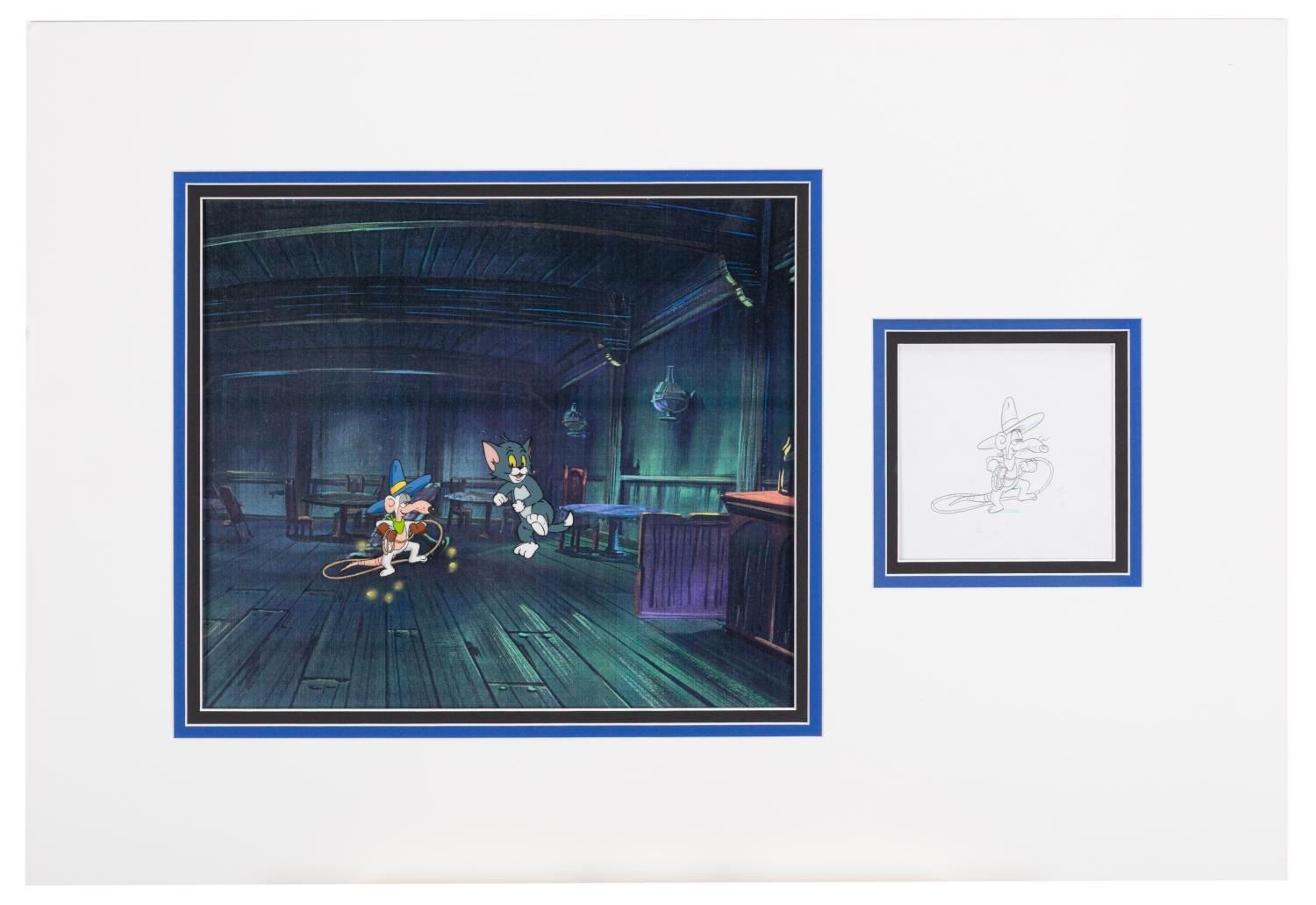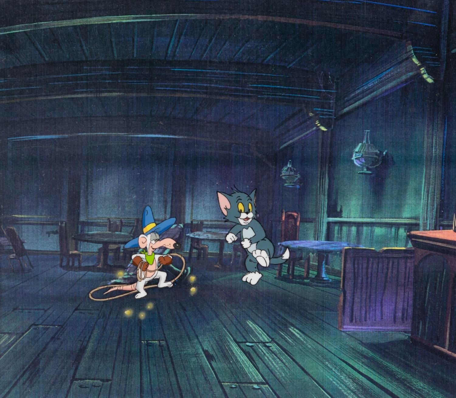 (Hanna-Barbera, 1991) An original production cel and drawing from the "Tom & Jerry Kids " episode "Slowpoke Antonio, " paired with a printed color background. Tom and Slowpoke have an image size of 2.75 " x 4.5 " on a 9.5 " x 11 " visible cel, while the drawing measures 2 " x 2.5 " in a 4 " x 4 " window of the 16 " x 23.5 " matte. The artwork is in good to very good condition with scratches, wear from production use, and paint loss, notably on Tom's leg.