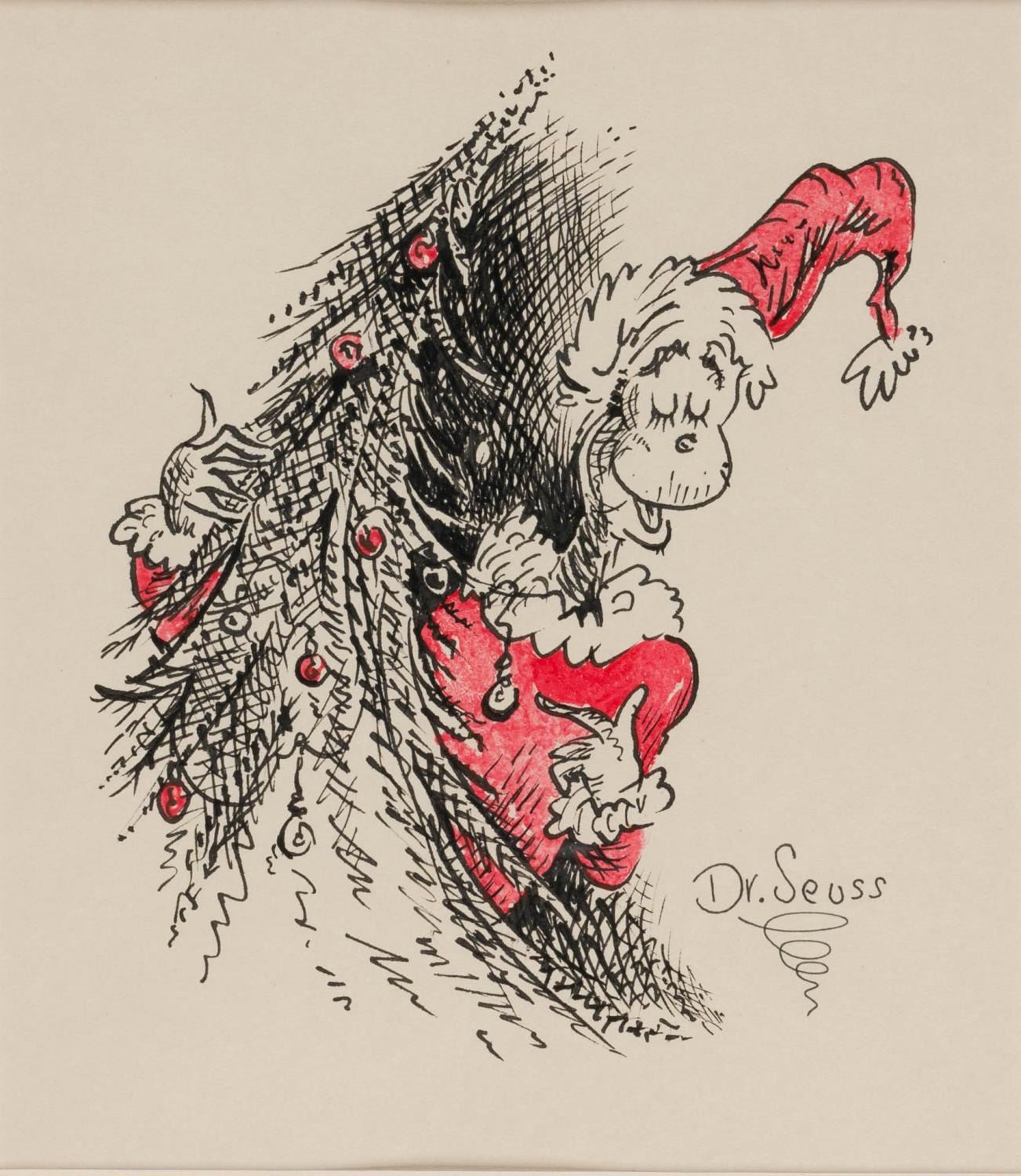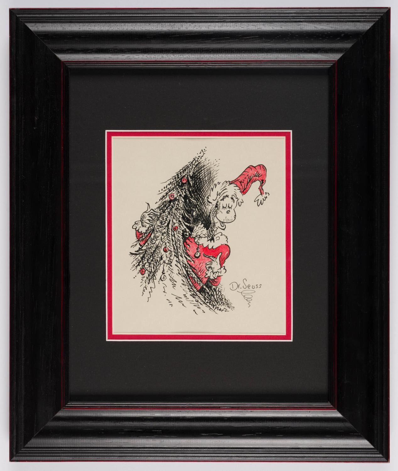 (Seuss, 1960s) An original drawing of The Grinch by Theodor Seuss Geisel, best known by his pen name "Dr. Seuss. " This original ink drawing of one of Seuss' most famous characters features hand-colored highlights and is signed "Dr. Seuss " on the bottom of the image. Original artwork by Dr. Seuss is extremely sought after, and this example depicting such a well-known character is exceptionally rare. The drawing has an image size of 6 " x 7 " and 18.5 " x 15.5 " framed. The artwork is in fine condition.