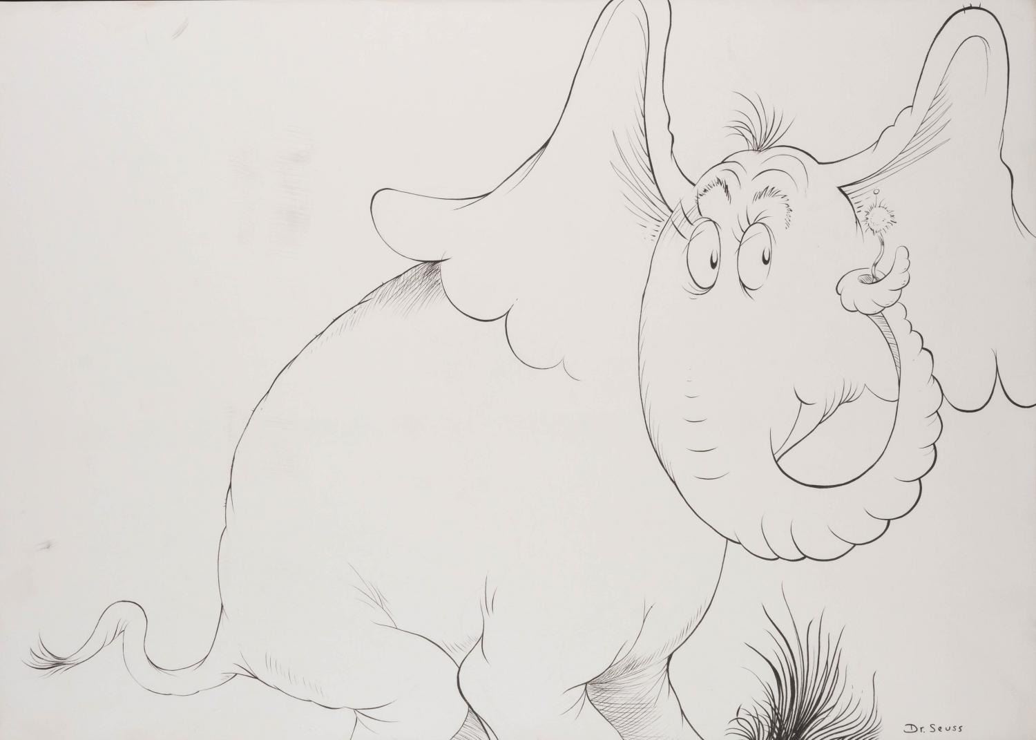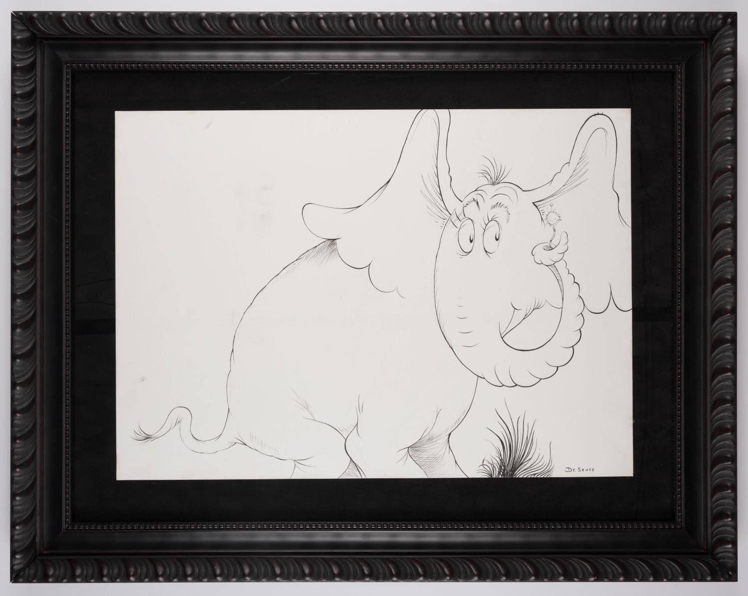 (Seuss, 1960s) A large original drawing of Horton the Elephant from Horton Hears a Who, signed by Dr. Seuss. The imagery is similar in size and composition to the piece that was used to create the "Horton Line Drawing " limited edition print. Original artwork by Dr. Seuss is extremely sought after, and this example depicting such a well-known character is exceptionally rare. Measuring 19.5 " x 26.5 " in a 29.25 " x 37.5 " frame, the ink illustration is in very fine condition.