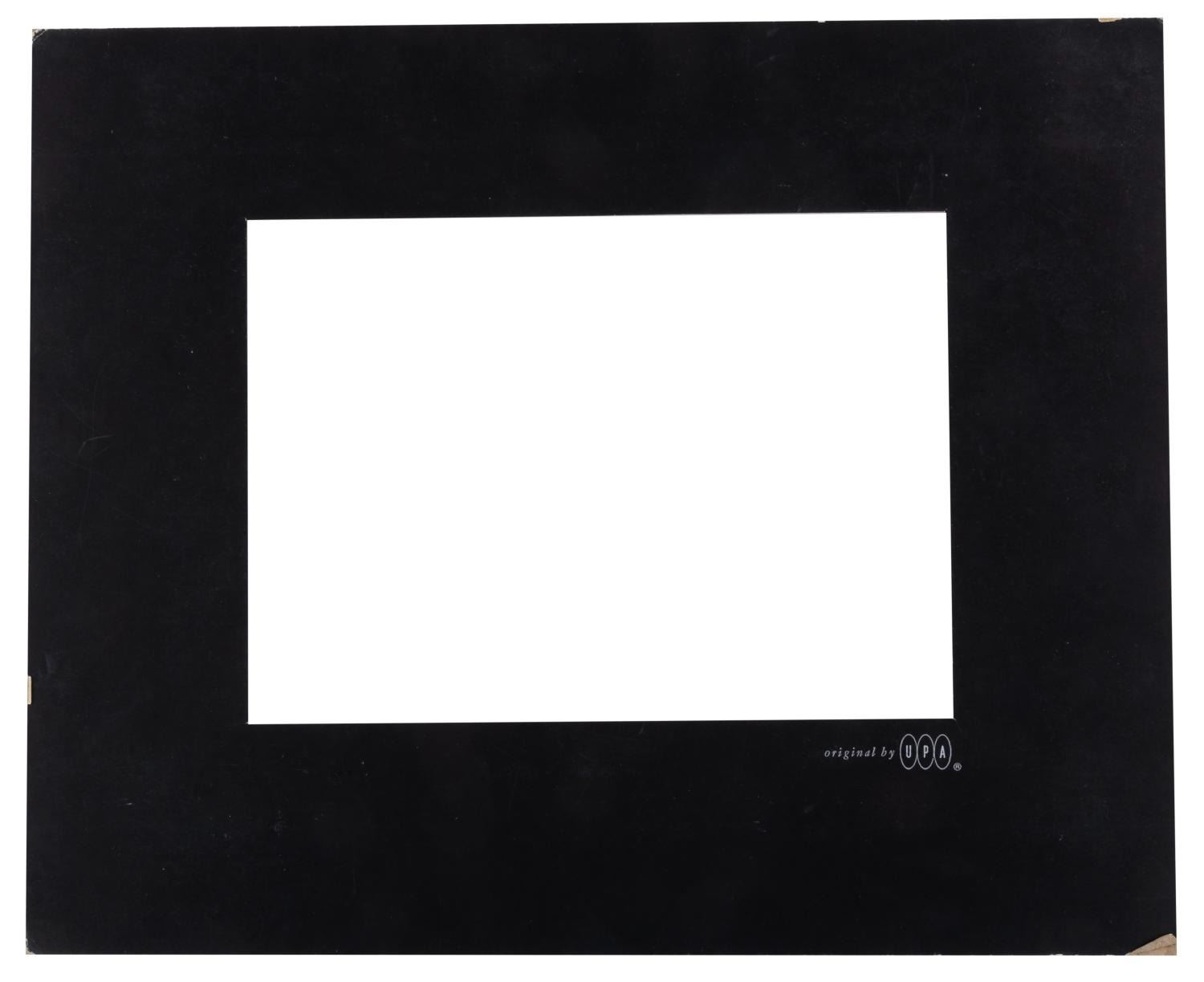 (UPA, 1950s) An empty matte from the UPA animation studio for the display of a cel or artwork. The matte has the mark "original by UPA " at the lower right edge. Measuring 13.75 " x 17 ", the matte is in good condition with edge wear including chipping and paper loss to the lower right corner.