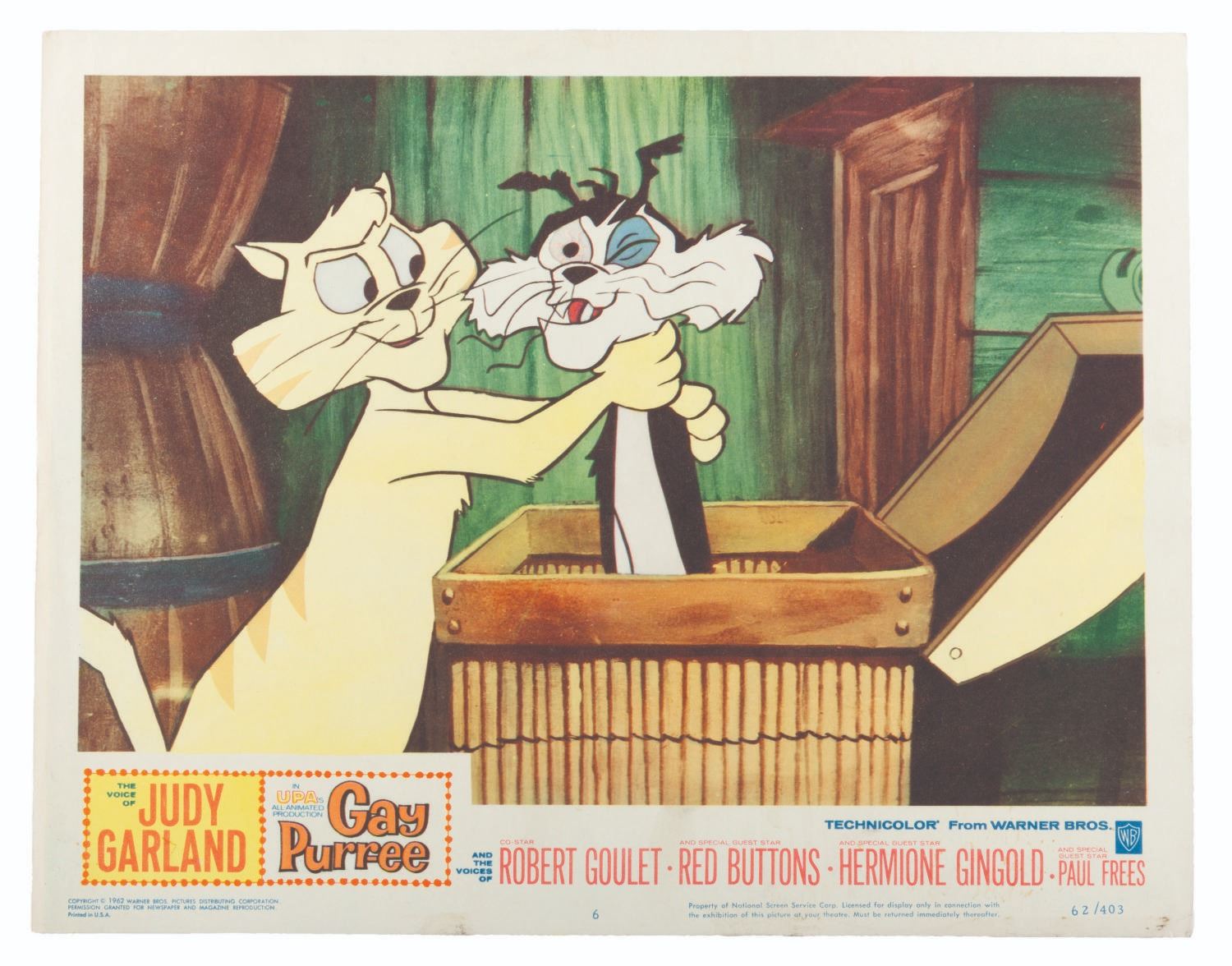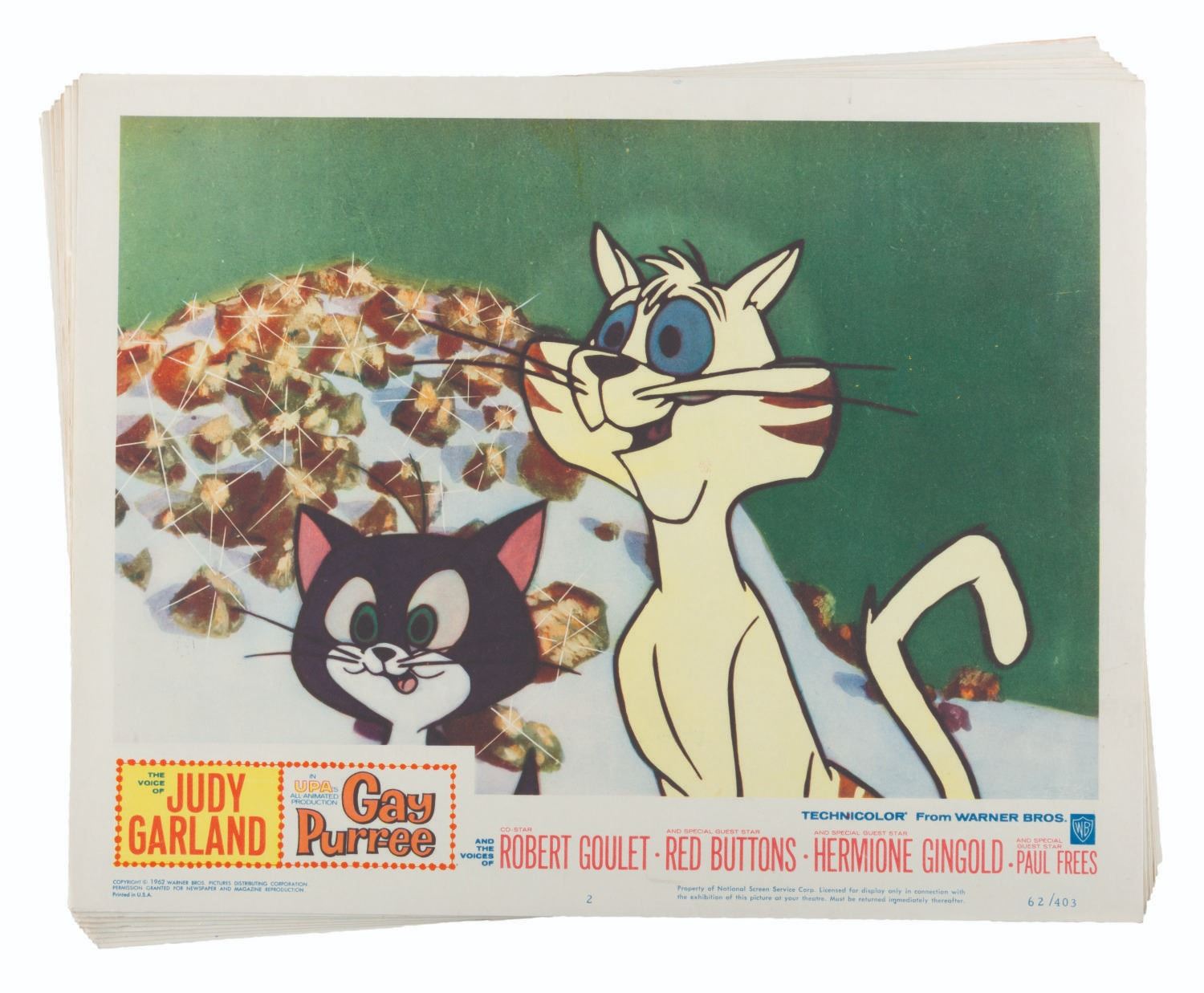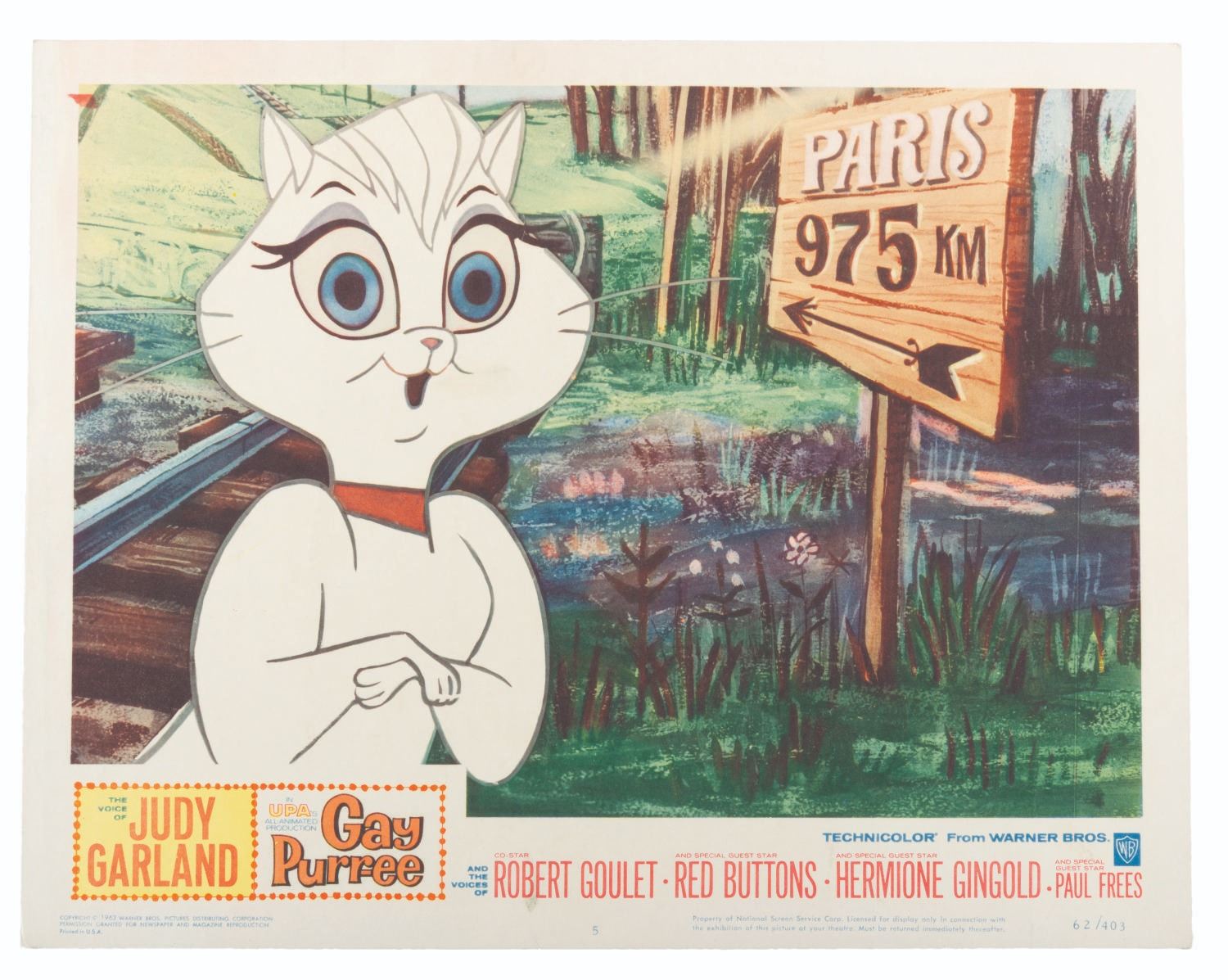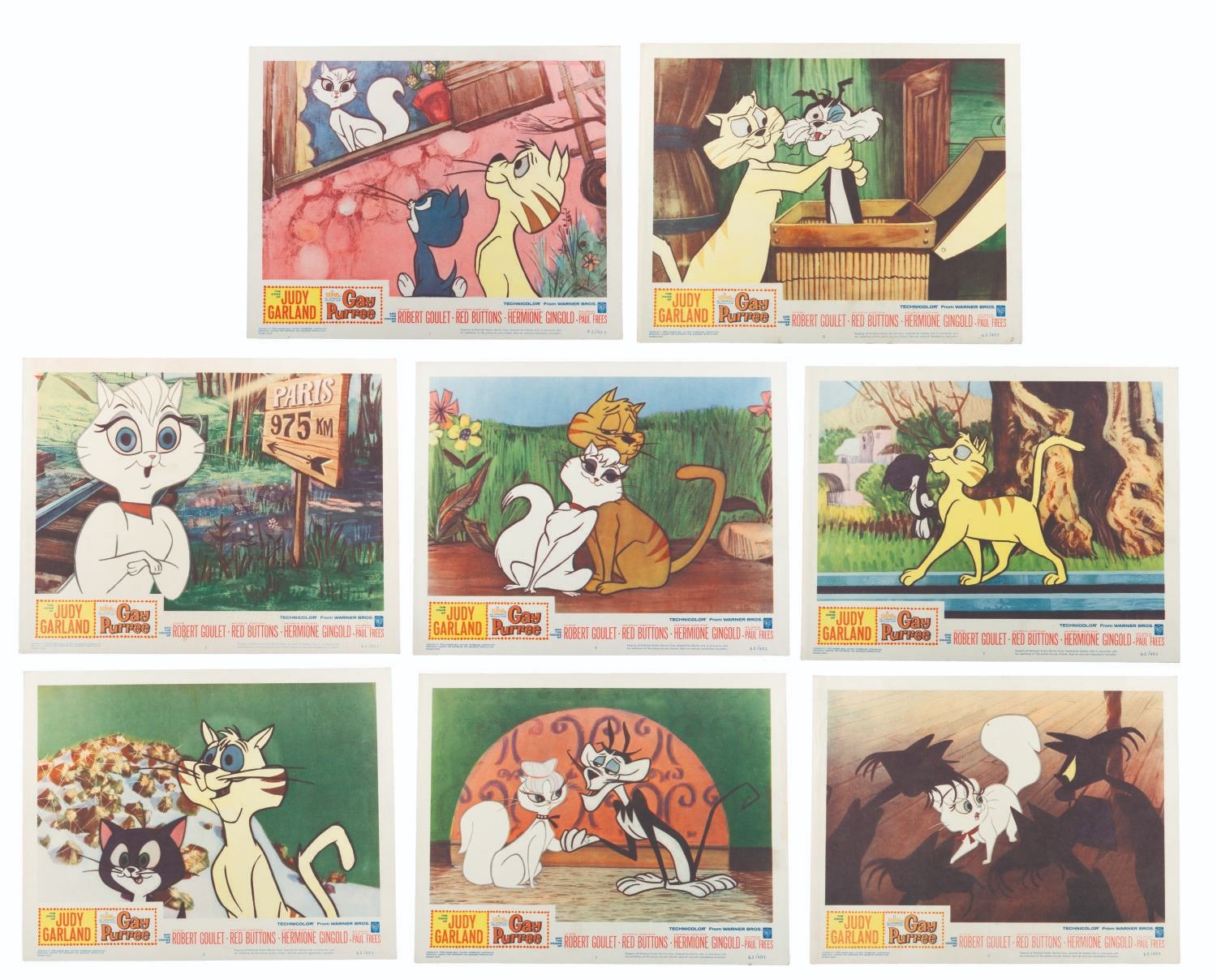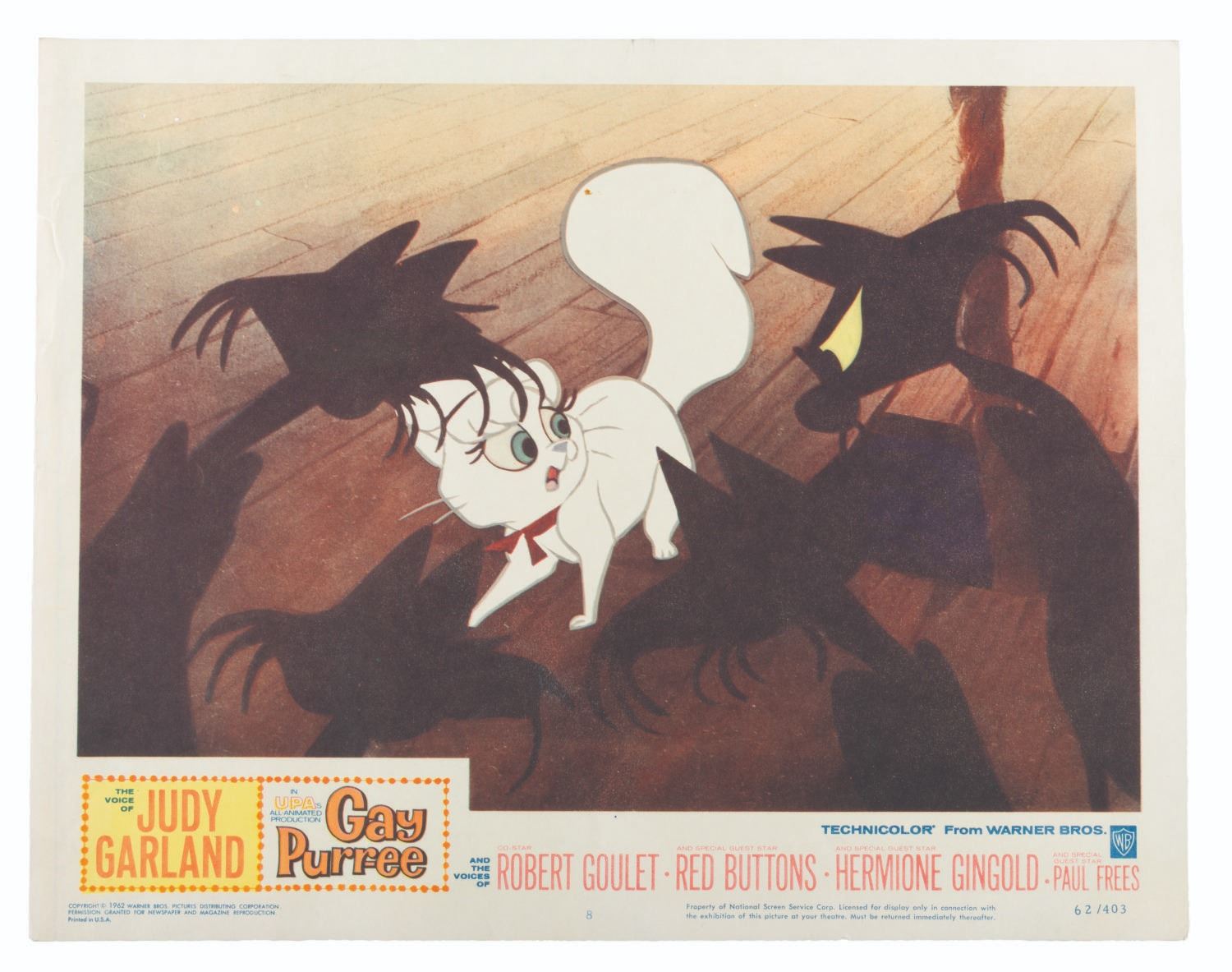 (UPA, 1962) A set of eight lobby cards from the release of "Gay Purr-ee, " starring Judy Garland and Robert Goulet. Measuring 11 " x 14 " each, the lobby cards are in good to very good condition with spots of discoloration from age, tears up to 1 ", scratches, and wear.