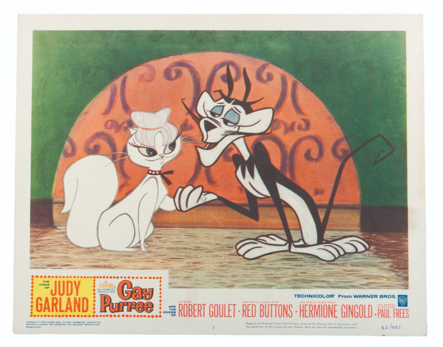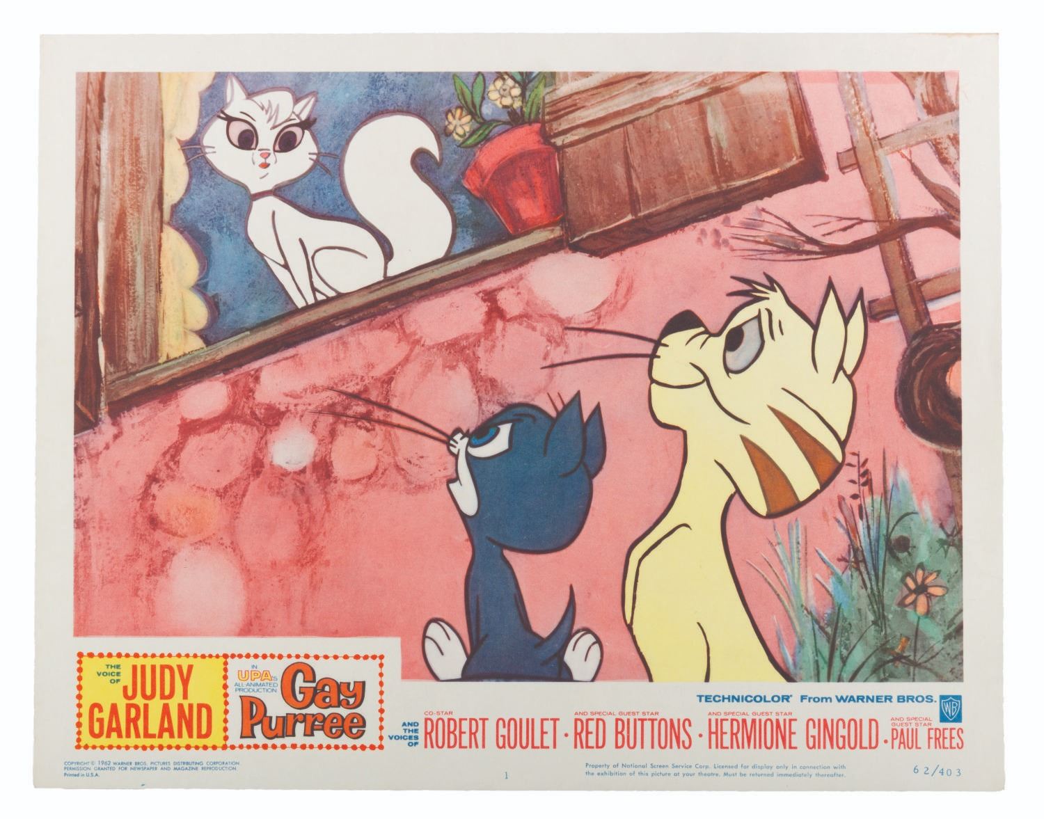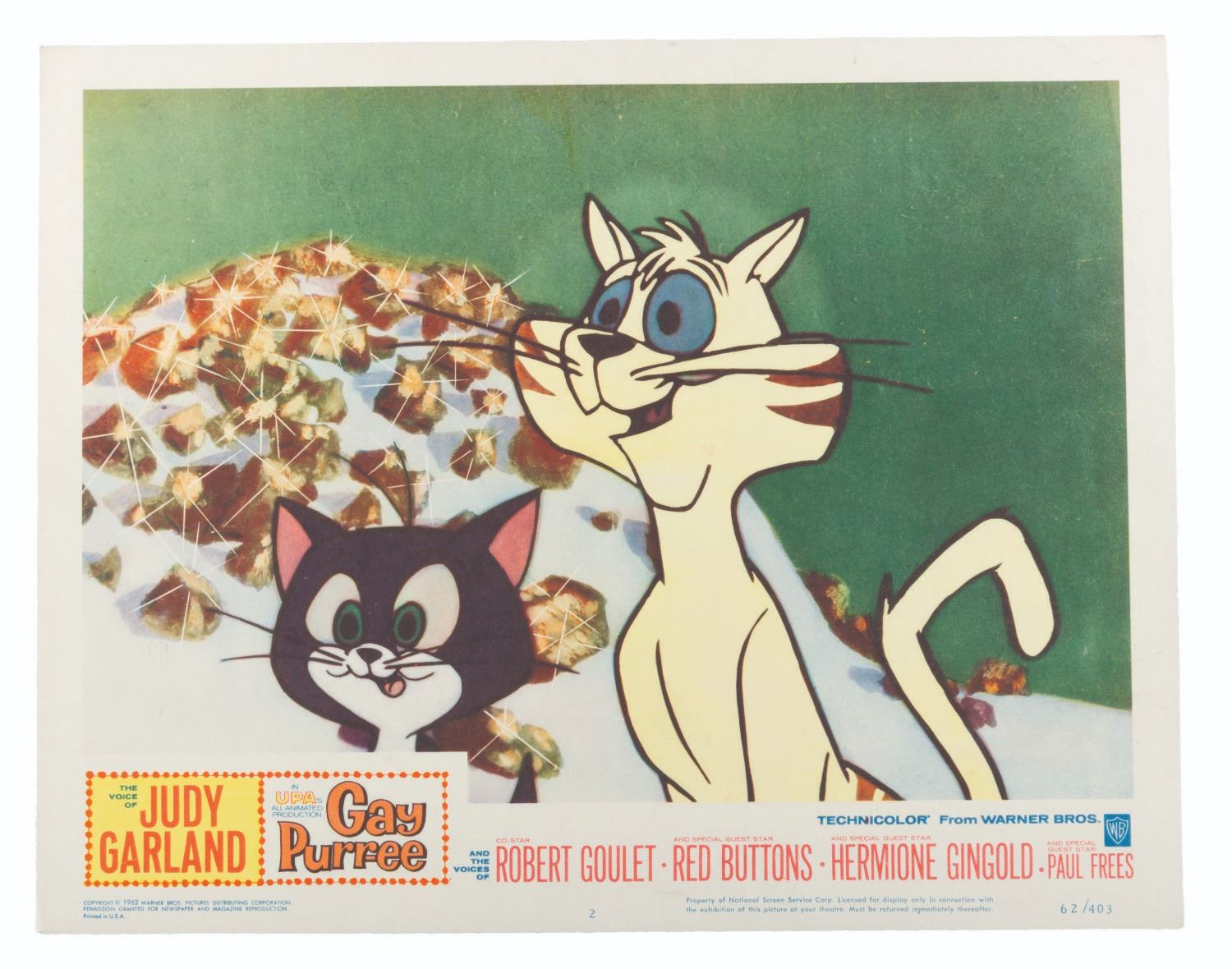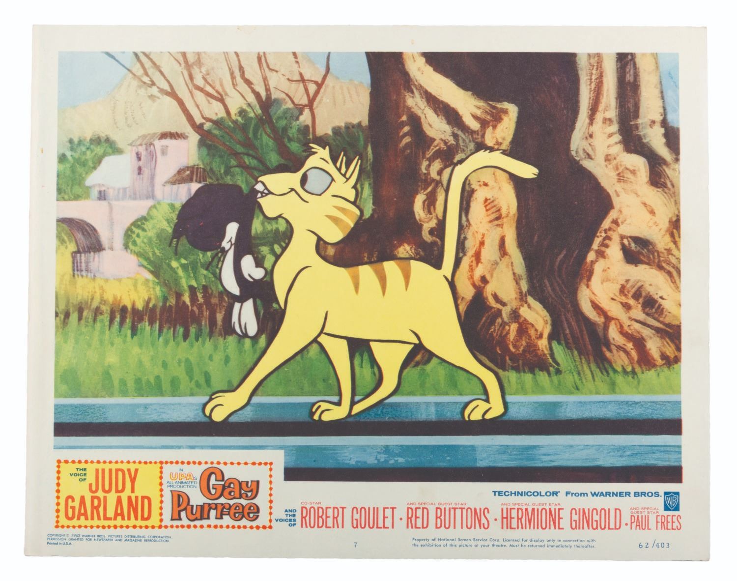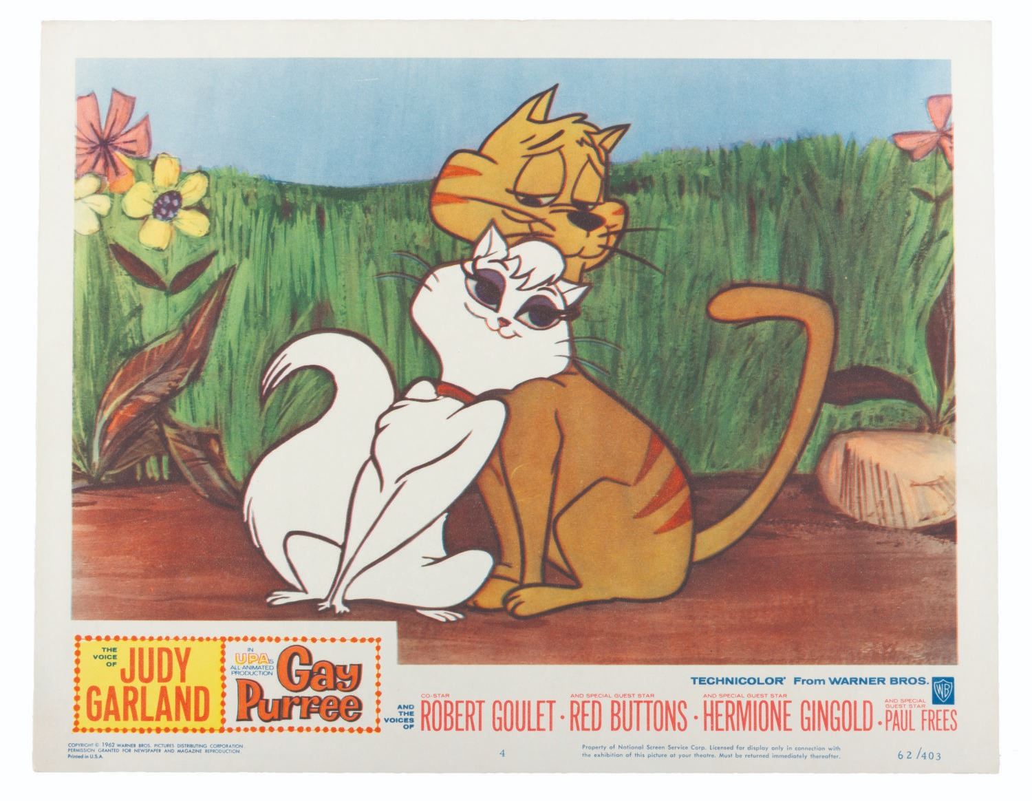 (UPA, 1962) A set of eight lobby cards from the release of "Gay Purr-ee, " starring Judy Garland and Robert Goulet. Measuring 11 " x 14 " each, the lobby cards are in good to very good condition with spots of discoloration from age, tears up to 1 ", scratches, and wear.