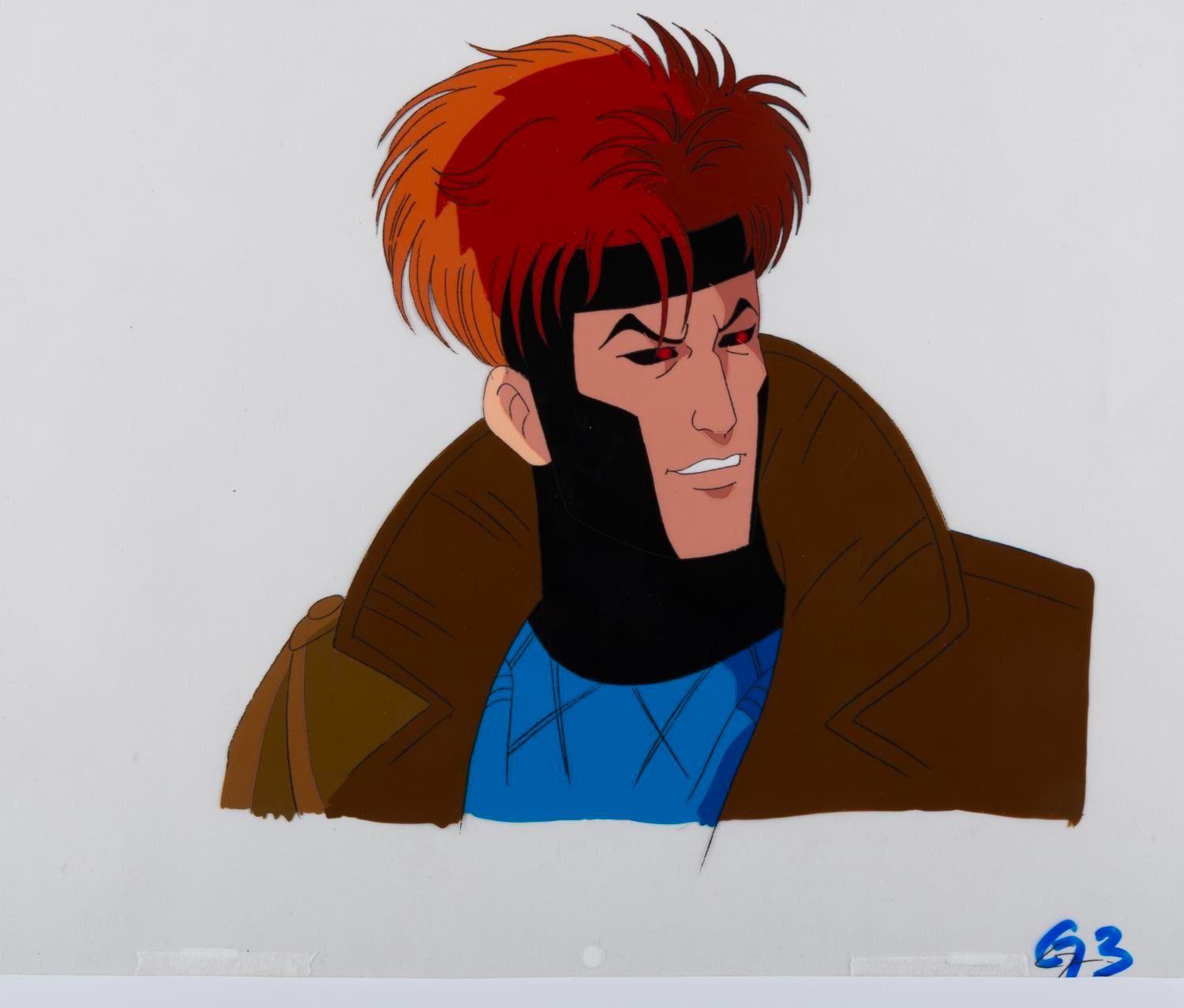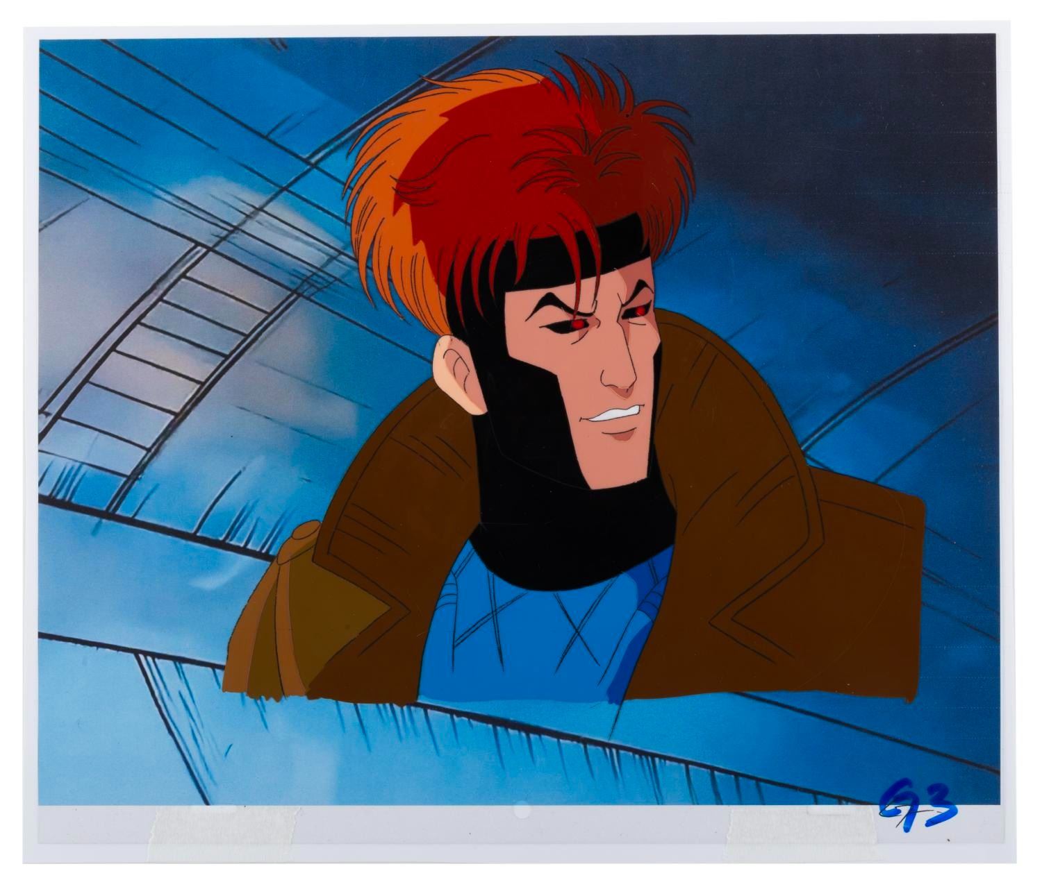 (Fox, 1993) An original production cel of Gambit from the "X-Men: The Animated Series " episode "Slave Island, " with a color copy background. With a character image size of 8.5 " x 9 " on a 10.5 " x 12.5 " cel, the art is in very good condition with light wear from production use, scratches, and paper backing transfer on the reverse.