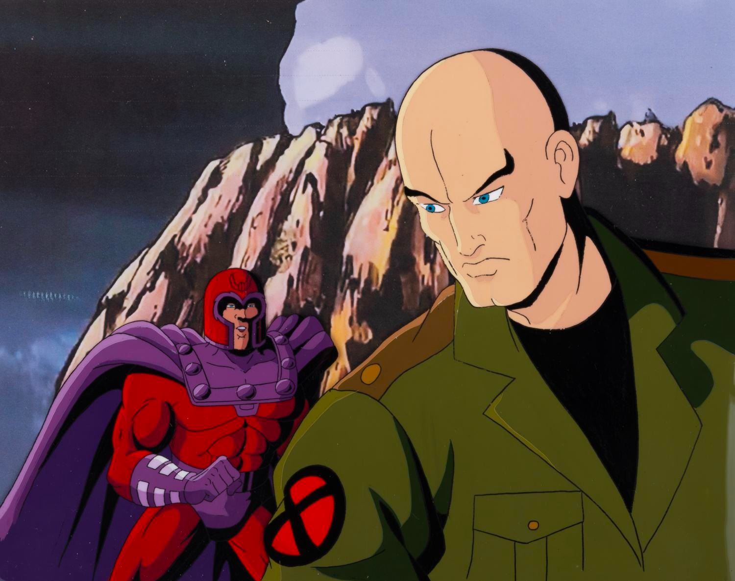 (Fox, 1993) A multi-layer production cel of Magneto and Professor X from the "X-Men: The Animated Series " episode "Red Dawn, " with a color copy background. Magneto and Professor X have an image size of 9 " x 11.75 " on 10.5 " x 12.5 " cels. The art displays in very good condition with light spots of paint loss, wear from production use, and paper backing transfer on the reverse.