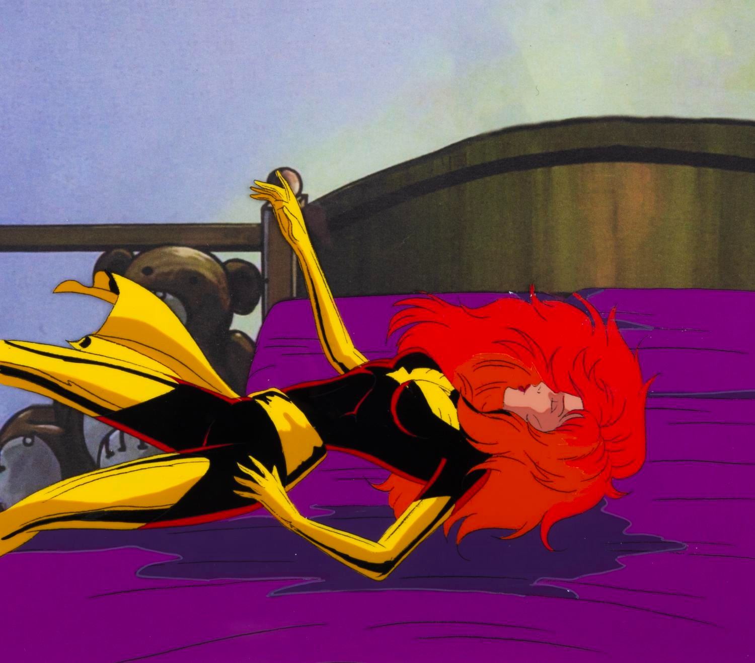 (Fox, 1994) An original production cel of Dark Phoenix from the "X-Men: The Animated Series " episode "The Dark Phoenix Saga Part 3: The Dark Phoenix, " with a color copy background. Dark Phoenix has an image size of 5.75 " x 9.5 " on a 9 " x 10.5 " trimmed cel. The art is in very good condition with light wear from production use and paper backing transfer on the reverse.