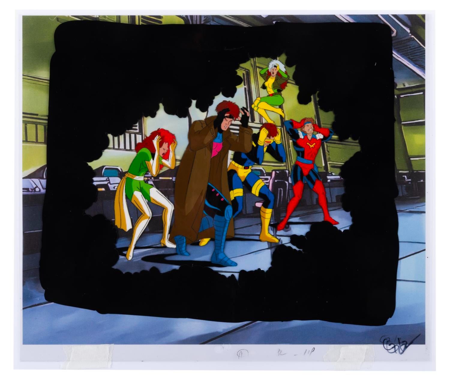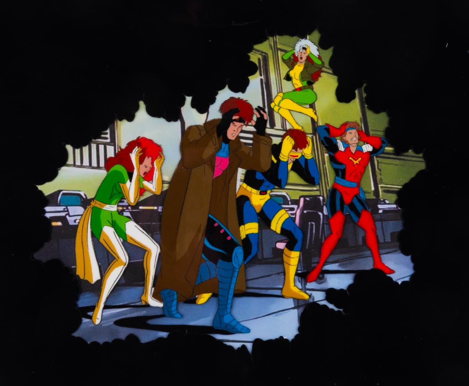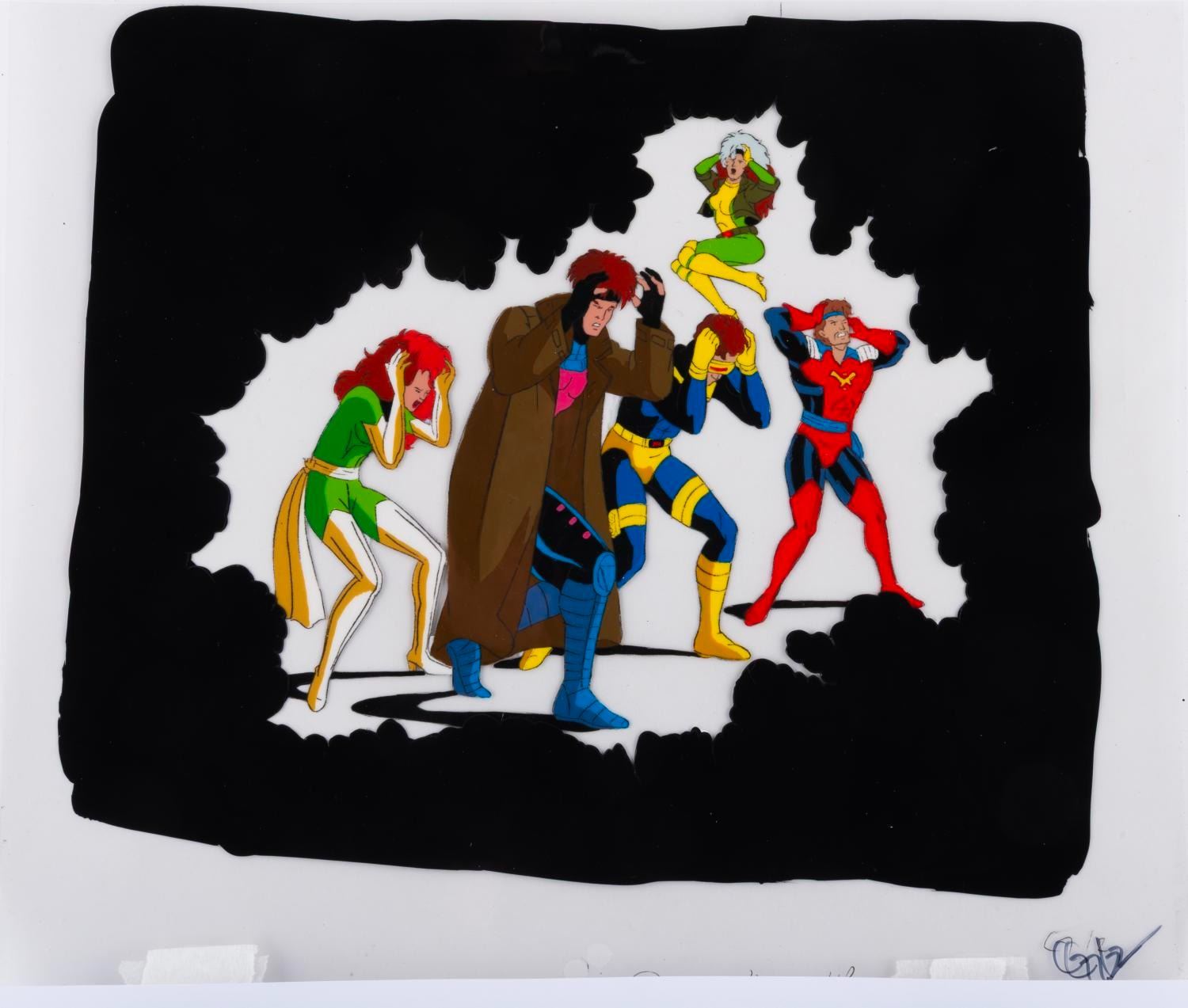 (Fox, 1994) An original multi-layer production cel of Jean Grey, Gambit, Cyclops, Rogue, and Corsair from the "X-Men: The Animated Series " episode "The Dark Phoenix Saga Part 4: The Starjammers, " with a color copy background. The characters have an image size of 9.25 " x 10.75 " on 10.5 " x 12.5 " cels. The art is in very good condition with light wear from production use and paper backing transfer on the reverse.