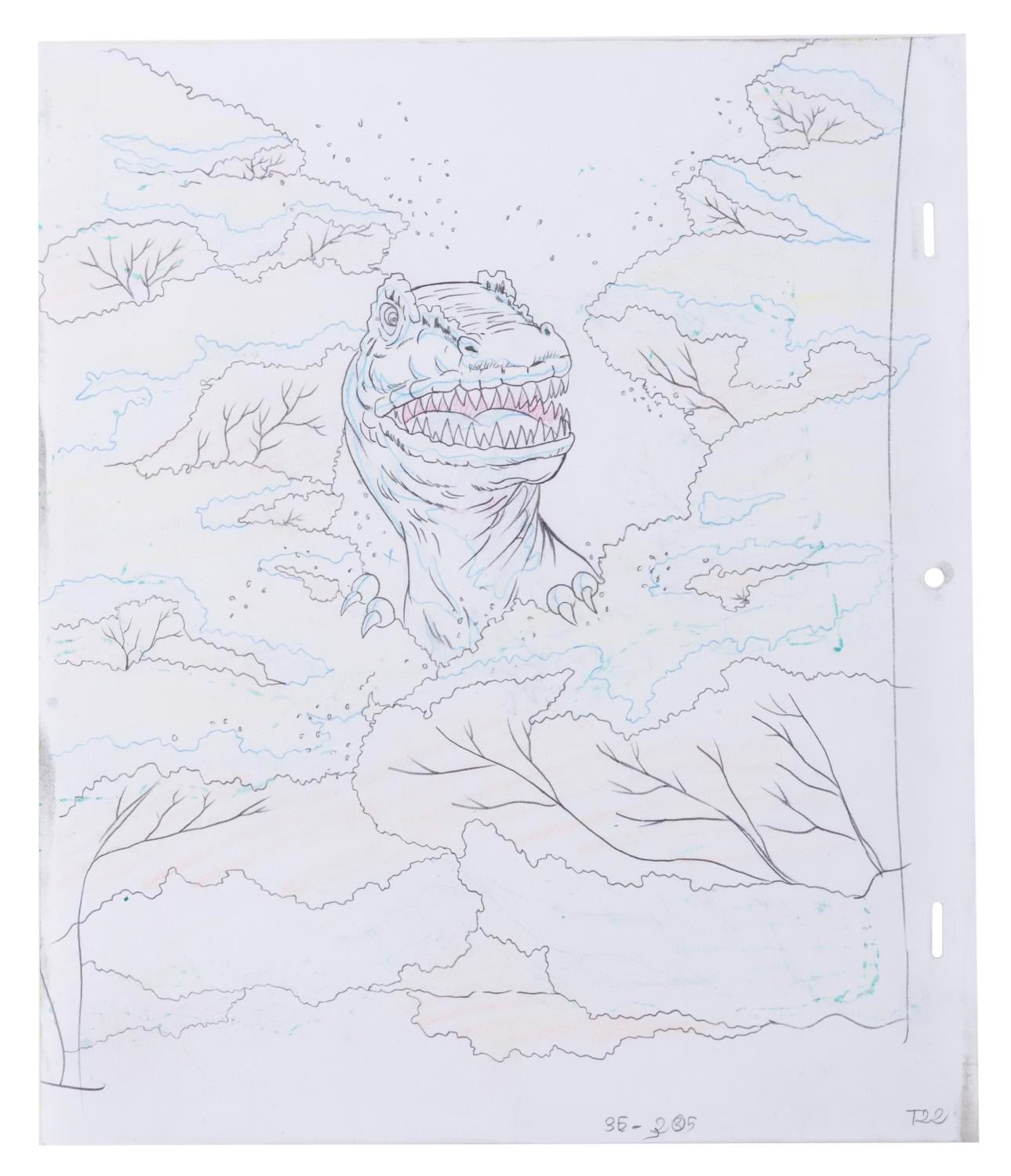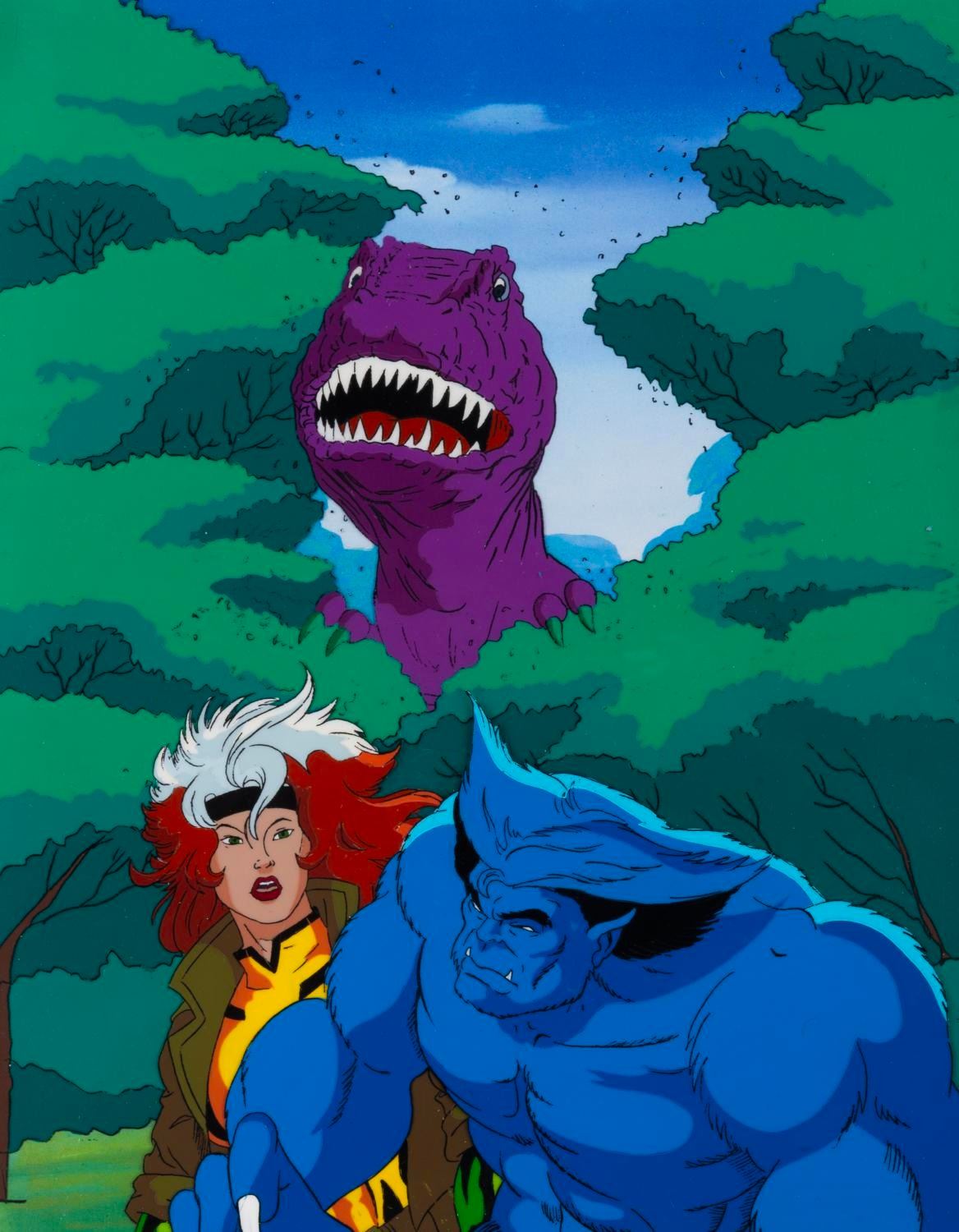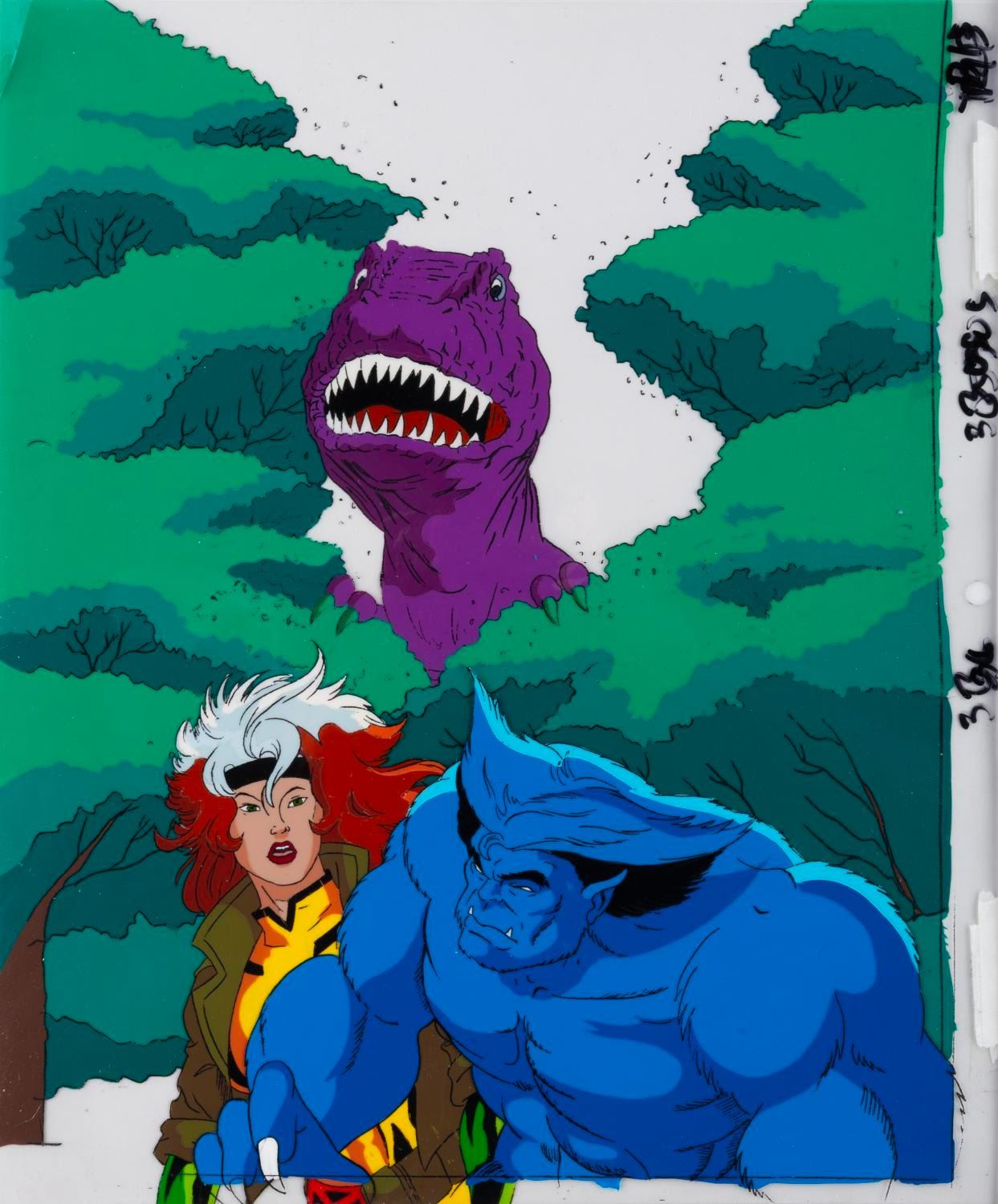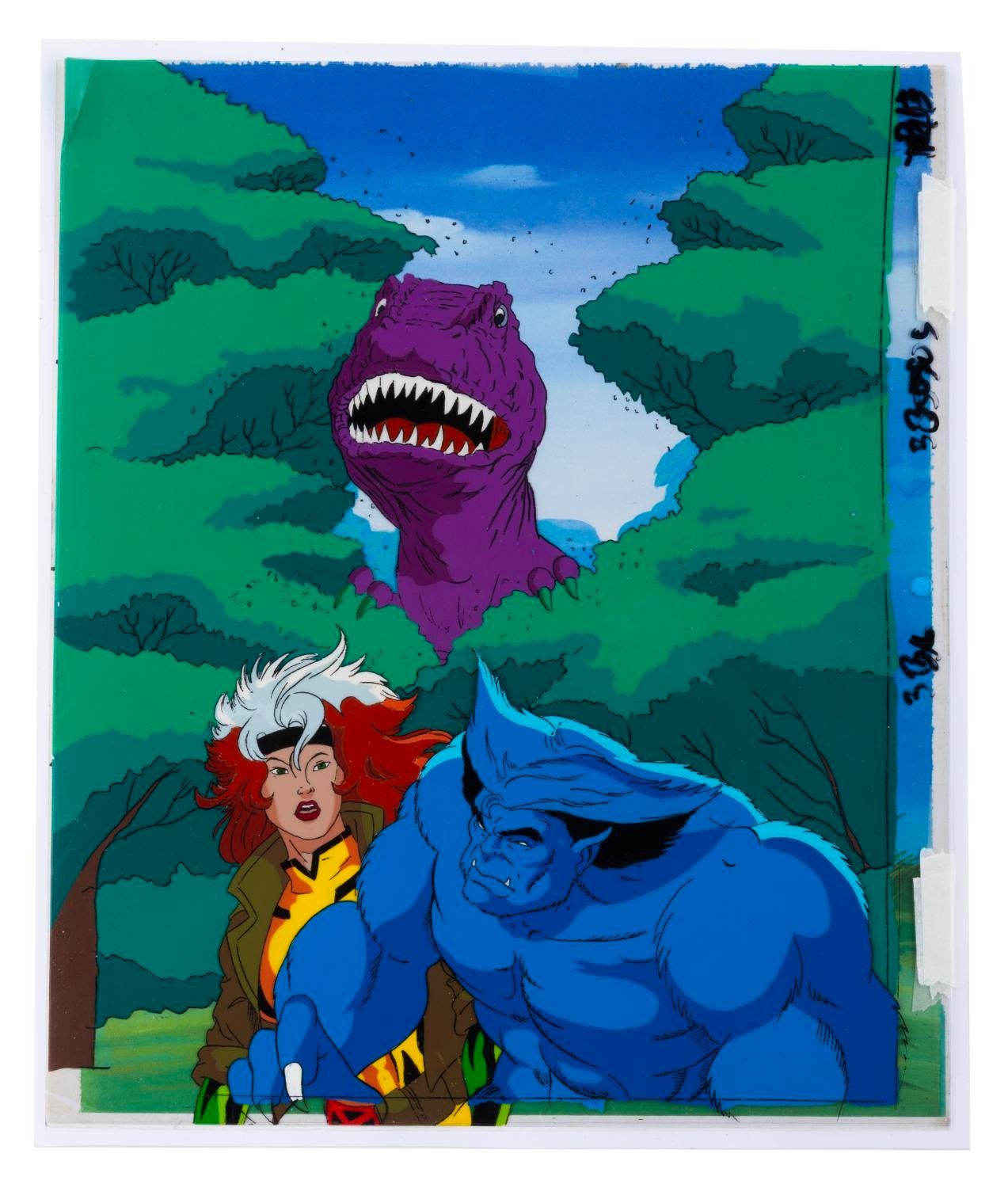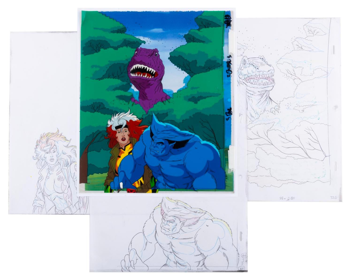 (Fox, 1996) A mult-layer production cel and three drawings of Rogue, Beast, and a Tyrannosaurus Rex from the "X-Men: The Animated Series " episode "Longshot, " with a color copy background. The character image size is 10.5 " x 12.5 " on a 10.5 " x 12.5 " cel and animation paper. The cel and drawings display in very good condition with scratches, creases, a fold at the top left corner of a cel, and wear from production use.