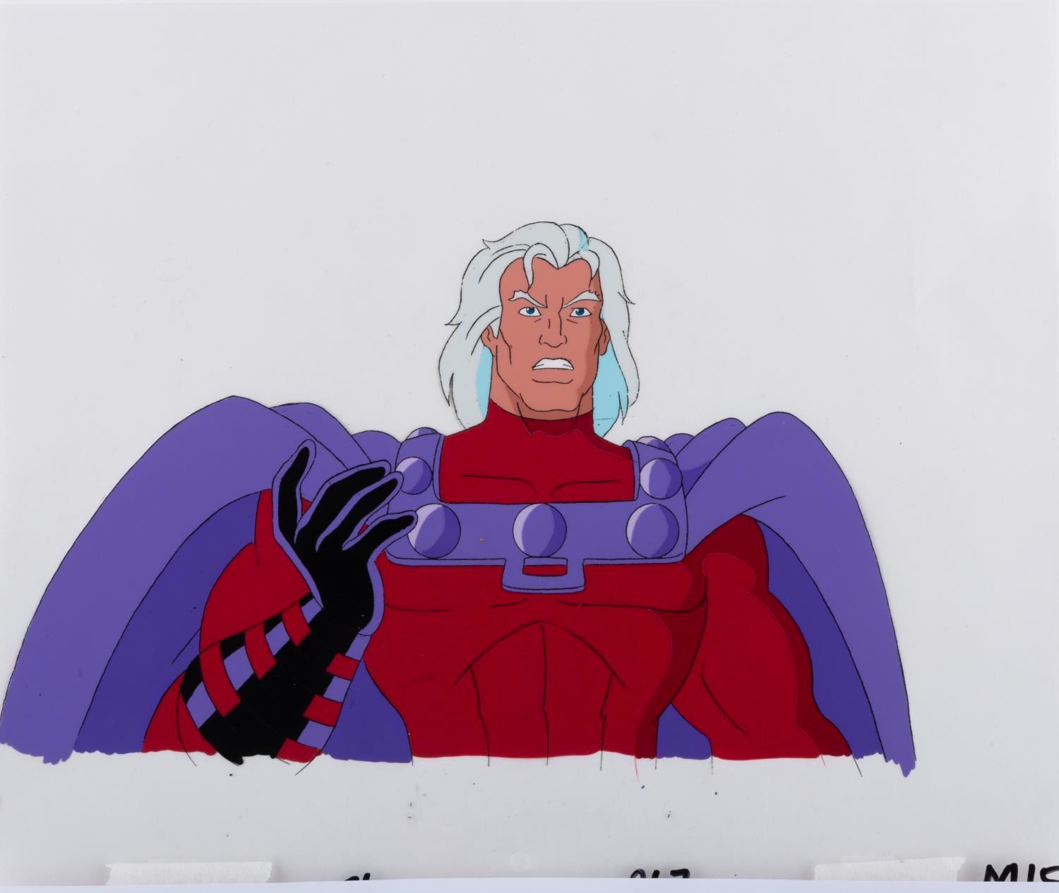 (Fox, 1997) An original production cel and color model drawing of Magneto from "X-Men: The Animated Series " series finale "Graduation Day. " Magneto has an image size of 6.5 " x 10.75 " on a 10.5 " x 12.5 " cel and animation paper. The cel displays in very good condition with scratches, wear from production use, and paper backing transfer on the reverse. The drawing is in fair condition, with Magneto's head hand-drawn and the rest of his body a color copy, which has been cut out and taped back together, exhibiting paper scrapes and wear.