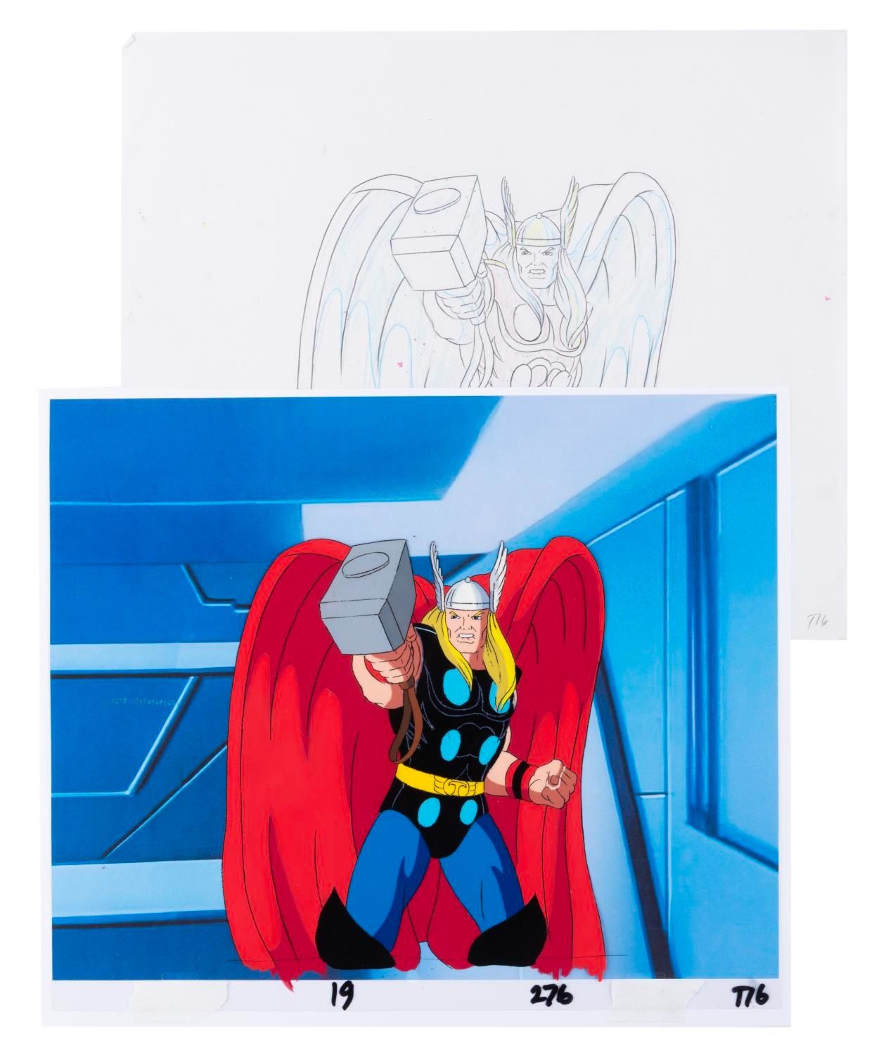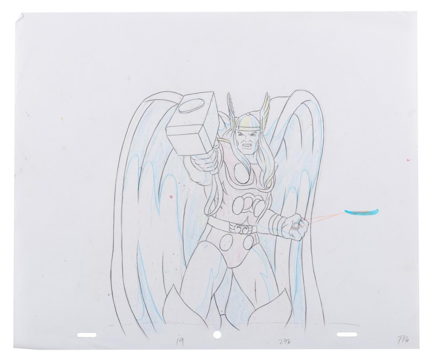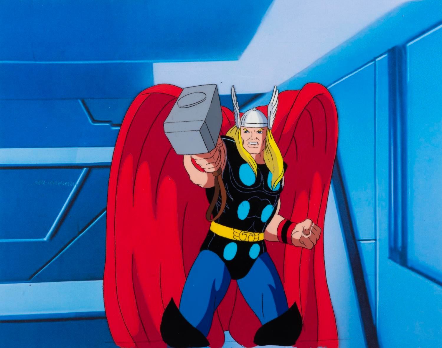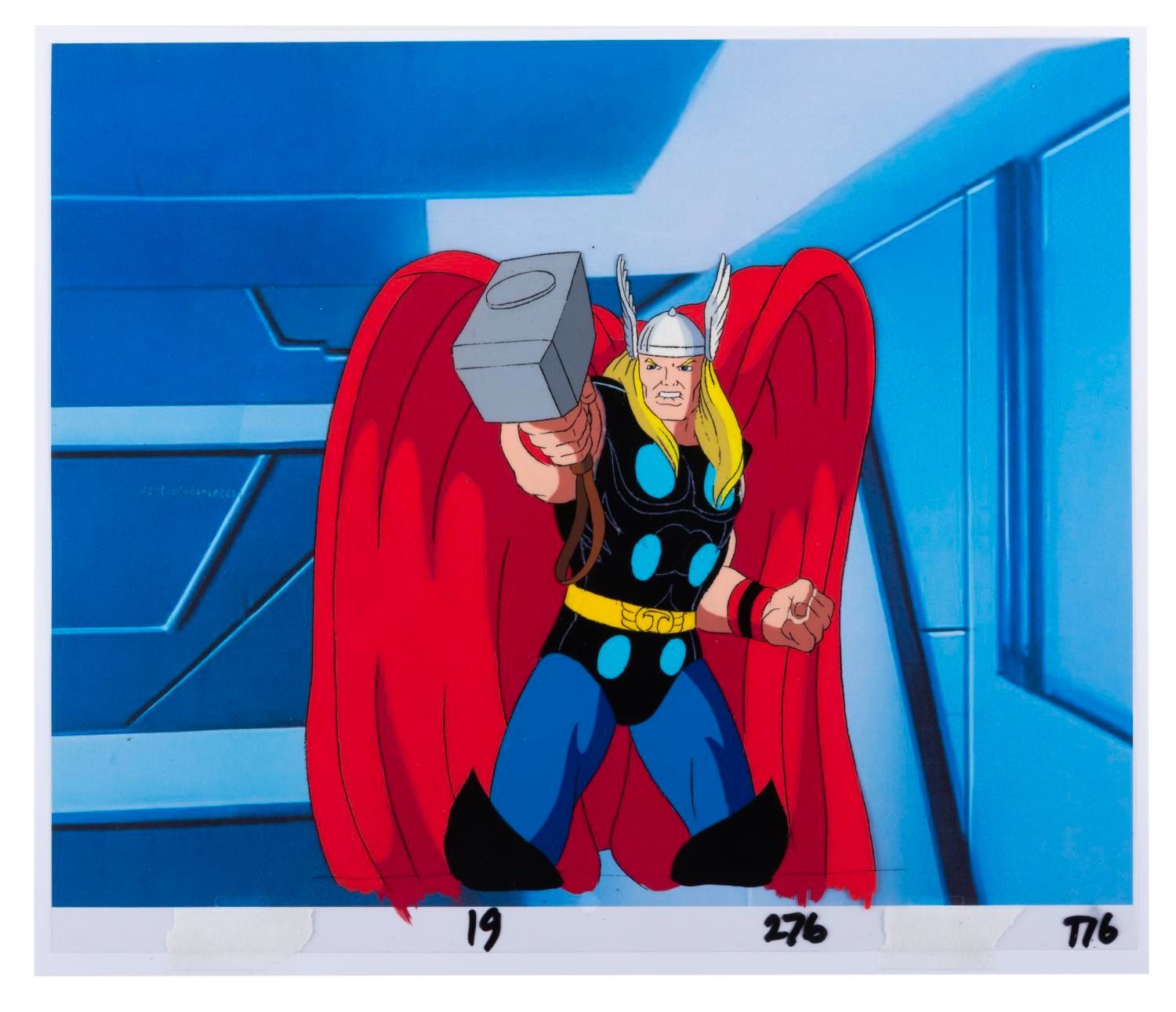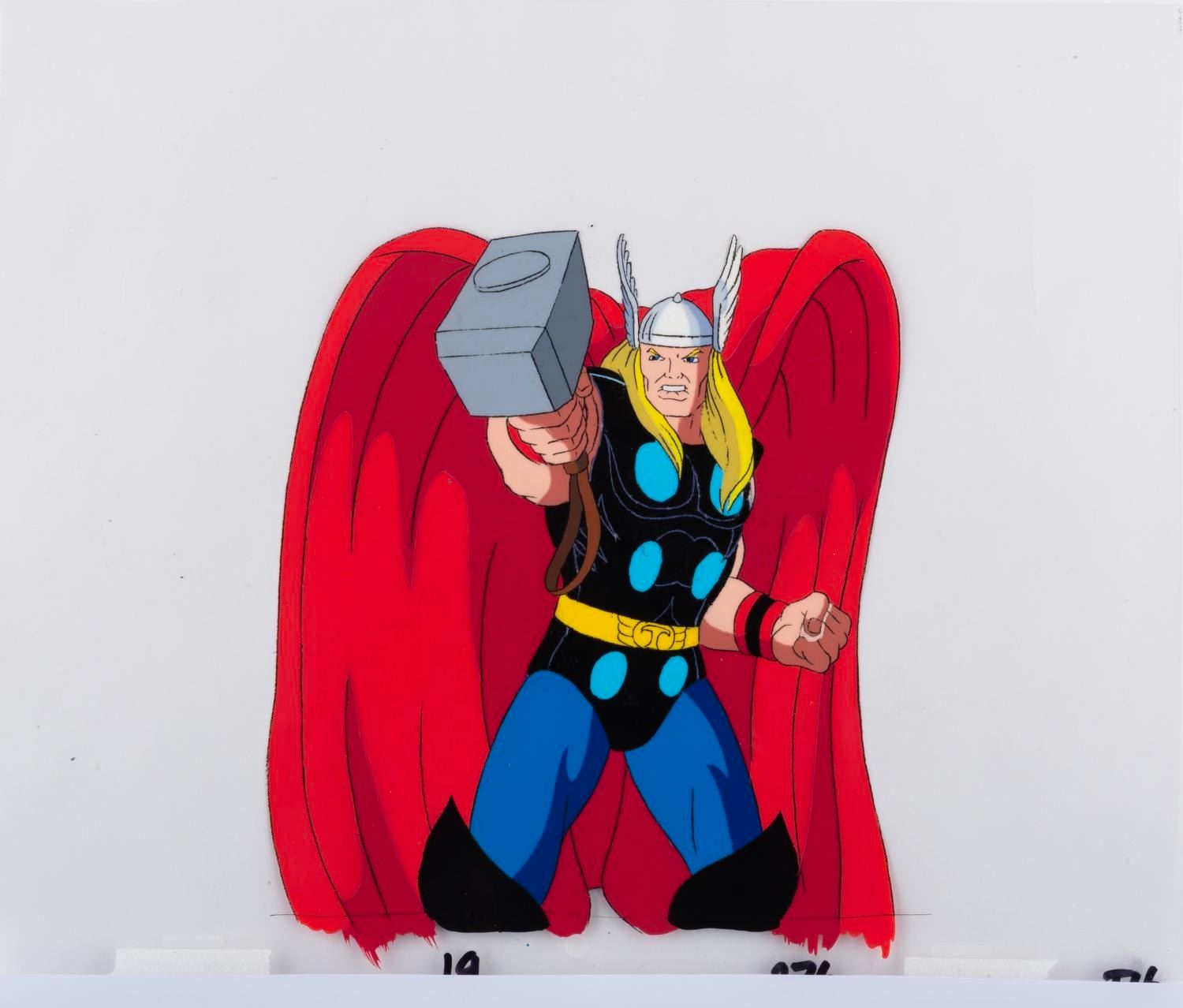 (Marvel, 1995) An original production cel and drawing of Thor from the "Fantastic Four " animated series episode "To Battle A Living Planet. " Thor has an image size of 6.5 " x 7.5 " on a 10.5 " x 12.5 " cel and animation paper. The cel and drawing display in very good condition with line loss, scratches, and wear from production use.