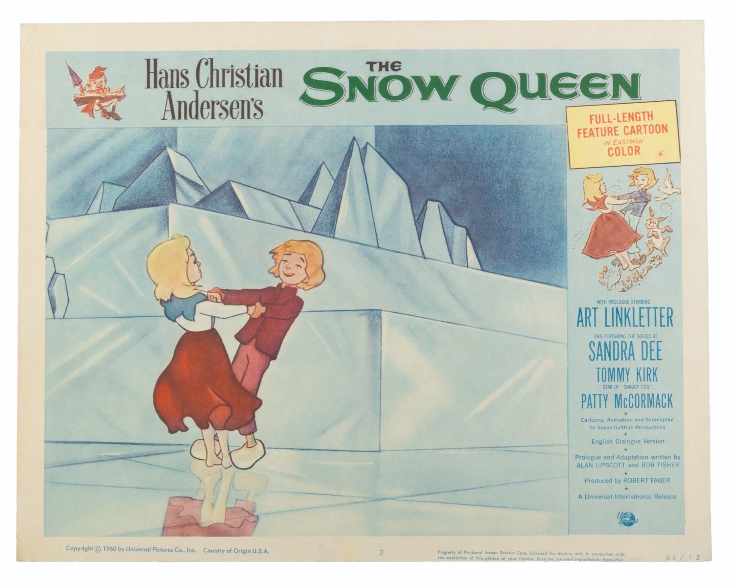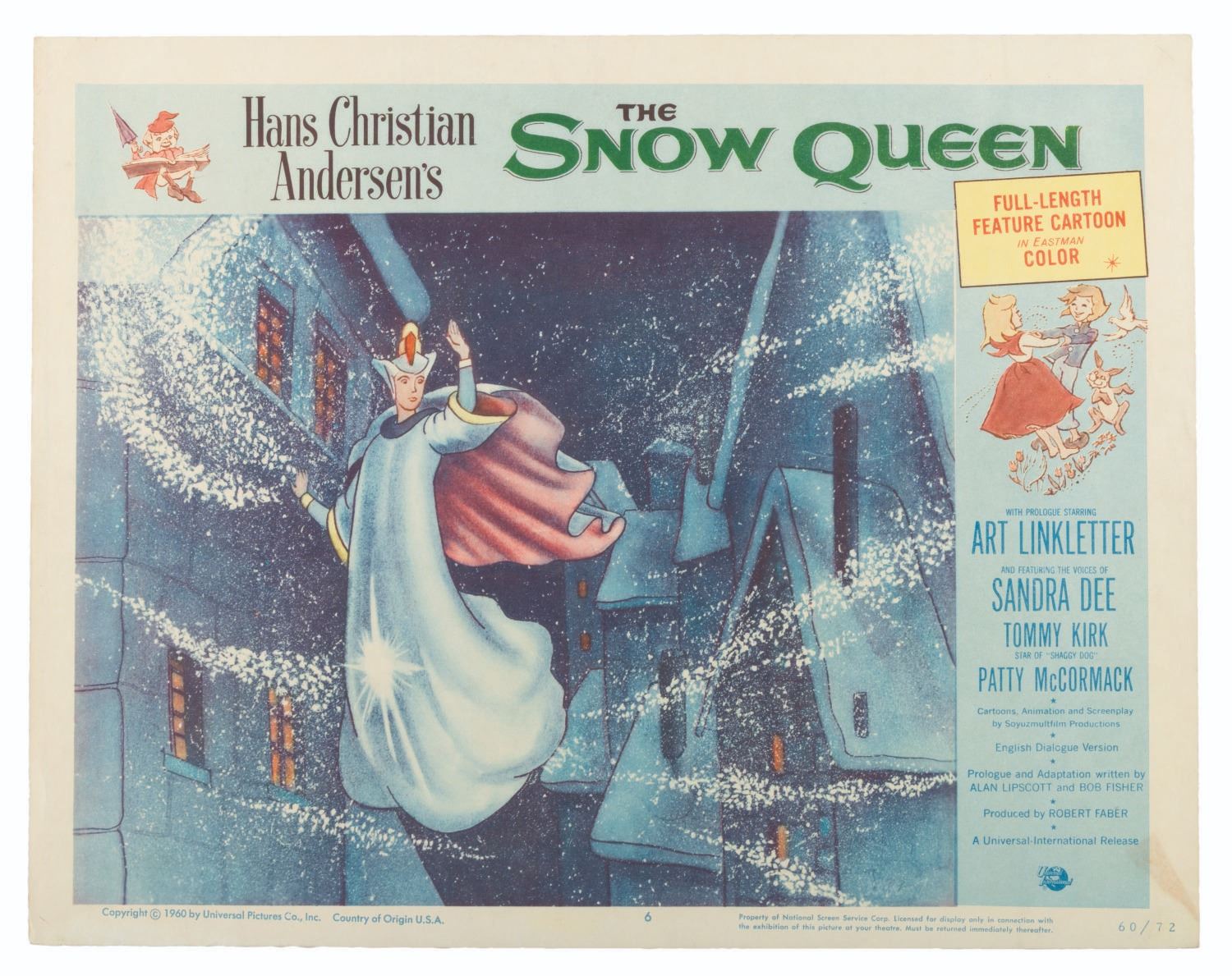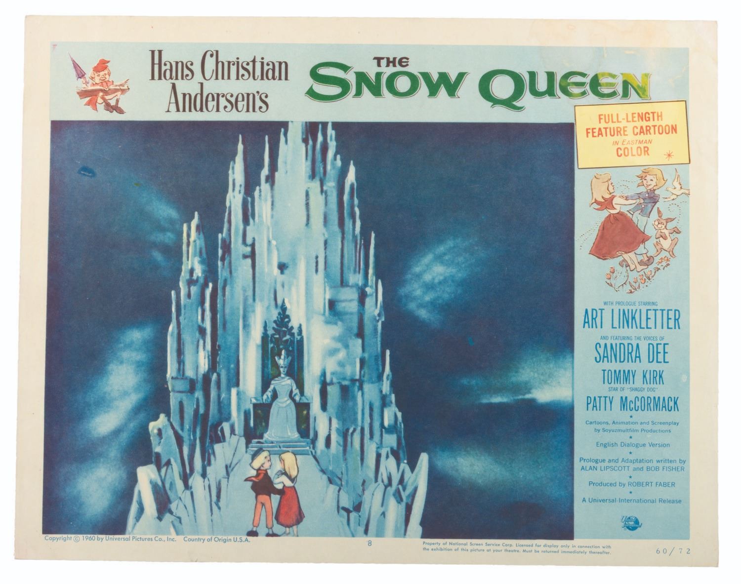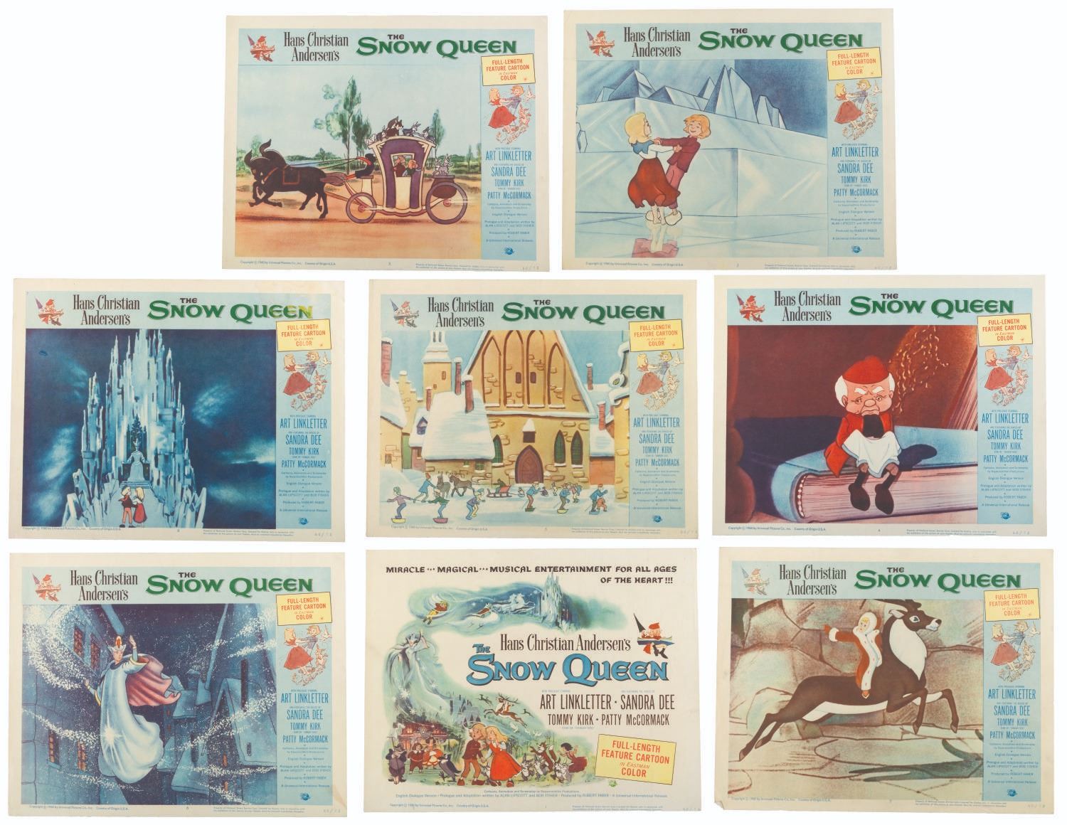 (Universal International, 1957) A set of eight lobby cards for the Soviet animated fantasy "The Snow Queen, " based on the Hans Christian Anderson fable of the same name. Measuring 11 " x 14 " each, the cards are in good condition with light discoloration, soiling, creasing, and pinholes.