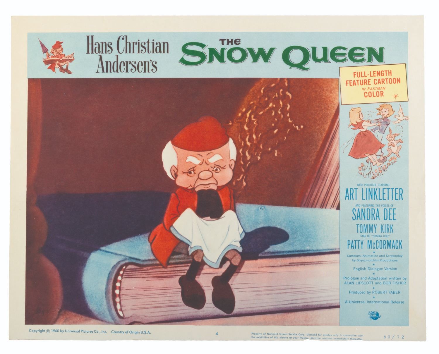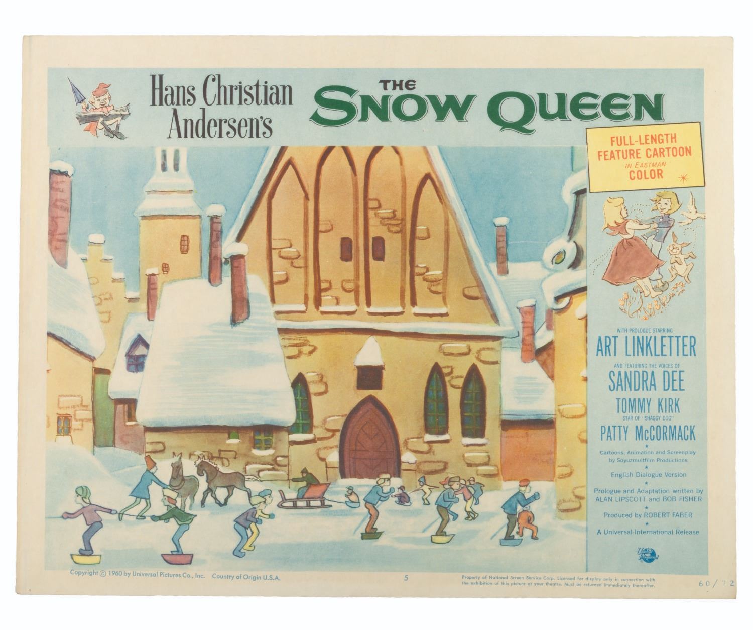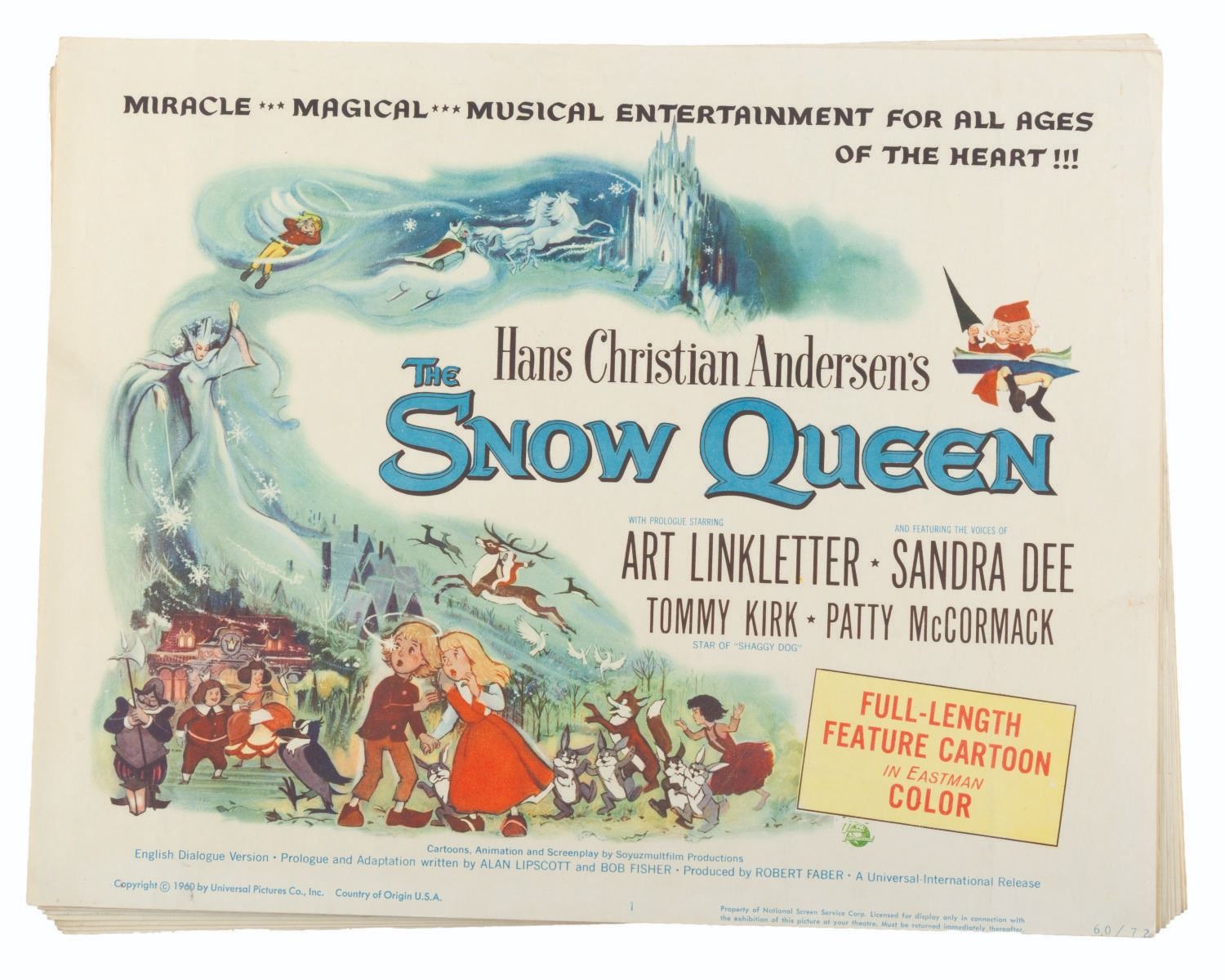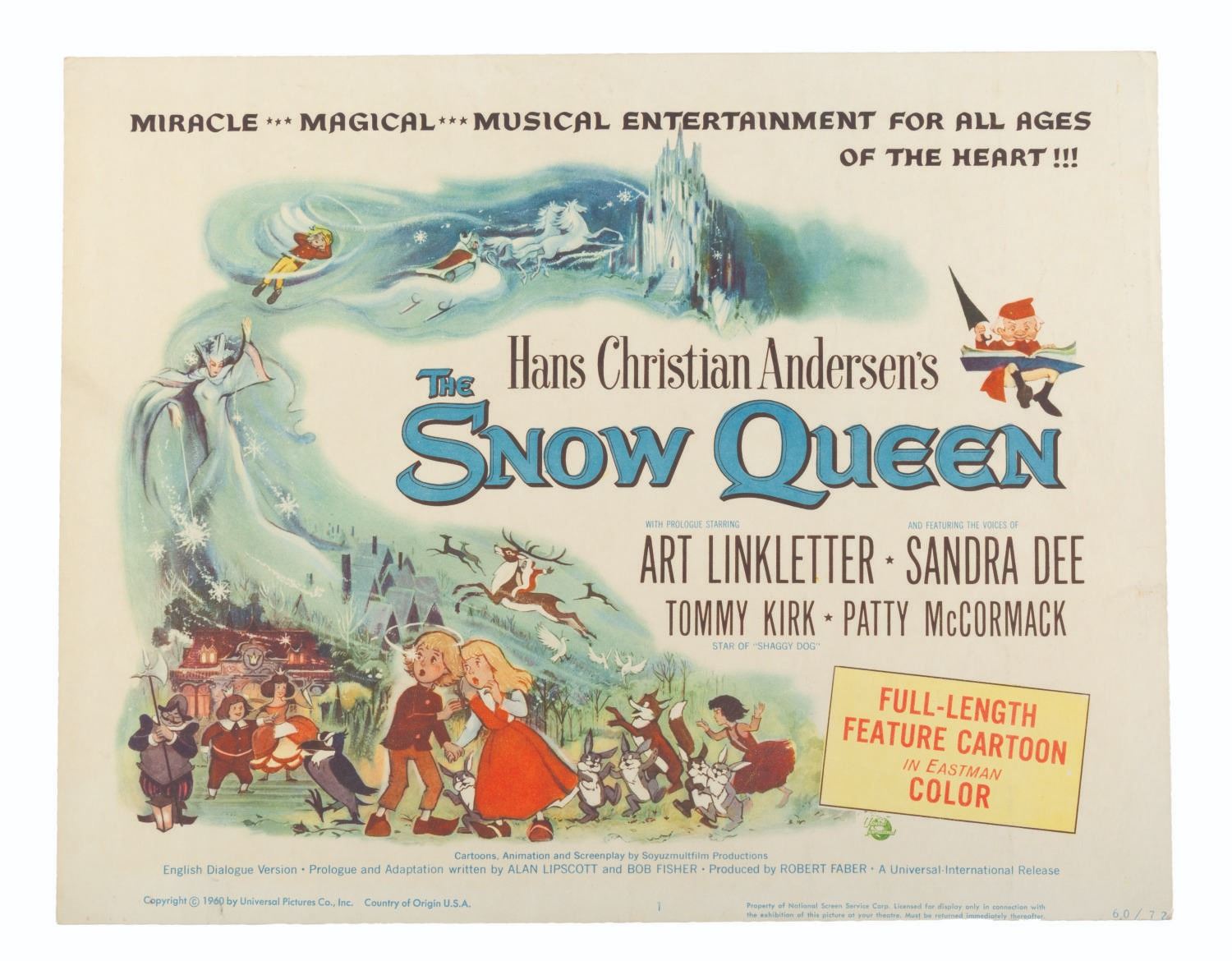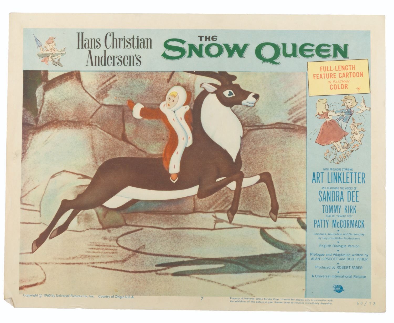 (Universal International, 1957) A set of eight lobby cards for the Soviet animated fantasy "The Snow Queen, " based on the Hans Christian Anderson fable of the same name. Measuring 11 " x 14 " each, the cards are in good condition with light discoloration, soiling, creasing, and pinholes.