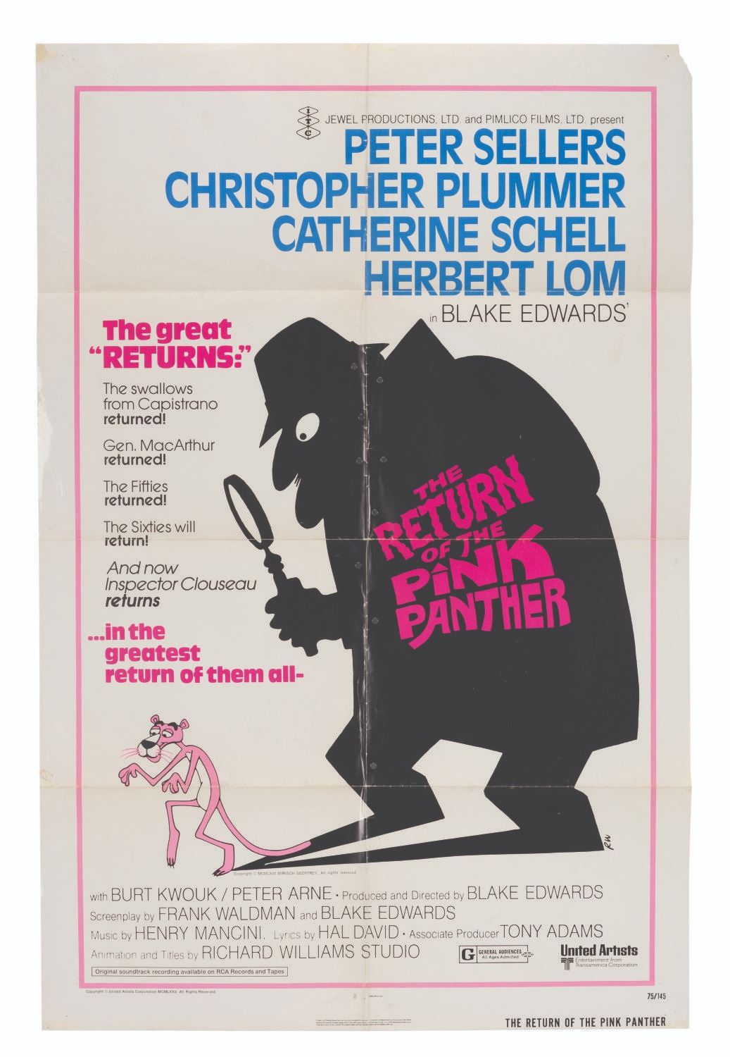 (United Artists, 1975) A one-sheet for the theatrical release of "Return of the Pink Panther, " with artwork by Richard Williams. Measuring 27 " x 41 ", the poster is in fair condition, with wear and creases along original folds, separation at center points, pinholes at corners, discoloration, tape residue, and 1.5 " tears in the left edge and top right corner.