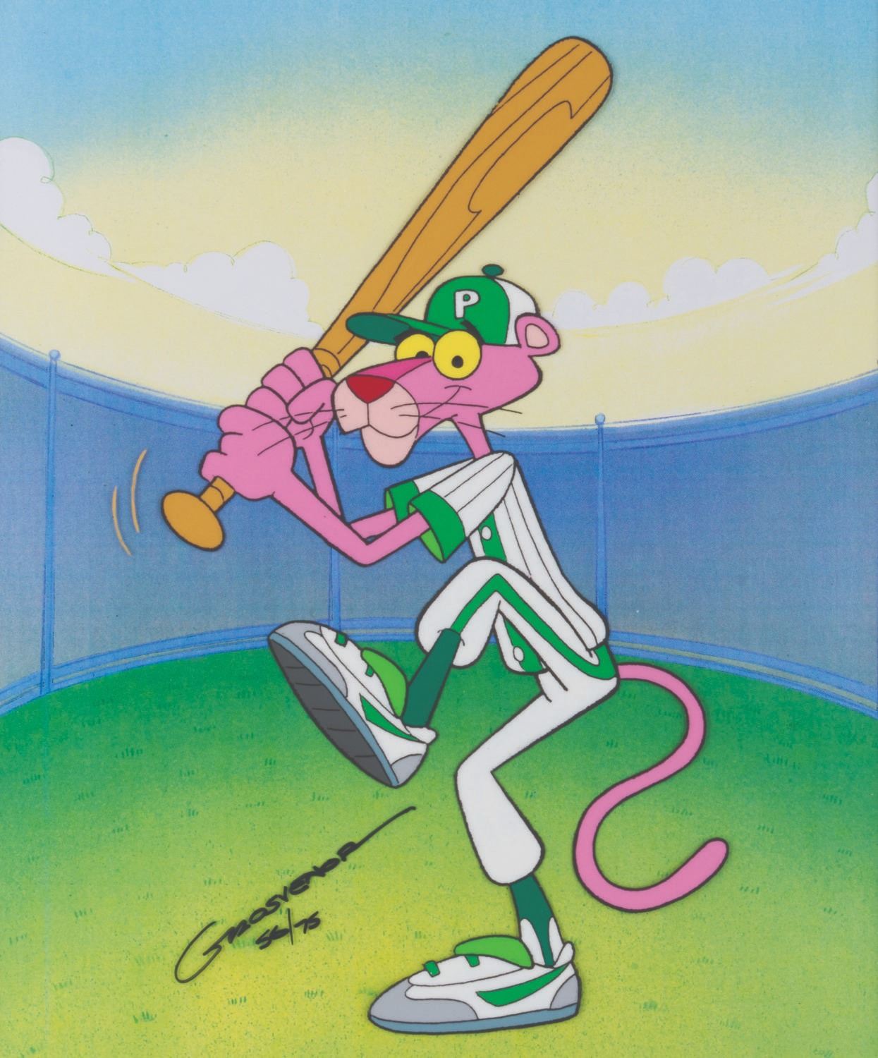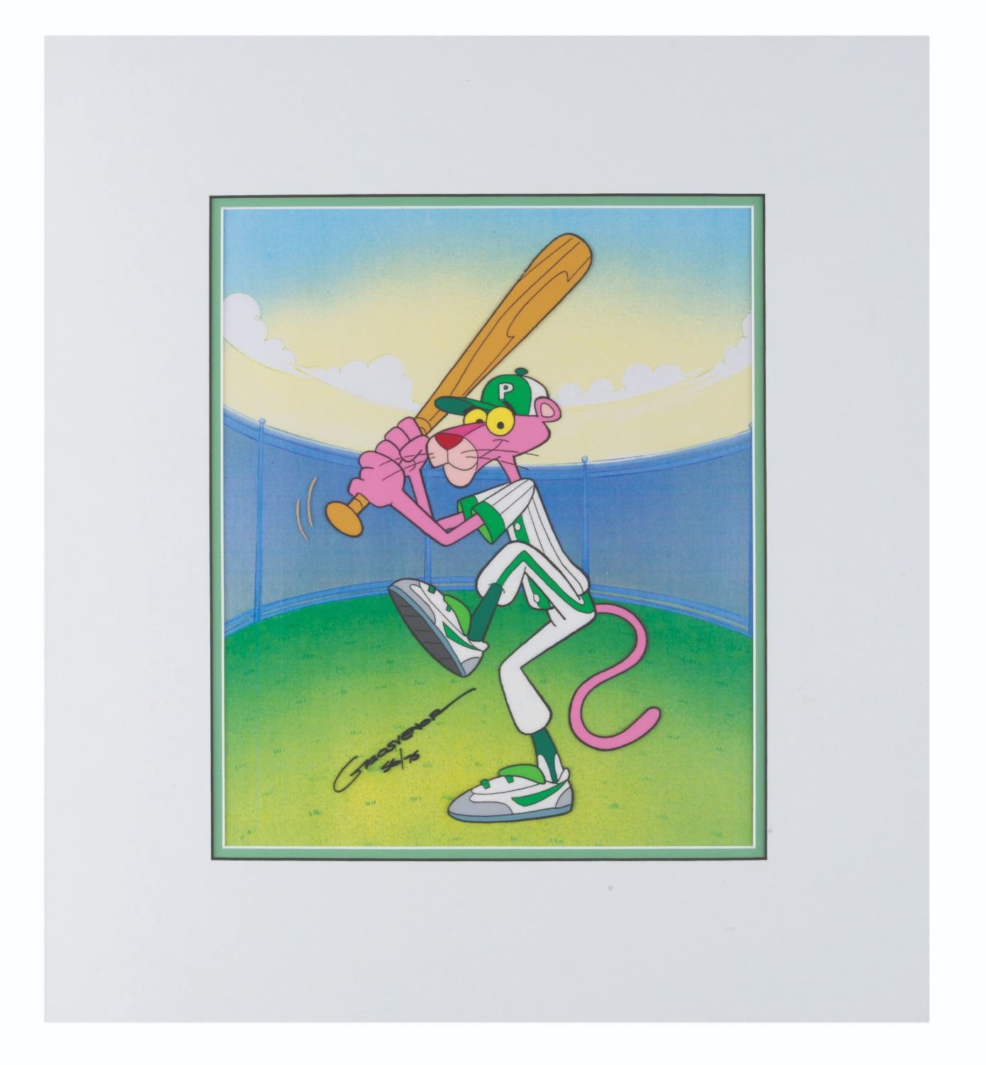 (DePatie-Freleng/MGM, 1993) A limited edition cel of the Pink Panther as a baseball player, signed by Charles Grovenor, the producer of "The New Pink Panther Show " in 1993. Numbered 56/75 and measuring 16 " x 18 " overall, the matted cel is in fine condition.