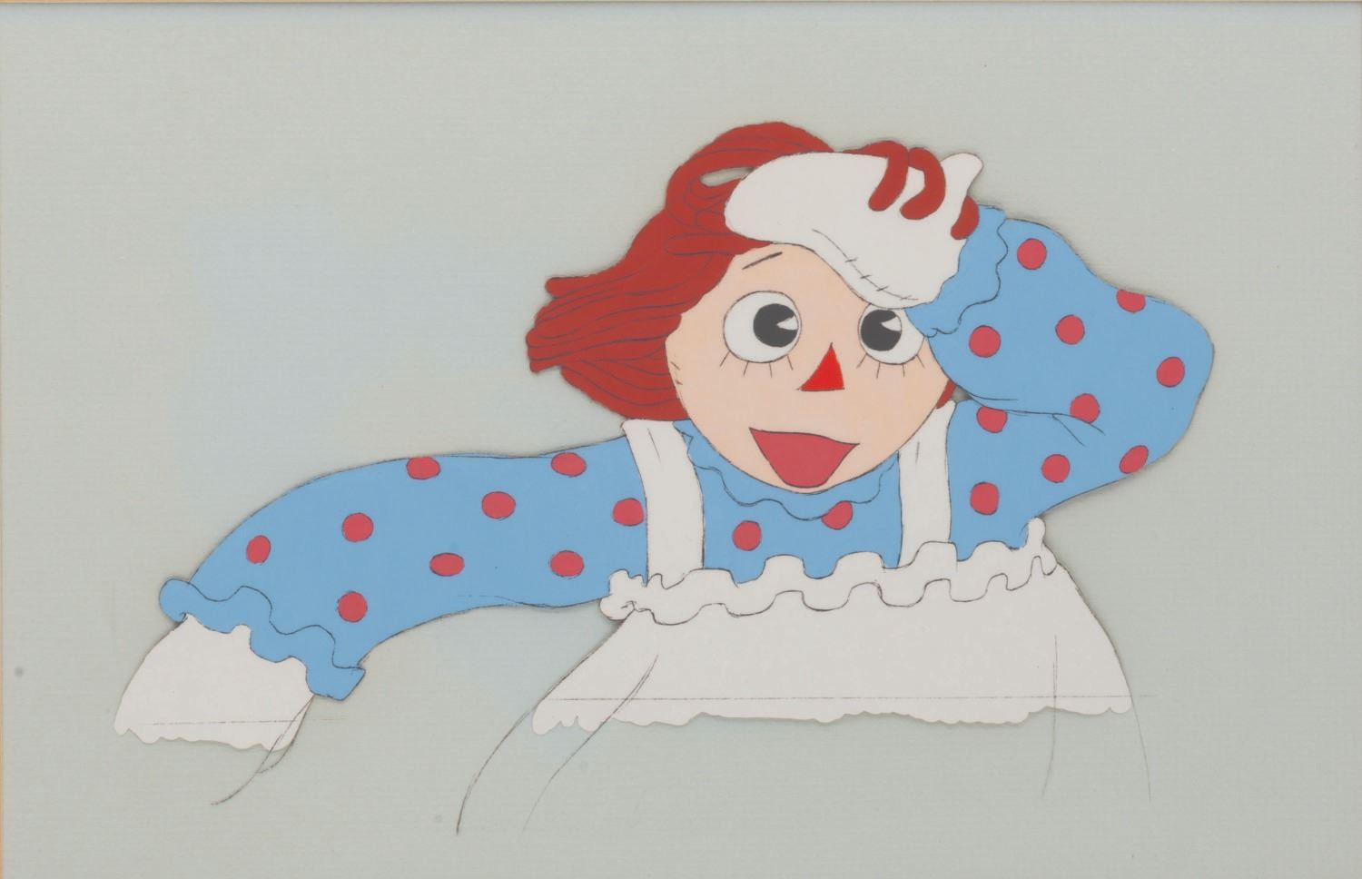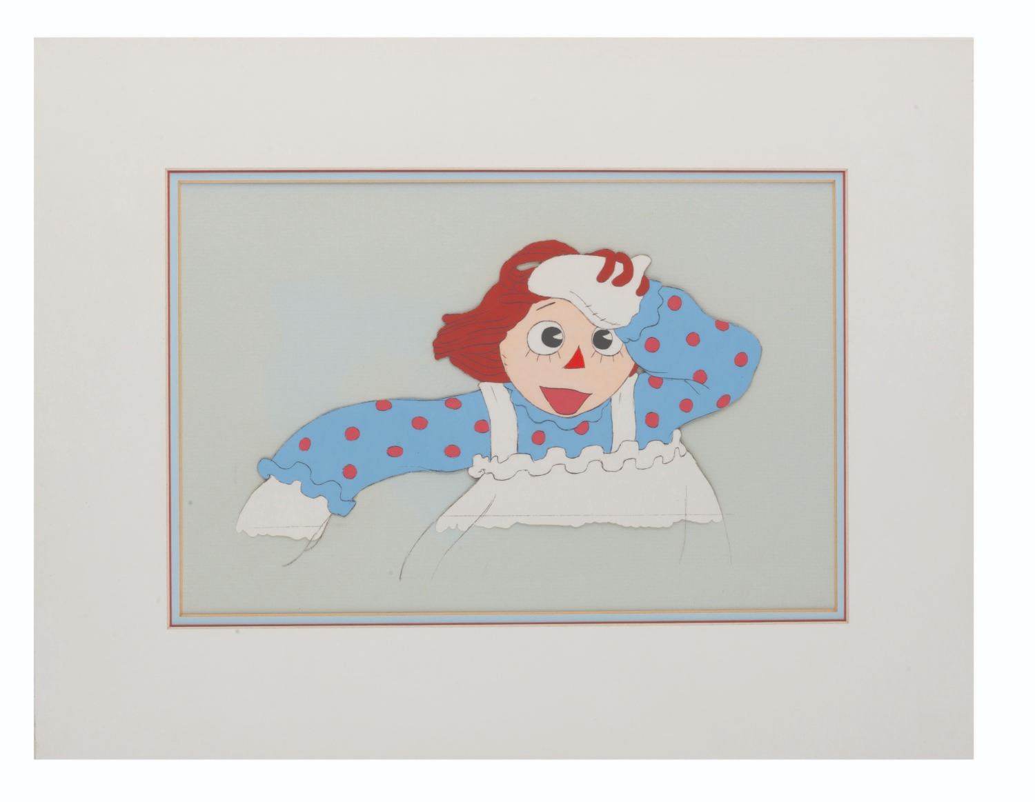 (The Bobbs-Merrill Company, Inc., 1977) An original production cel of Raggedy Ann from the animated musical "Raggedy Ann and Andy. " With a character size of 11 " x 6.25 " on the 18 " x 10.5 " cel, the piece is in very good condition, presented in a 15 " x 19.5 " matte.