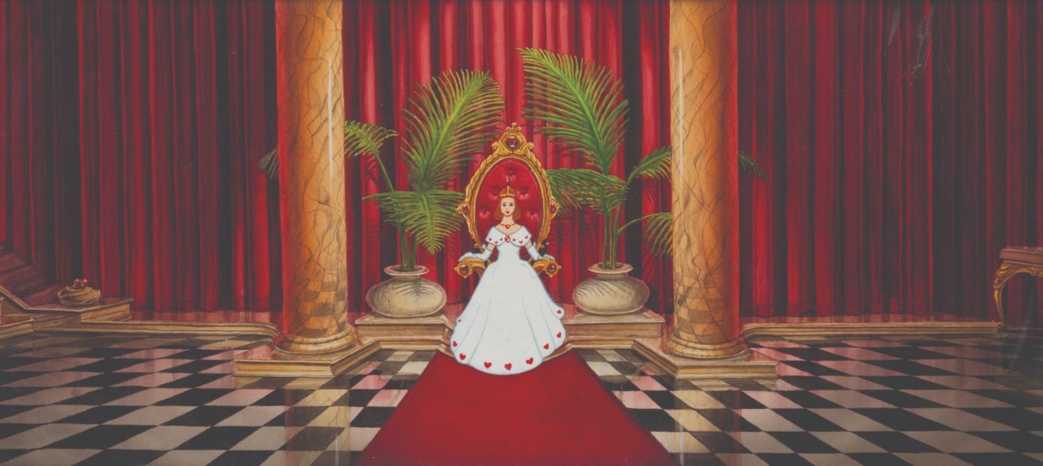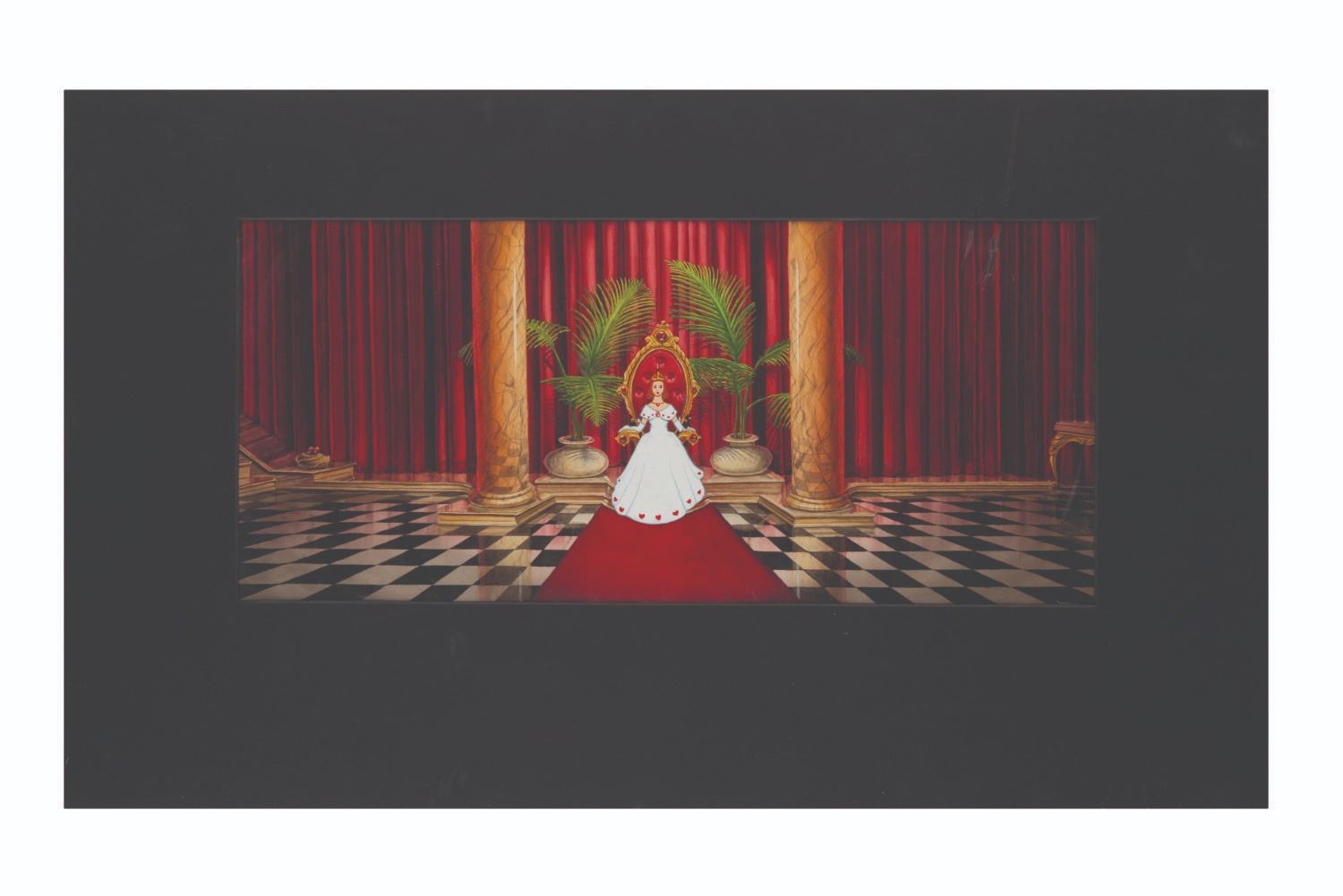 (MacVeigh, 1985) A test cel and background painting featuring Glinda from The Wizard of Oz by Rob Roy MacVeigh. MacVeigh was an active artist in the Oz fan club, with a dream of producing an animated feature about Oz, true to the original artists and authors of the books. With a visible image size of 8 " x 17.75 " in a 15 " x 25 " presentation matte, the art displays in good condition with a 2 " tear and scuff in the upper right corner of the cel, and scuffs and wear to the matte.