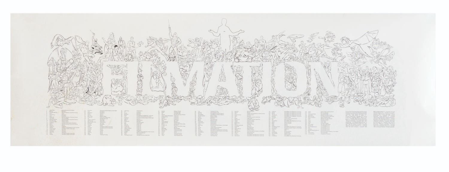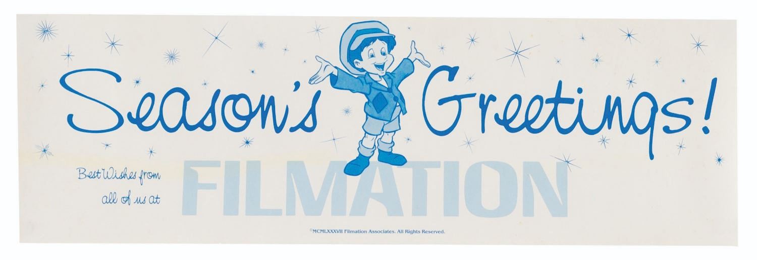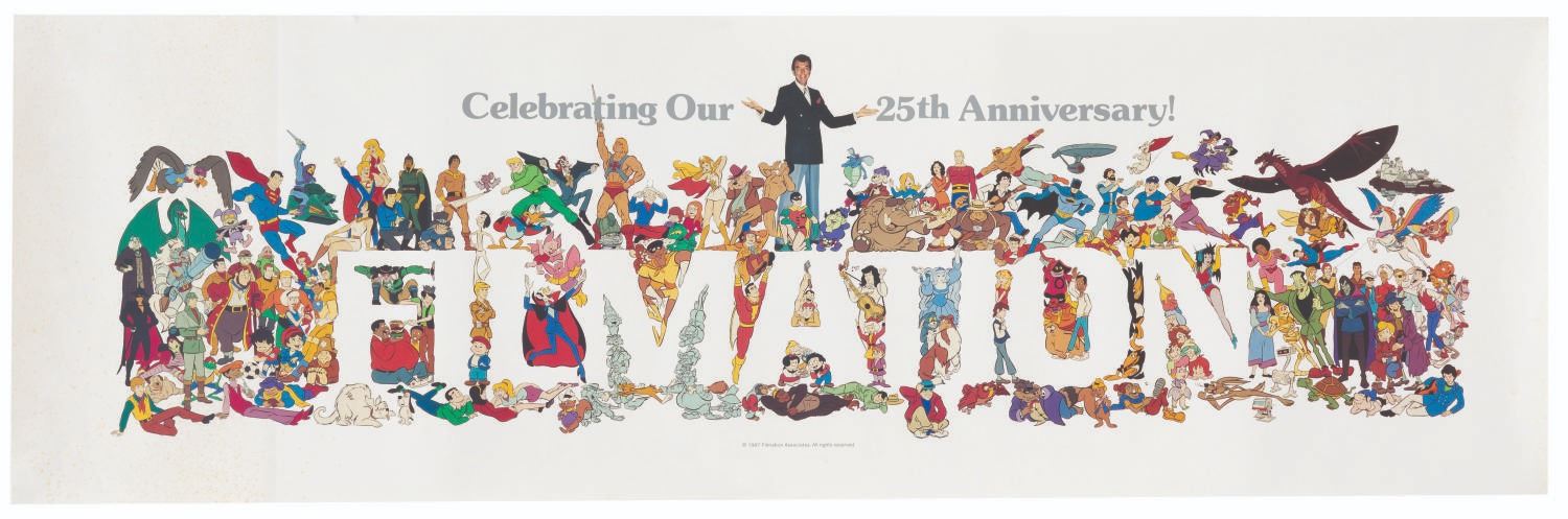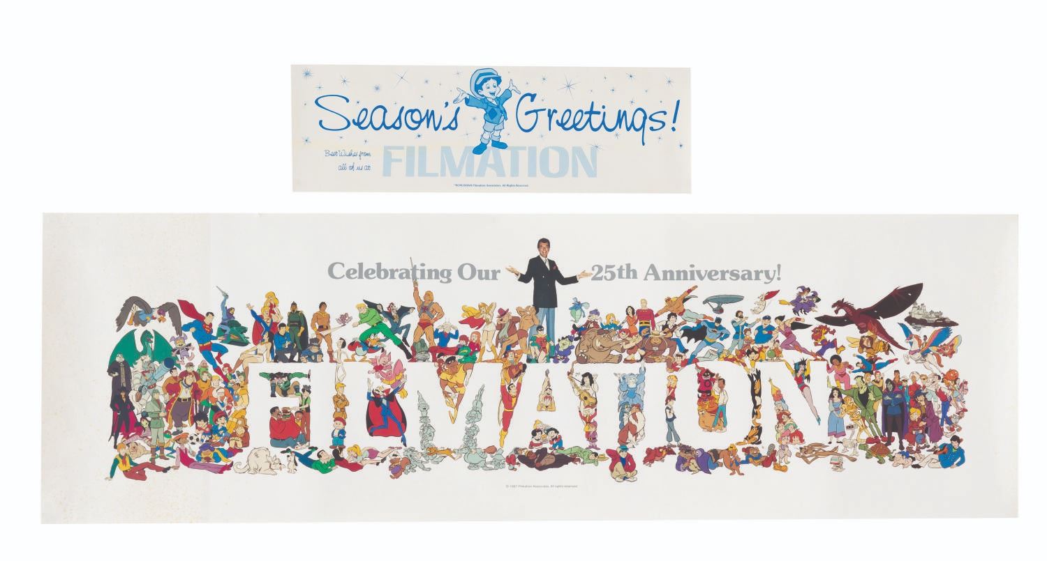 (Filmation, 1987) A poster celebrating the 25th anniversary of Filmation Associates, distributed as a holiday gift in 1987. The company, founded by Lou Scheimer, Hal Sutherland, and Norm Prescott, is known for its adaptations of Mattel Toy lines "Masters of the Universe, " and "She-Ra: Princess of Power, " and "Star Trek: The Animated Series. " The poster features all the characters from their series to date, with a key to their identities on the back. Also included is a 5 " x 15 " "Seasons Greetings " mini-poster. Measuring 12 " x 36 ", the poster displays in good condition, with light spotting in the first 6 inches from the left edge.
