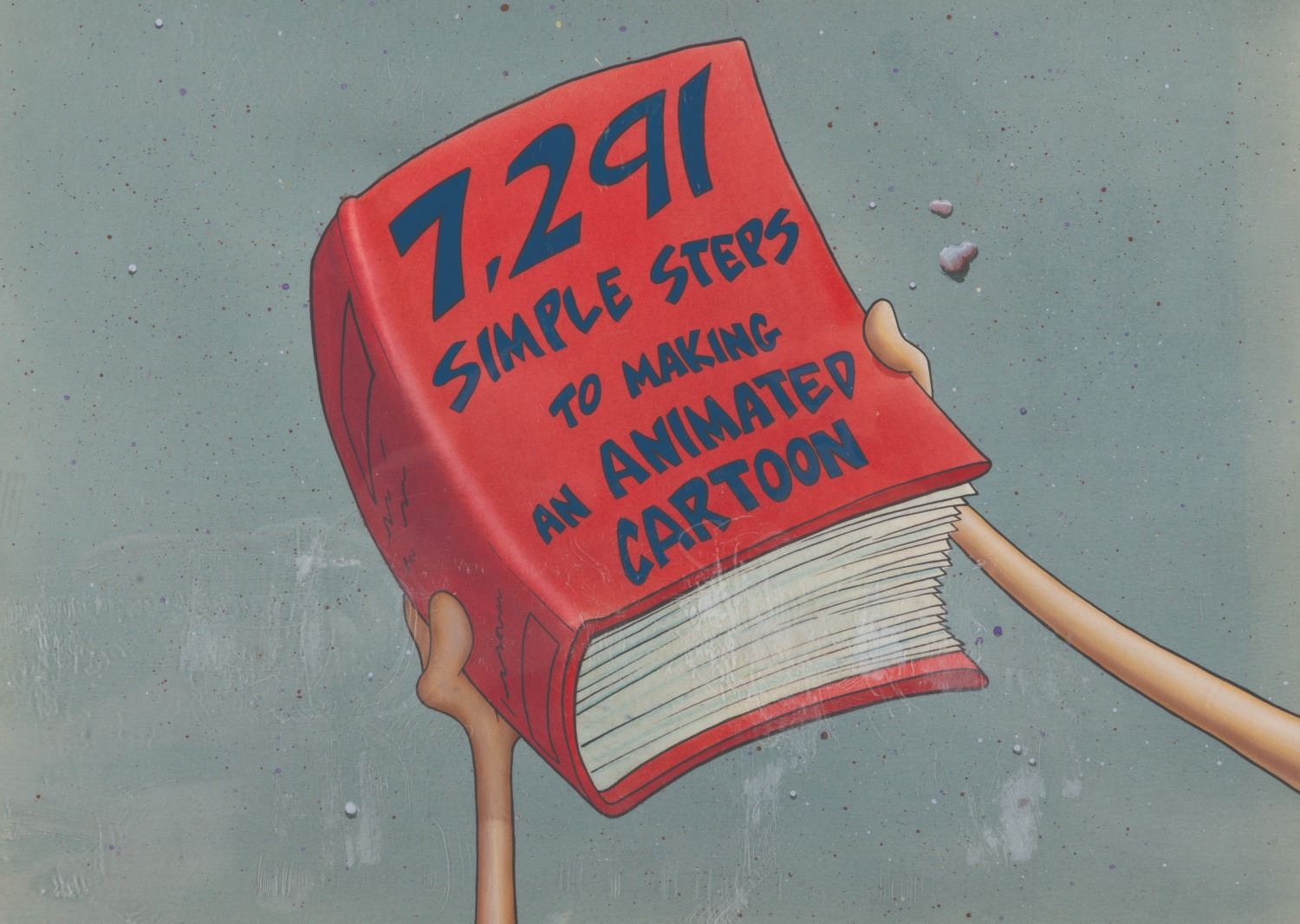 (Nickelodeon, 1996) A background from "Rocko's Modern Life " of Rocko holding a large book titled "7,291 Simple Steps To Making An Animated Cartoon. " This exact insert background appears to have been replaced with cel animation of the same book in the show, leaving this an unseen and more detailed alternate, signed by the artist Nick Jennings. Measuring 10.5 " x 12.5 ", the background is in very good condition, with scuffs to the clear protective overlay that do not affect the art.