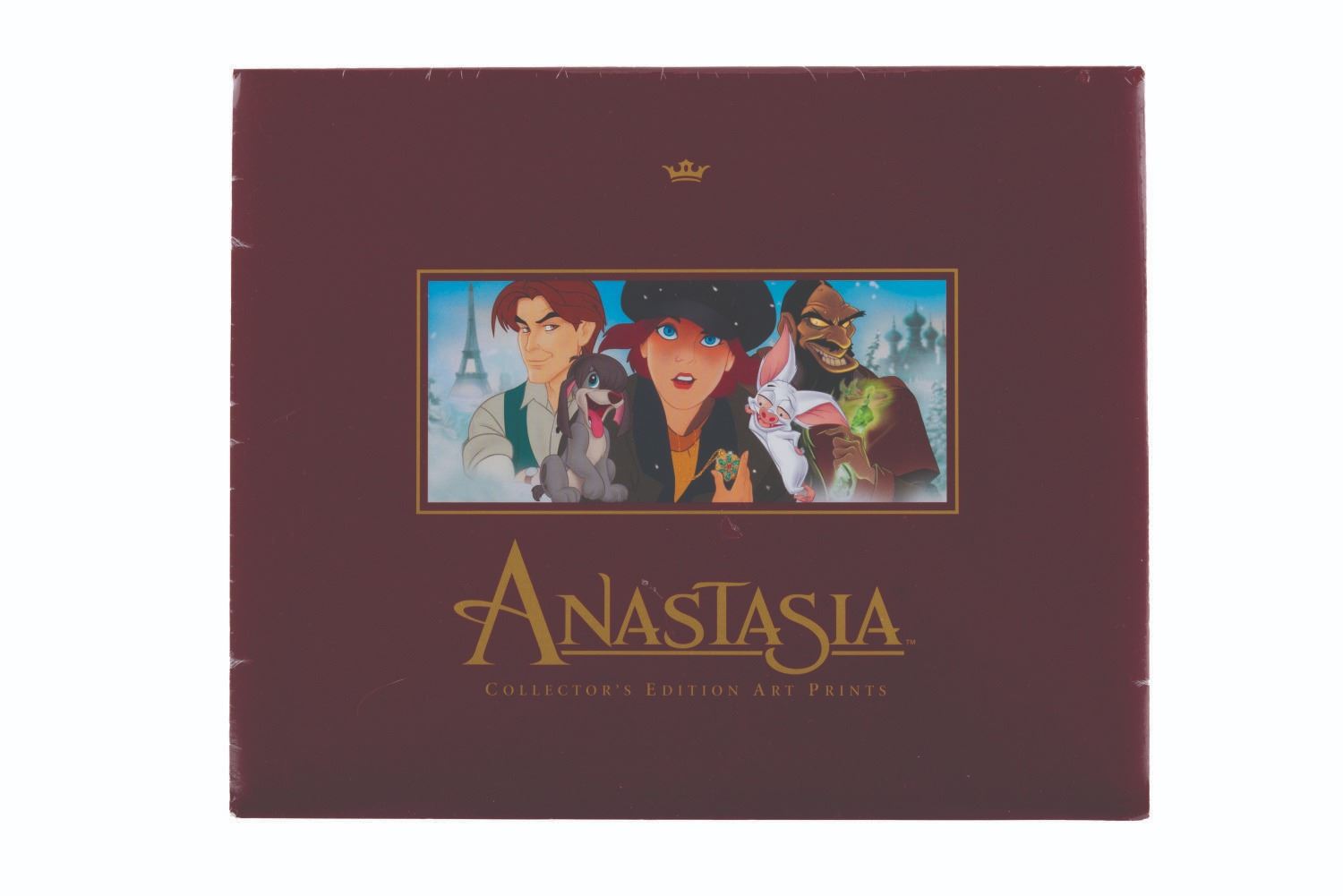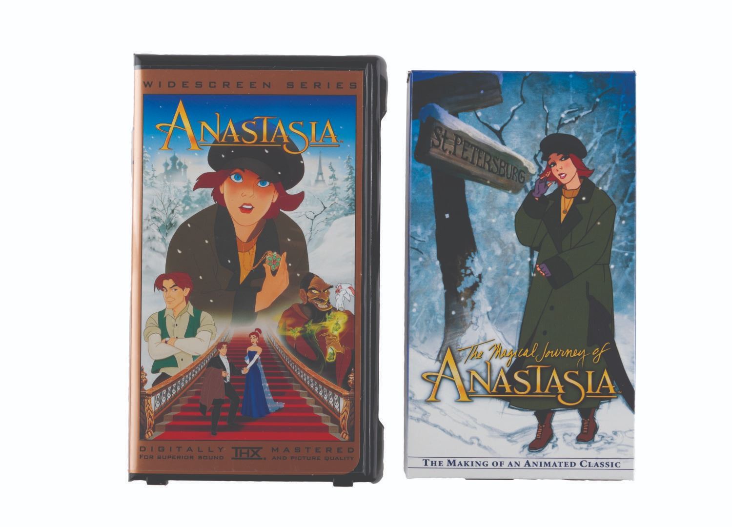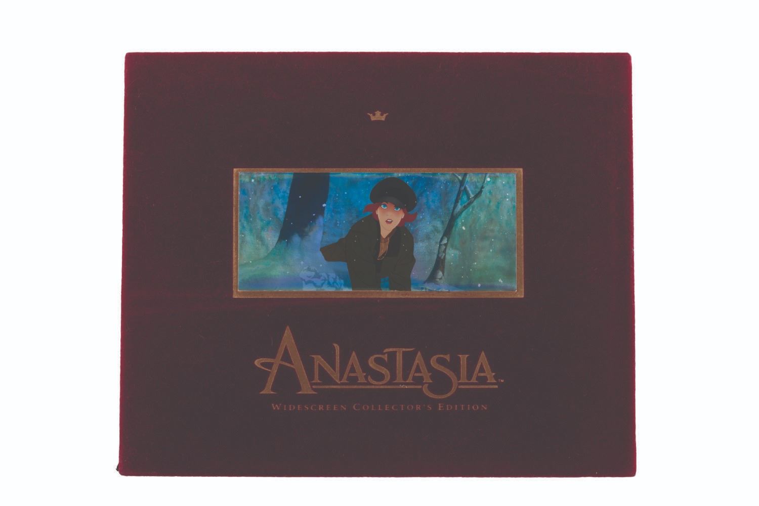 (20th Century Fox, 1998) A Collector's Edition VHS set of Don Bluth's animated musical "Anastasia. " Included are The Art of Anastasia book, collector's edition art prints, the script, a VHS of the film, and The Magical Journey of Anastasia: The Making of An Animated Classic VHS. Ranging in size from the 4.25 " x 7.5 " VHS to the 9 " x 11 " book and housed in an 11.5 " x 2.5 " x 9.5 " velvet box, the set is in very good condition with light handling wear.
