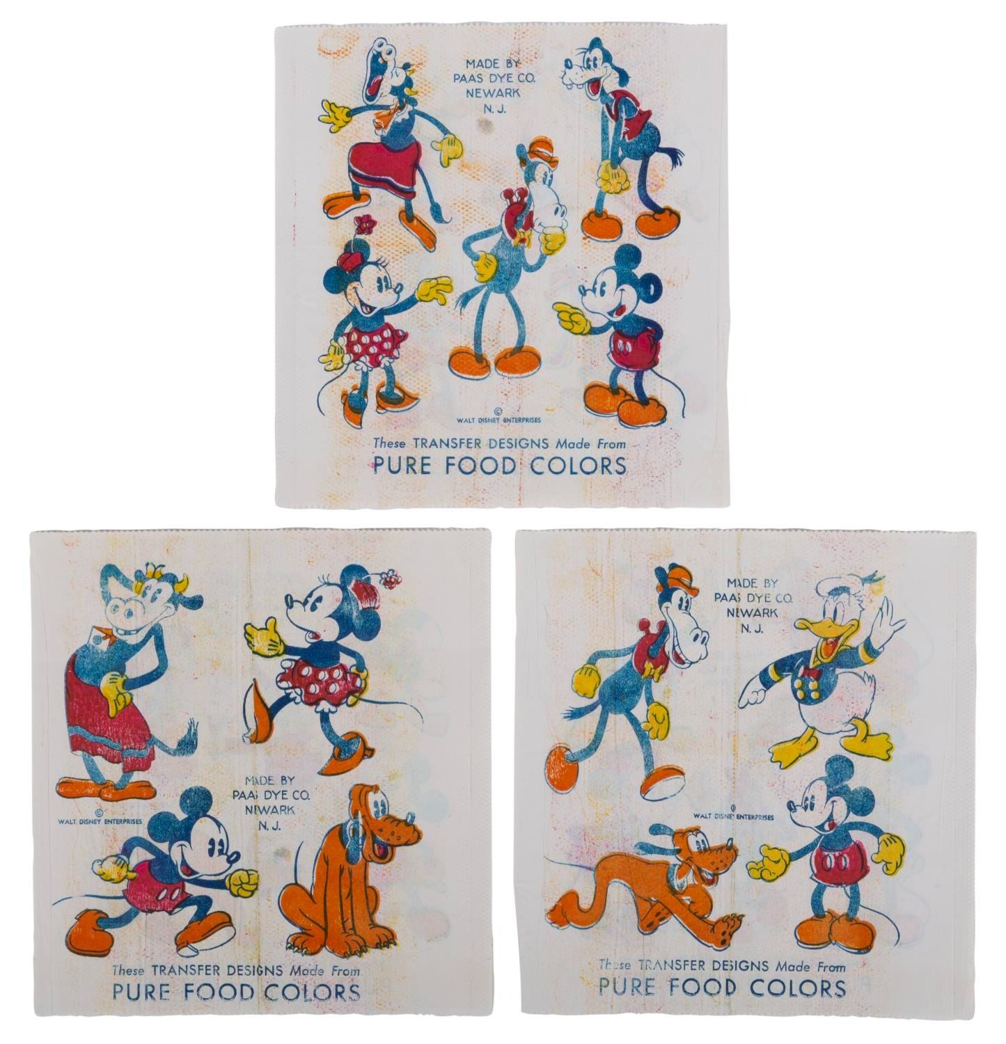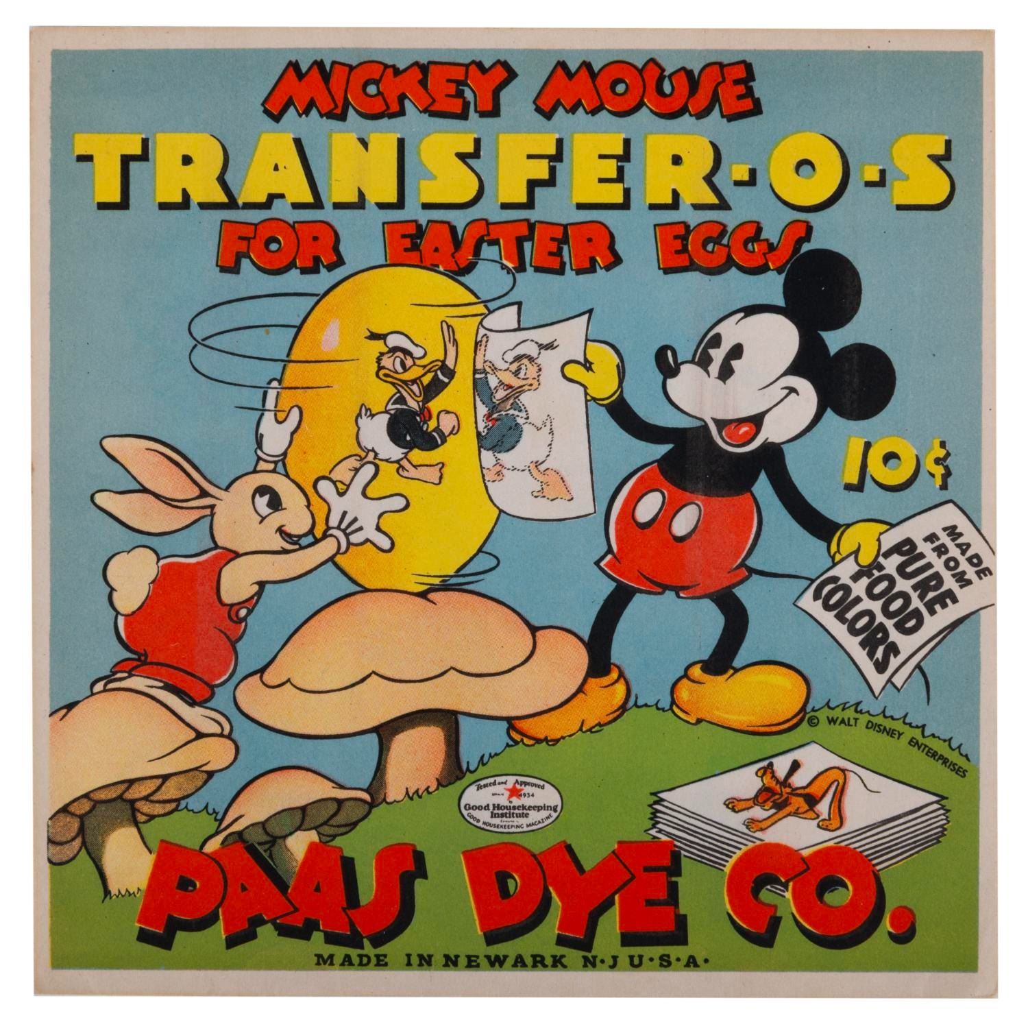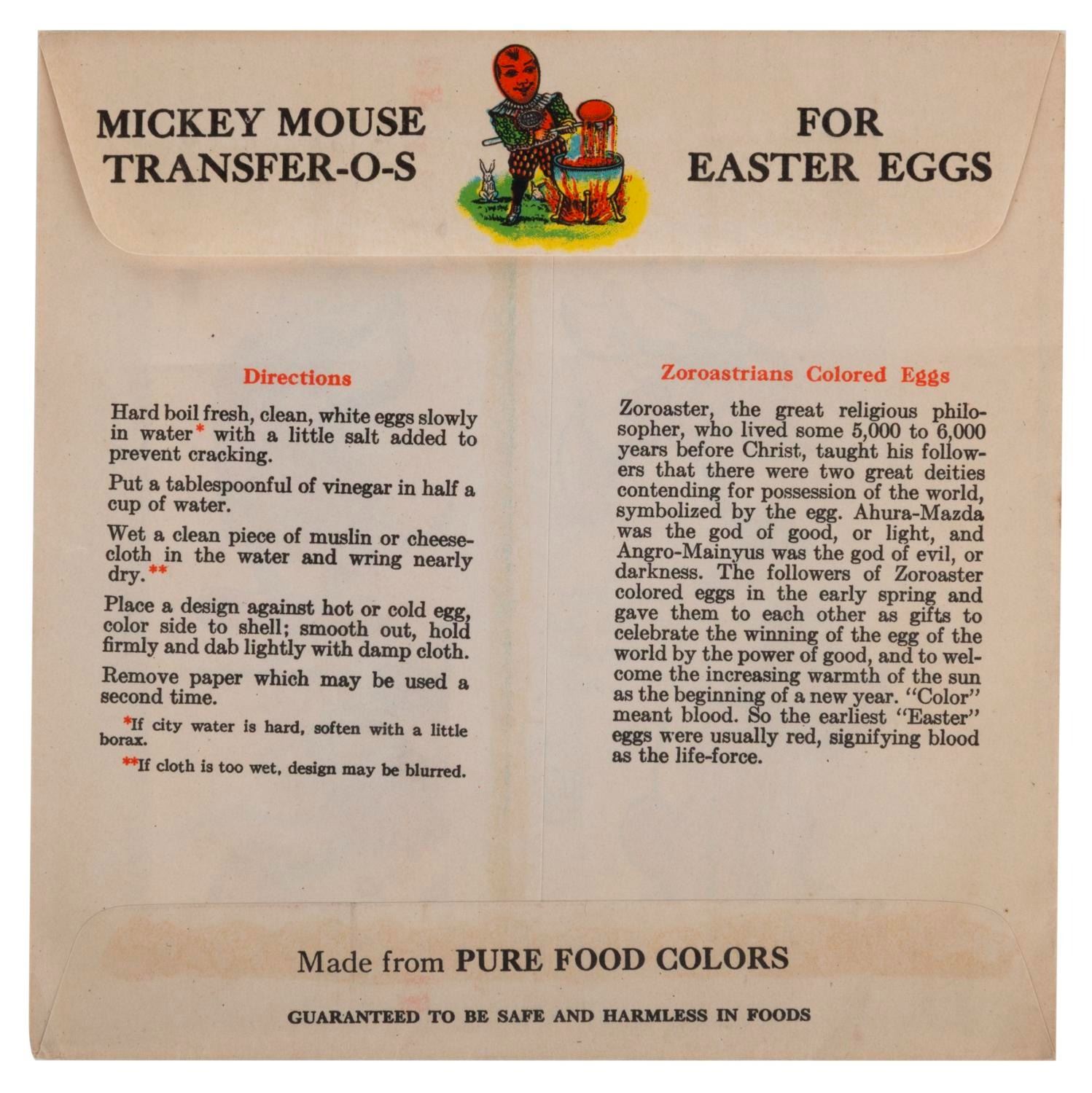 (PAAS, 1930s) A pack of Mickey Mouse Transfer-O-s for decorating Easter Eggs. Included are four folded sheets with 37 images of Mickey, Minnie, Donald, Horace Horsecollar, and other early characters that can be applied to eggs. Measuring 5.75 " x 5.75 ", the set displays in very good condition with discoloration from age, wear, and heavy ink bleed on the transfers from age.