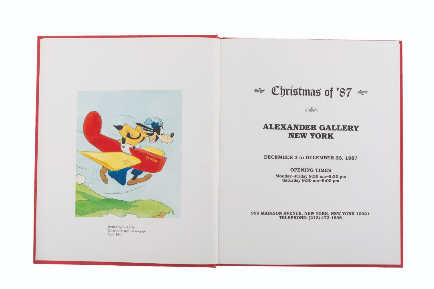 (Alexander Gallery, 1987) A hardcover catalog of Christmas of ‘87, the Alexander Gallery’s exhibit of original Disney Good Housekeeping Art in New York City, Dec. 1987. In 1934, Good Housekeeping and the Walt Disney Studios joined to have the Studio supply for each issue a single page Children’s feature, including characters from Disney cartoons. Good Housekeeping felt it would increase sales, and Disney liked a permanent advance publicity piece for its latest cartoon shorts. From 1934 until 1944, Disney created and supplied artwork for a page in each issue of the magazine. The pages are considered some of the finest character artwork of the time, and this exhibit displayed all known surviving original paintings. Measuring 8.75 " x 10.75 ", the hardcover catalog is in fine condition.