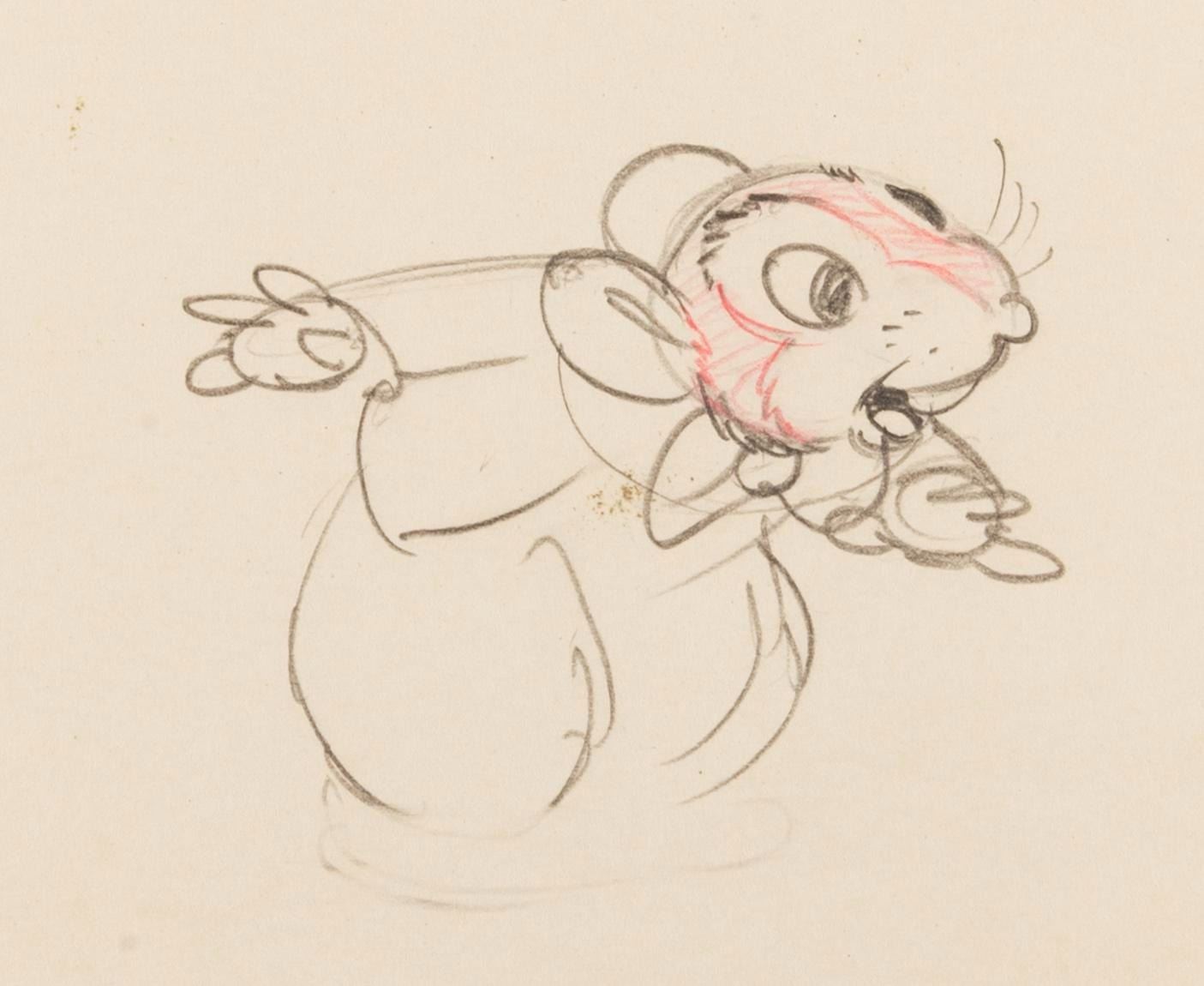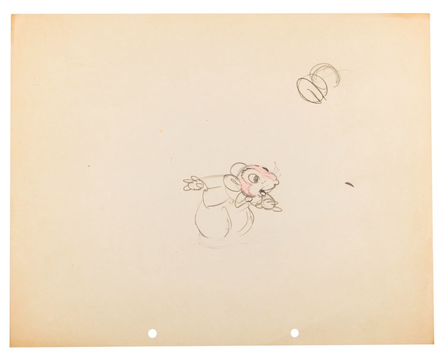 (Disney, 1934) An original production drawing of the little mouse from the Silly Symphony short "The Flying Mouse. " The mouse has an image size of 2.25 " x 2.75 " on 10 " x 12 " animation paper. The graphite and color drawing is in very good condition with light creasing, discoloration, and pencil marks from production.