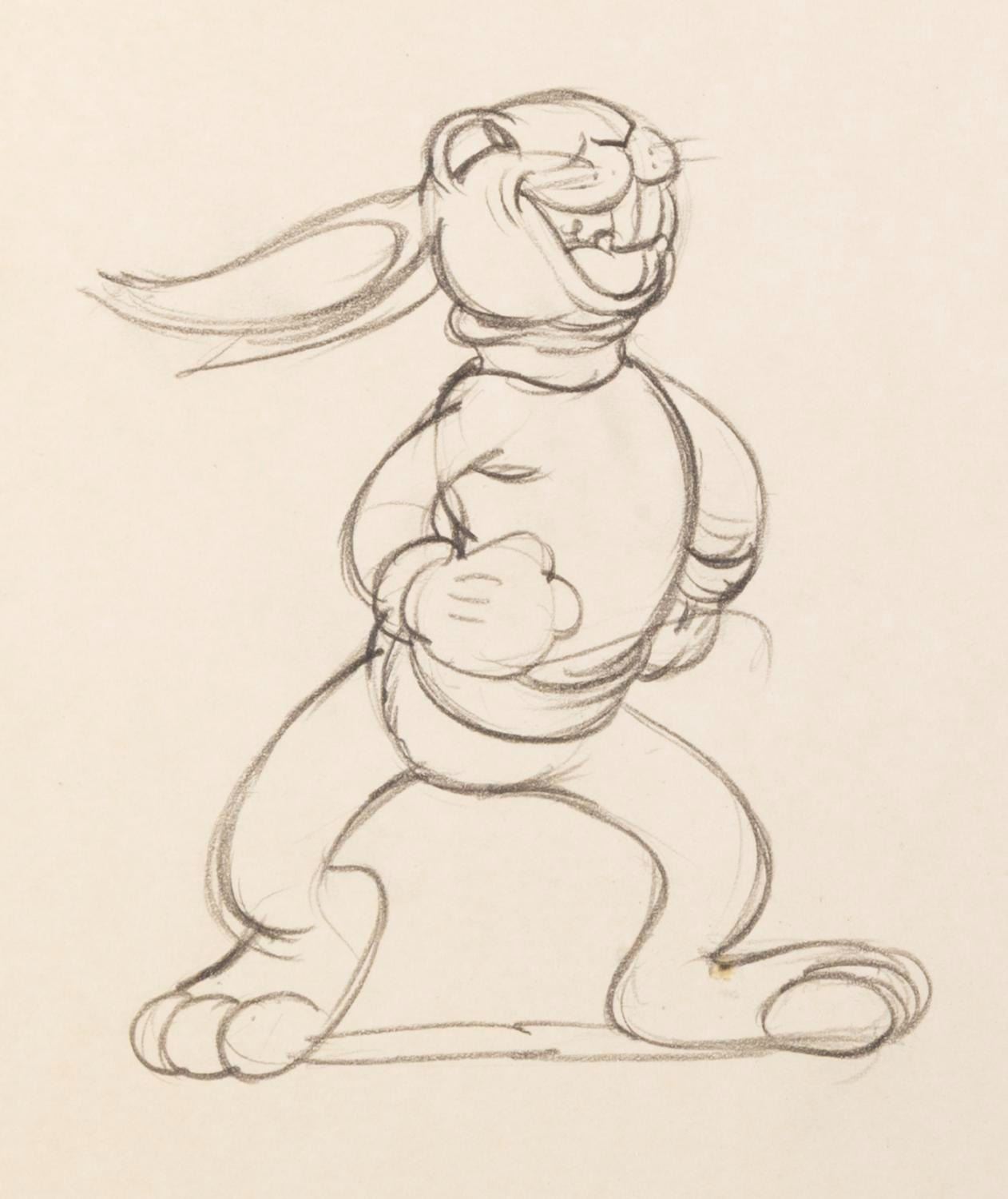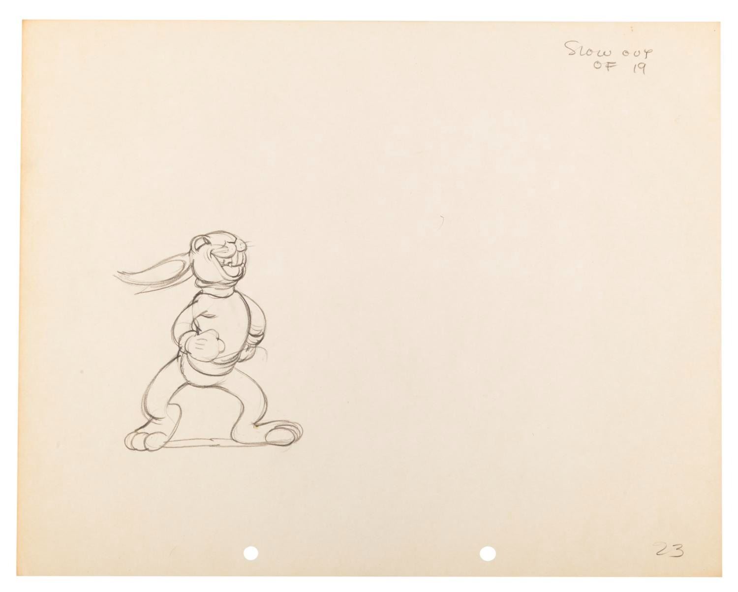 (Disney, 1936) An original production drawing of Max Hare from the Silly Symphony short "Toby Tortoise Returns. " Max has an image size of 3.25 " x 3.75 " on 10 " x 12 " animation paper. The graphite drawing is in very good condition with light creasing and discoloration.