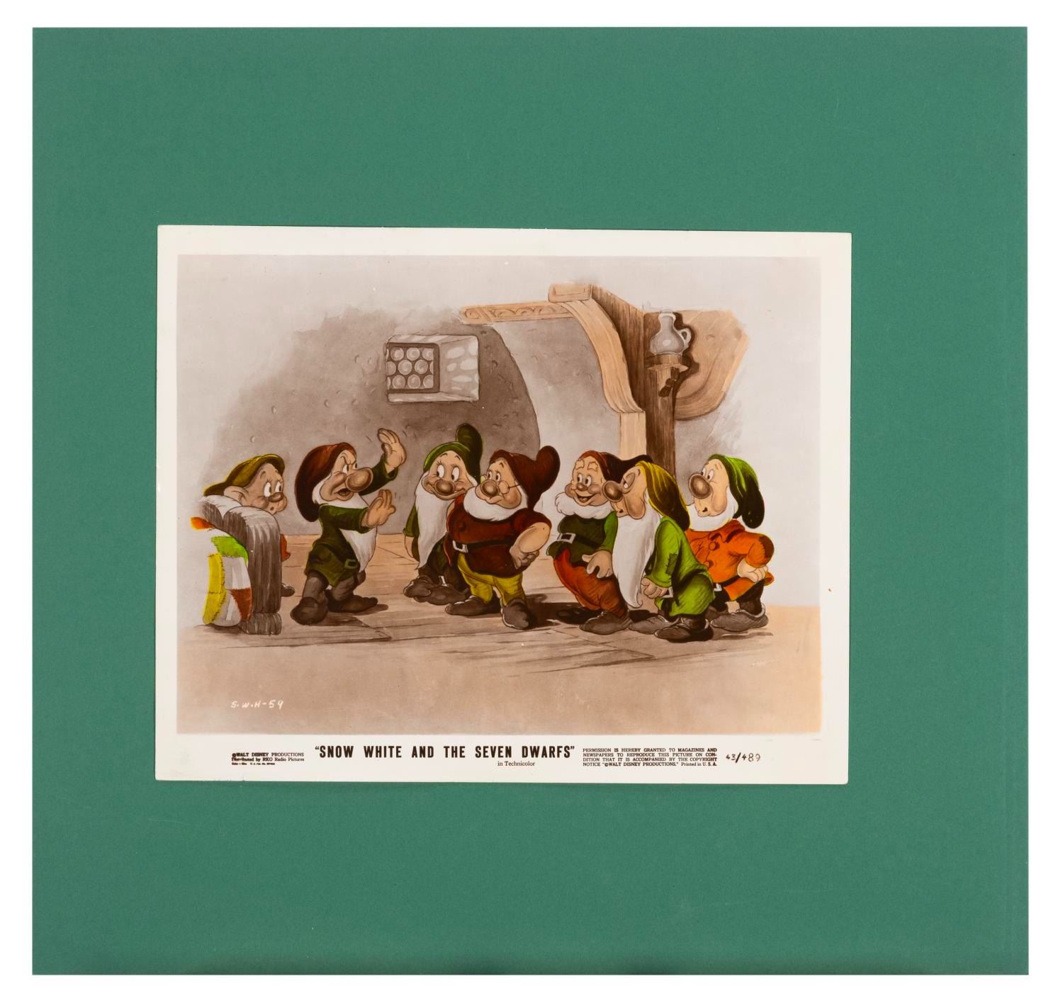 (Disney, 1943) A publicity photo from the first re-release of "Snow White and the Seven Dwarfs. " Measuring 8.25 " x 10.25 " adhered to a 14 " x 14.5 " board, the publicity photo is in good condition with scratches, creases, and wear.