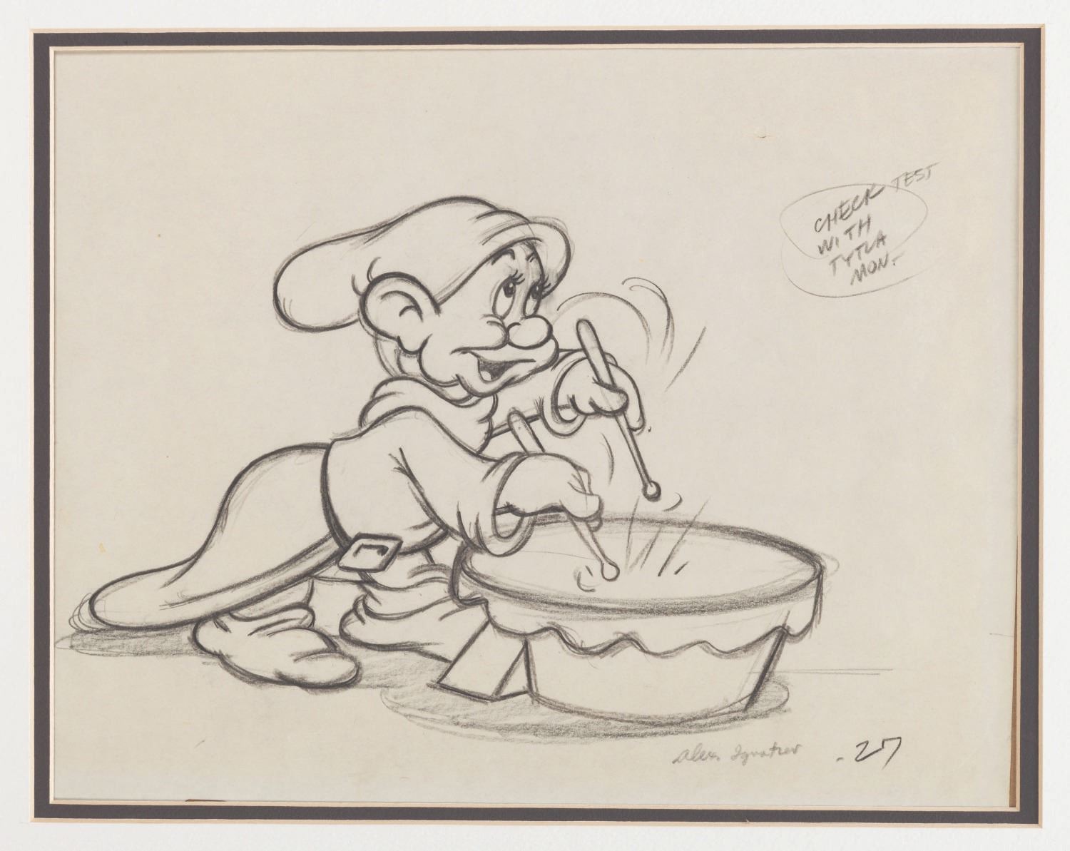 (Disney, 1950s-60s) An original gift drawing of Dopey playing a drum, signed by Alex Ignatiev. A longtime Disney animator, Ignatiev worked on "Pinocchio, " "Peter Pan, " and "Alice in Wonderland. " The drawing also features the note "Check test with Tytla Mon. " which refers to "Snow White and the Seven Dwarfs " animator Bill Tytla. Dopey measures 8 " x 10.5 " on a 12.5 " x 15.5 " animation paper mounted to a 16 " x 20 " matte. The drawing is in very good condition with a small hole in the top right corner and light wear. The matte exhibits light soiling and discoloration.