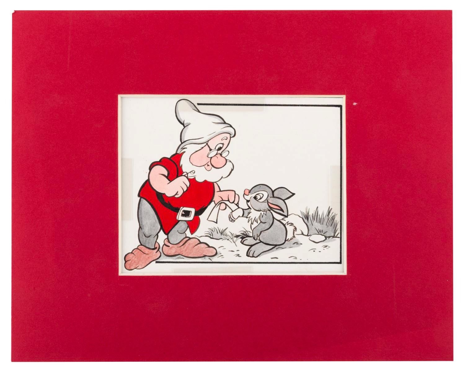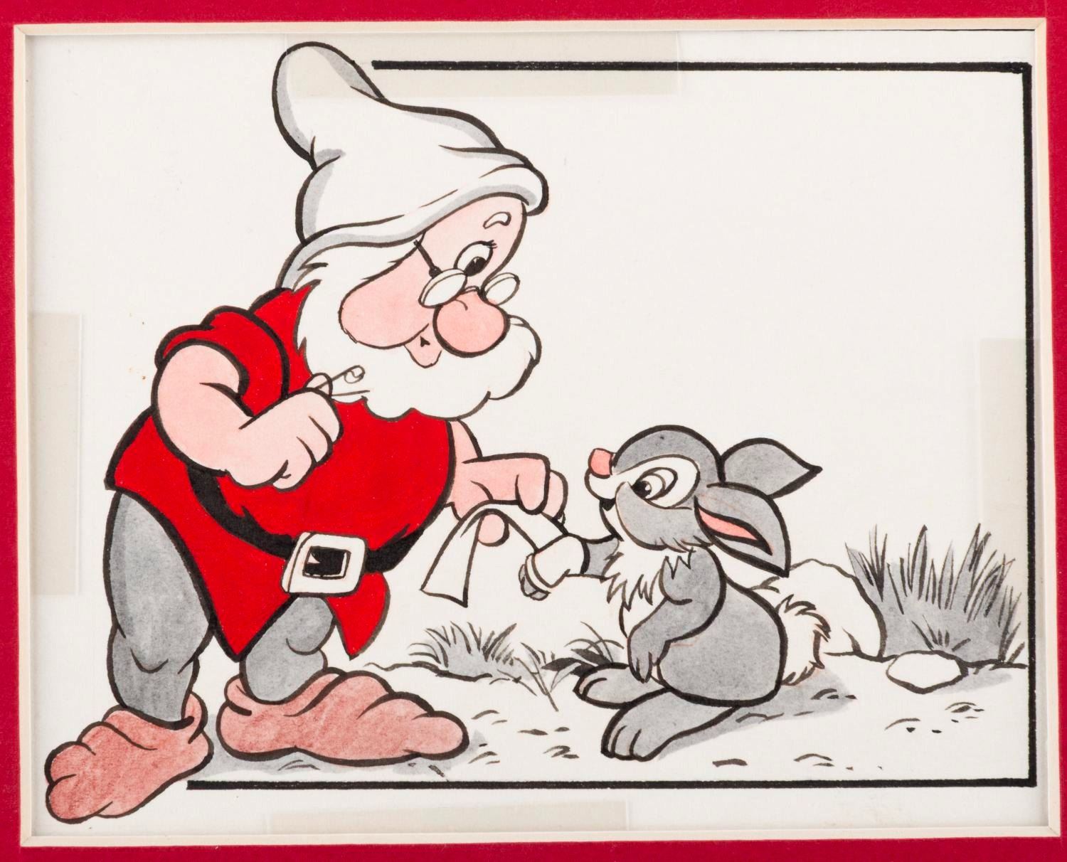 (Disney, 1970s-80s) An original production drawing of Doc from "Snow White and the Seven Dwarfs " created for a book or magazine. Measuring 4 " x 5 " and 8 " x 10 " matted, the painting is in very good condition with light wear from production, including soiling and discoloration.