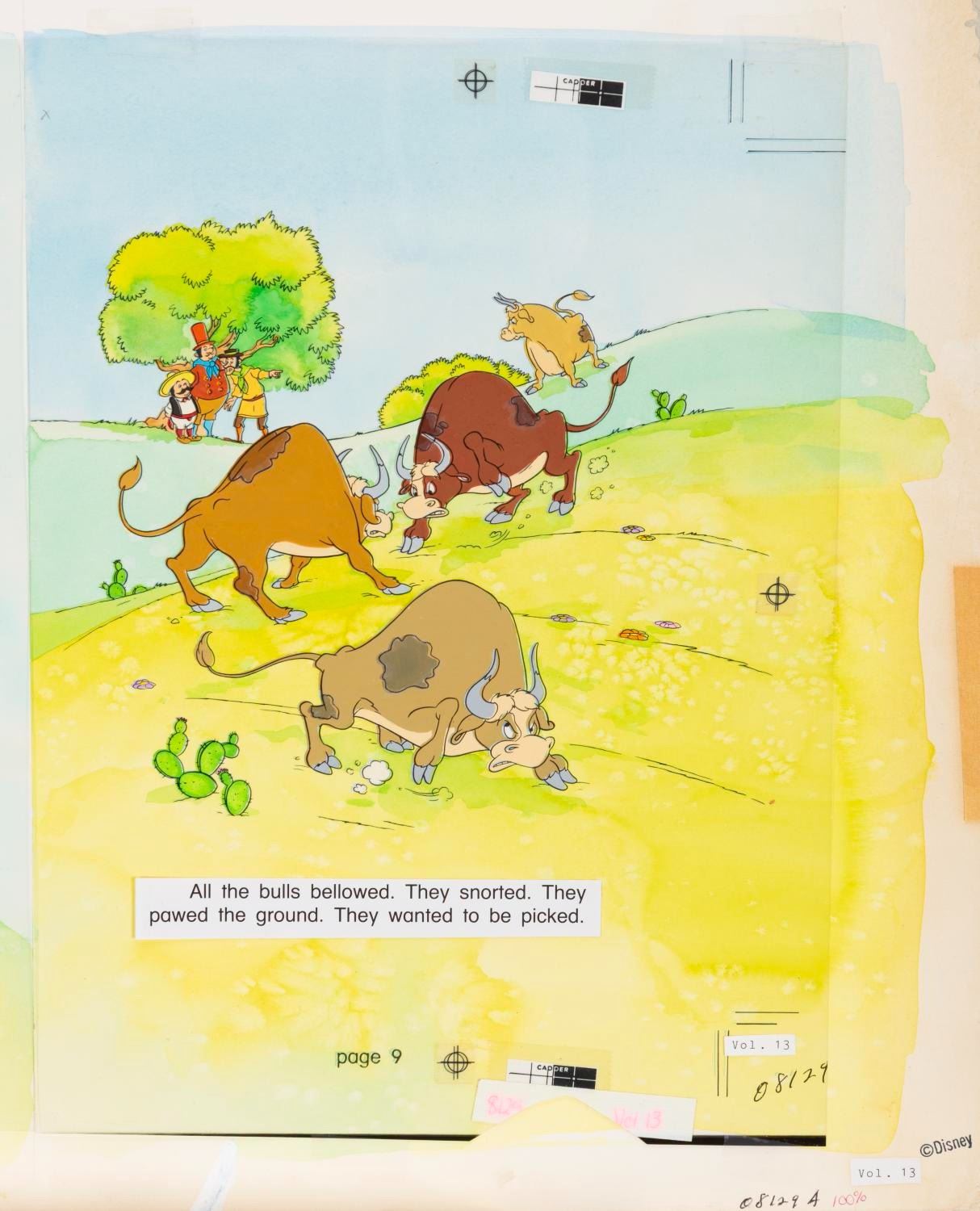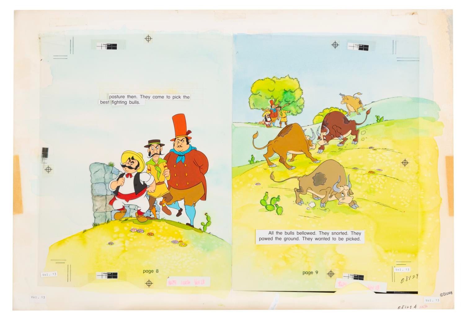 (Bantam, 1986) The original art for two pages of "Ferdinand and the Bullies " published as volume 13 of the Walt Disney Fun-to- Read Library. The art is accomplished in watercolor on artboard, with a black line overlay and text paste-ups on top. Measuring 15 " x 22 " overall, the art is in very good condition with wear mainly outside of the image borders, typical of production use, and art of the text on the left-hand page missing.