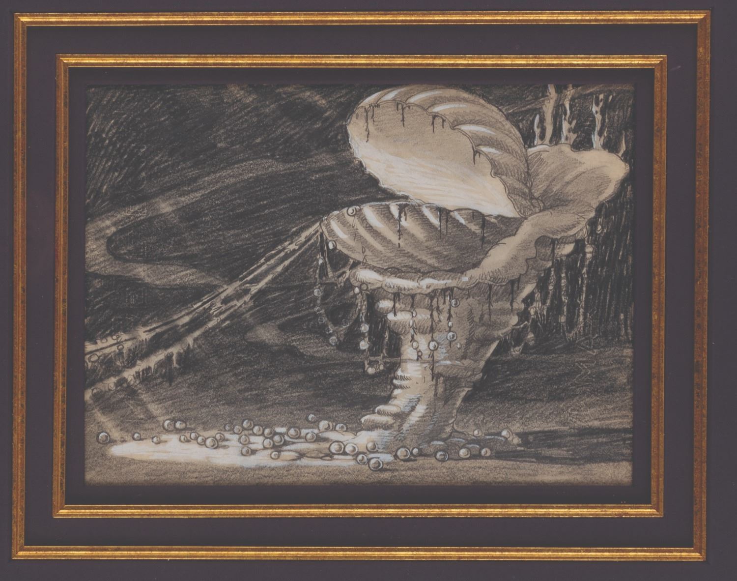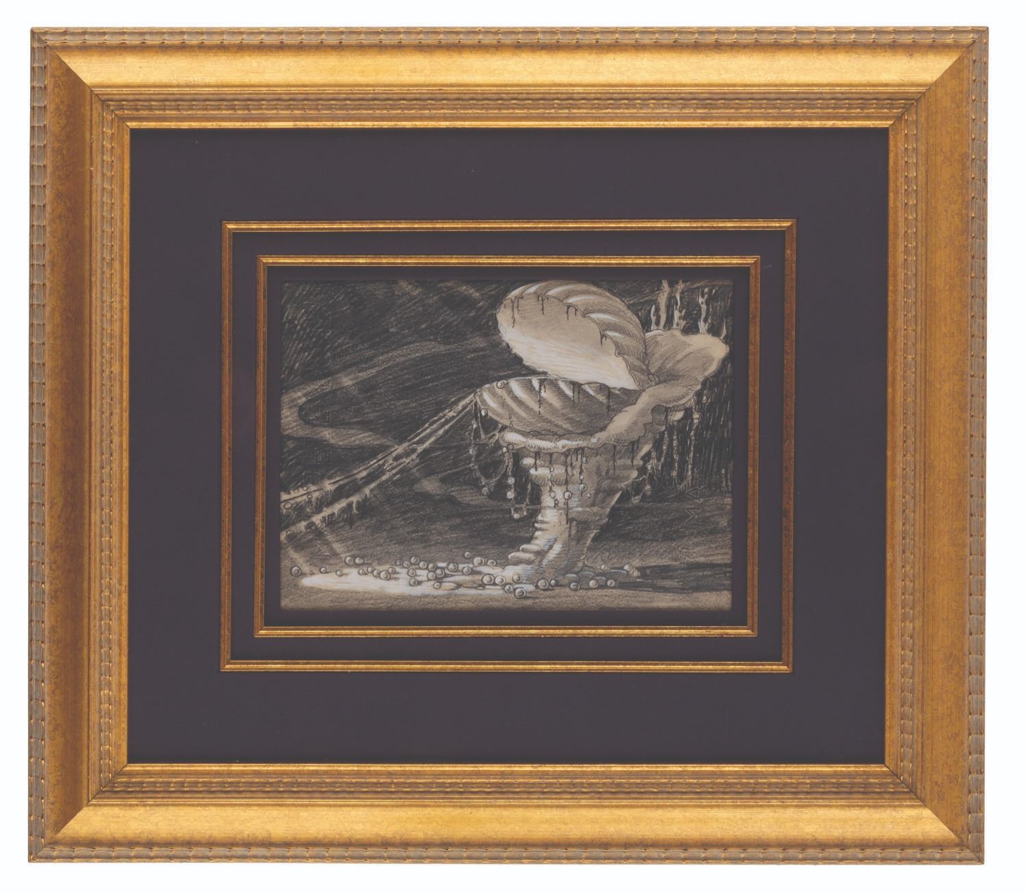 (Disney, 1938) An original concept drawing from the 1938 Silly Symphony short "Merbabies. " The short film featuring baby mermaids playing in the surf was created in collaboration with Harman and Ising animation studios, which had previously worked with Disney on "Snow White. " The graphite and paint drawing is accomplished on Maxwell-Bond paper and is expertly framed with a multi-layer matte. The drawing measures 7.25 " x 10 " visible in an 18.5 " x 21.5 " frame and is in fine condition with very light scuffing to the glazing.