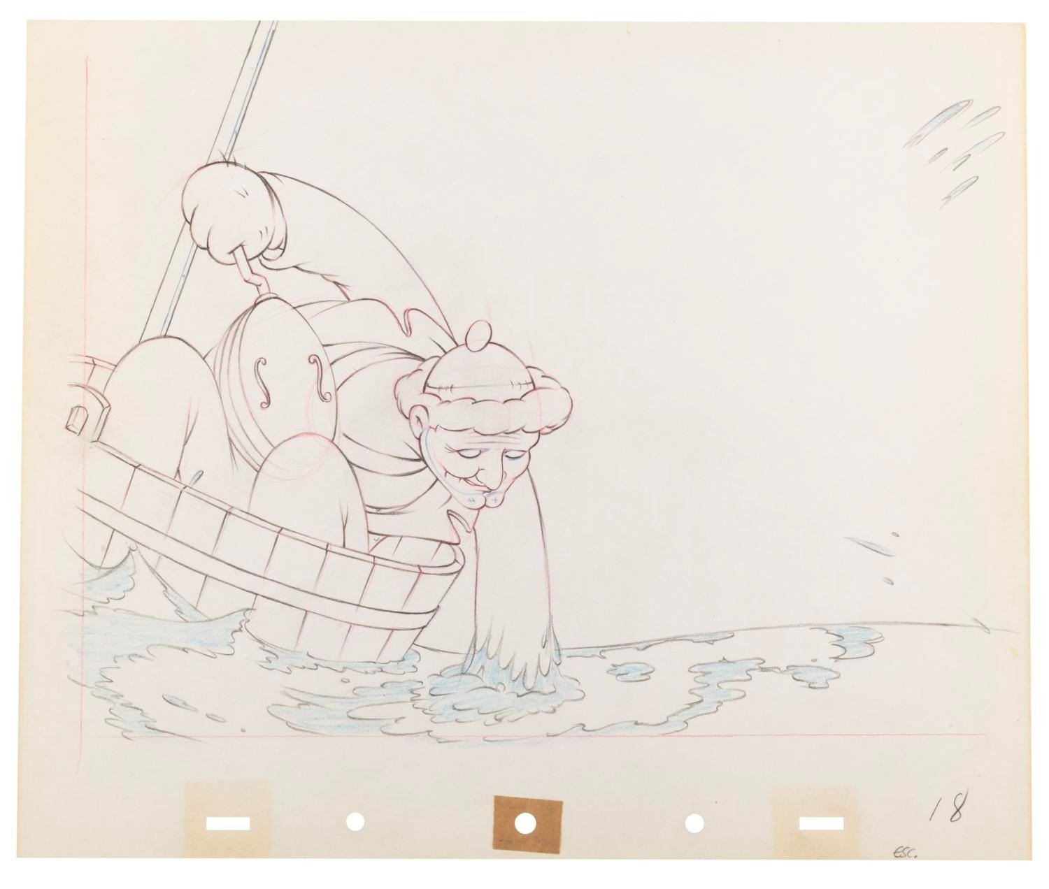 (Disney, 1938) An original production drawing of Spencer Tracy from the Three Men in a Tub scene of the Silly Symphony short "Mother Goose Goes Hollywood. " Tracy's has an image size of 10 " x 8.75 " on 10 " x 12 " animation paper. The graphite and color drawing is in very good condition with light creasing and discoloration.