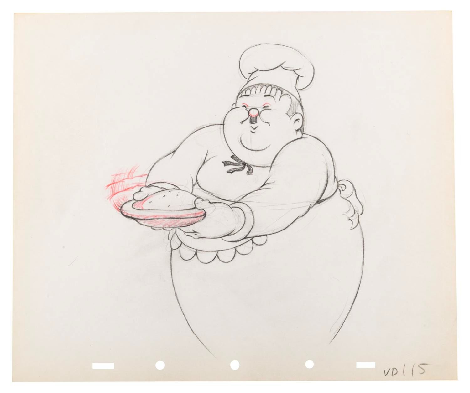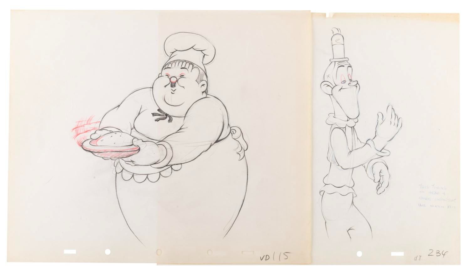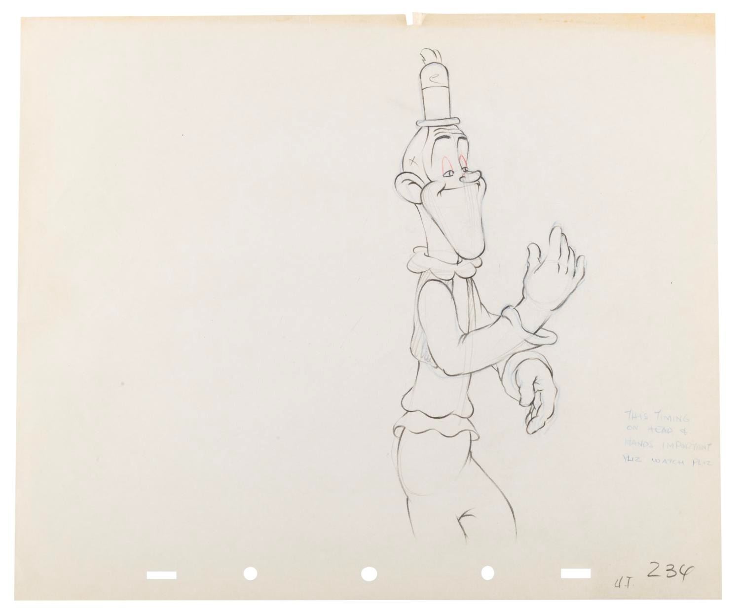 (Disney, 1938) A pair of original production drawings of Laurel and Hardy in the Simple Simon the Pieman scene from the Silly Symphony short "Mother Goose Goes Hollywood. " Laurel and Hardy have image sizes of 3.5 " x 8.5 " and 7 " x 8.5 " on untrimmed 10 " x 12 " animation paper. The graphite and color pencil drawings are in very good condition with light creasing, edge wear, discoloration and a small tear to the upper edge of Laurel's drawing.