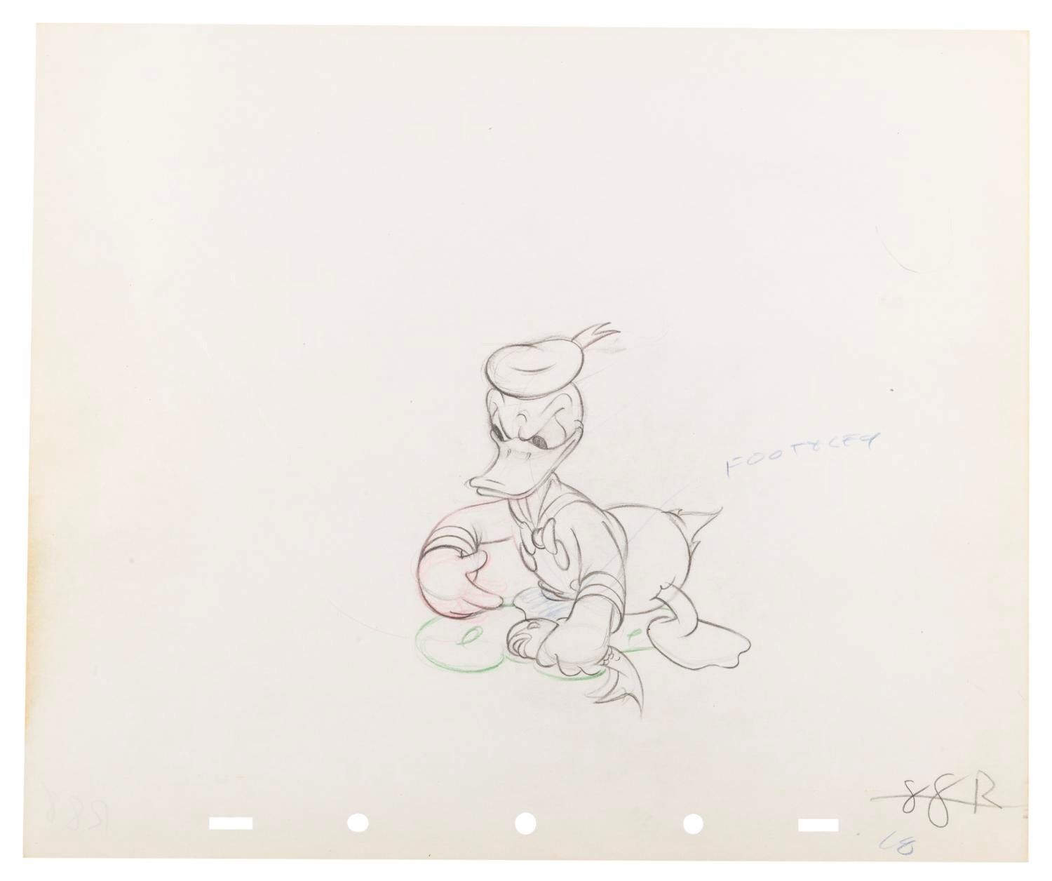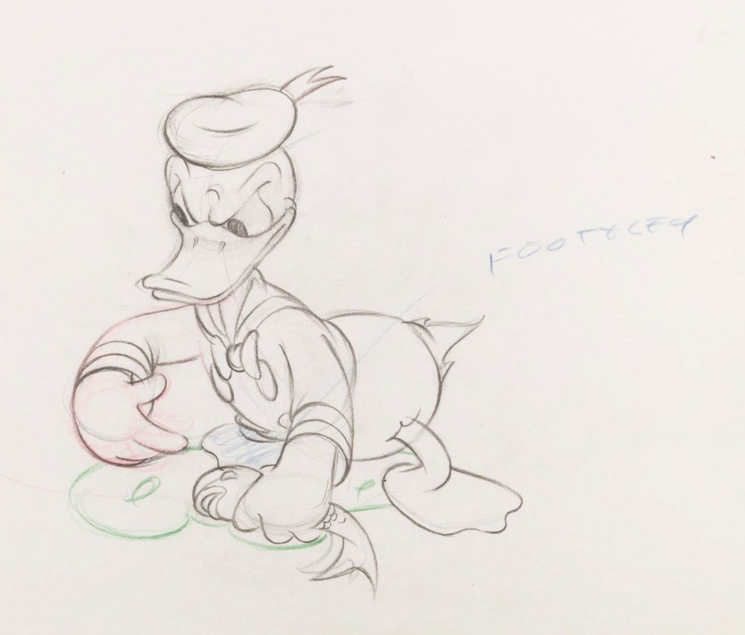 (Disney, 1939) An original production drawing of Donald Duck in "Donald's Penguin. " Donald has an image size of 4 " x 4.75 " on untrimmed 10 " x 12 " animation paper. The graphite and color pencil drawing is in very good condition with light creasing and discoloration.
