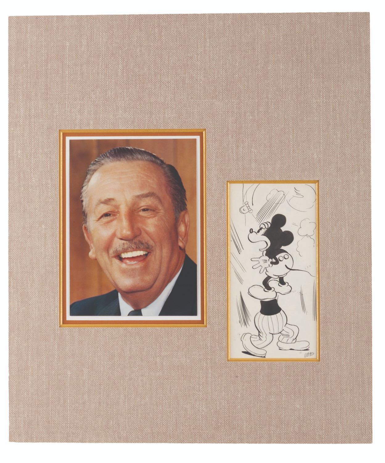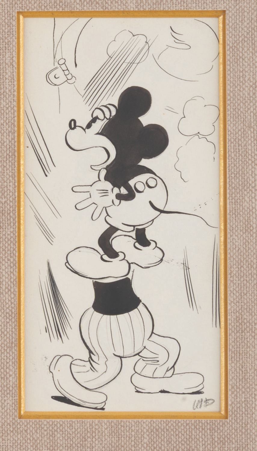 (Disney, 1930s/1968) An inker's drawing of Mickey Mouse, doodled on a paper used to test ink lines during drawing. The drawing is matted together with a program for the First Day of Issue of the commemorative Walt Disney stamp in 1968. The 3.5 " x 7 " drawing and 6.5 " x 9.5 " program are both in very good condition.
