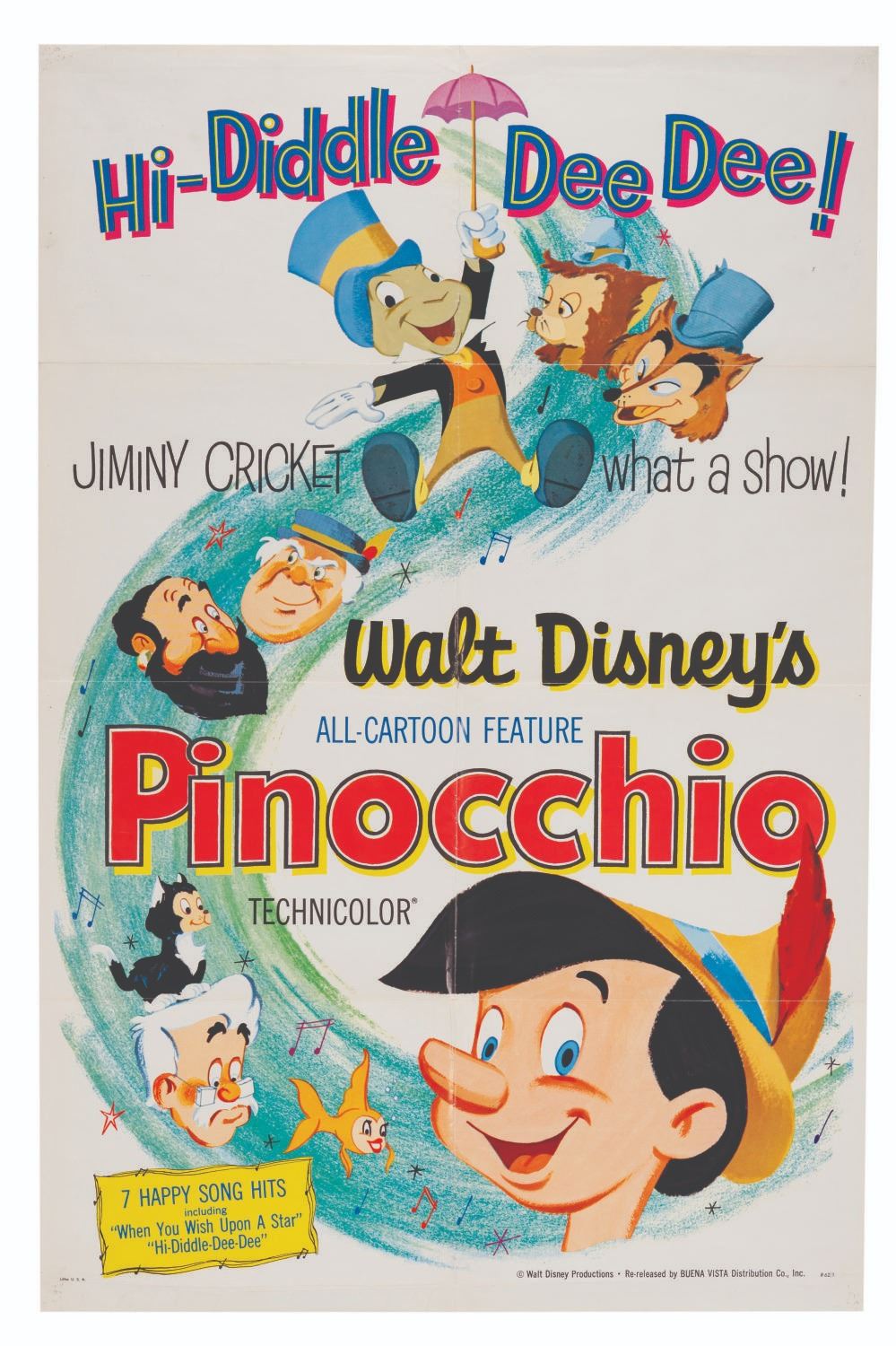 (Disney, 1962) A colorful one-sheet poster for the 1962 re-release of the animated classic, "Pinocchio, " originally released in 1940. Measuring 27 " x 41 ", the poster displays in good condition with pinholes at the corners, wear along original fold lines, slight separation at center fold points and edges, and a 1 " tear and small creases in the bottom edge.